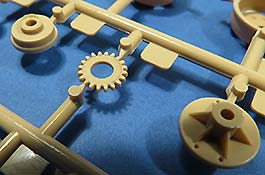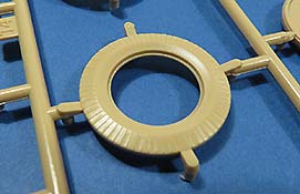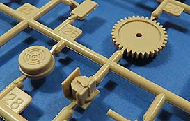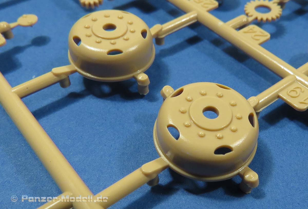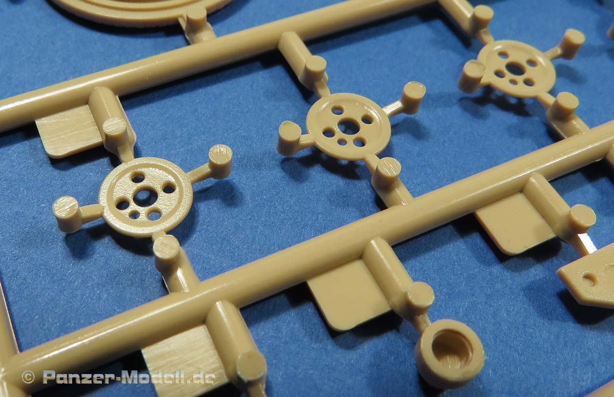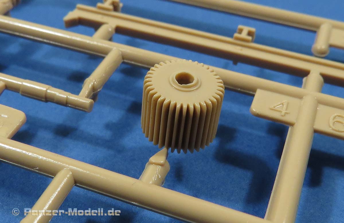 Die Räder sind in diesem Fall aus Spritzguss und setzen sich aus je drei Scheiben zusammen. Der Vorteil ist, dass man sich nicht um brüchig werdende Vinylreifen sorgen muss. Dafür ist die Detaillierung nur ok - das Profil sieht ganz gut aus, aber es gibt keinerlei Seitenaufdrucke ...