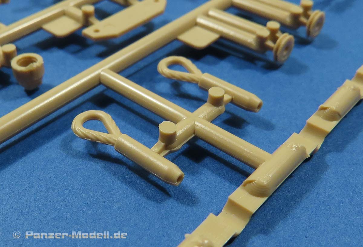 Als kleines Gimmick hat Amusing Hobby dem Bausatz einen Metallring und Kauschen spendiert um 4 Stahlseile als Hebegeschirr darzustellen, das (wie Originalfotos auf dem Karton zeigen) zum Heben von Tigertürmen verwendet wurde.
