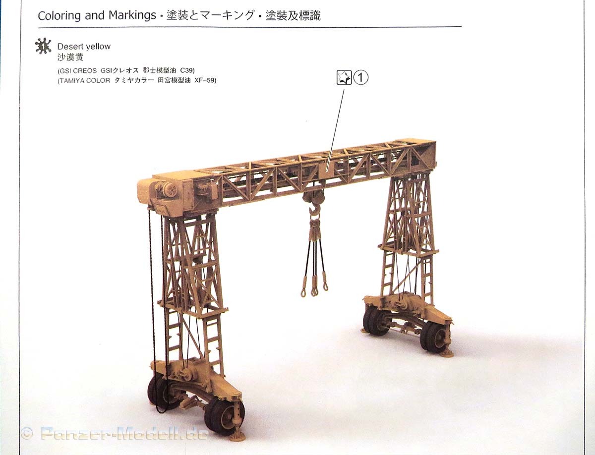 Am Ende der Bauanleitung gibt es nur ein Farbfoto des gebauten Modells in einfarbig dunkelgelb und der Markierung wo das Kranschilddecal anzubringen ist - dies ist ein wichtiges, augenfälliges Detail.