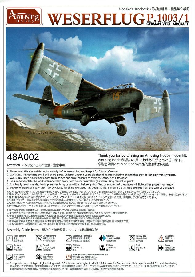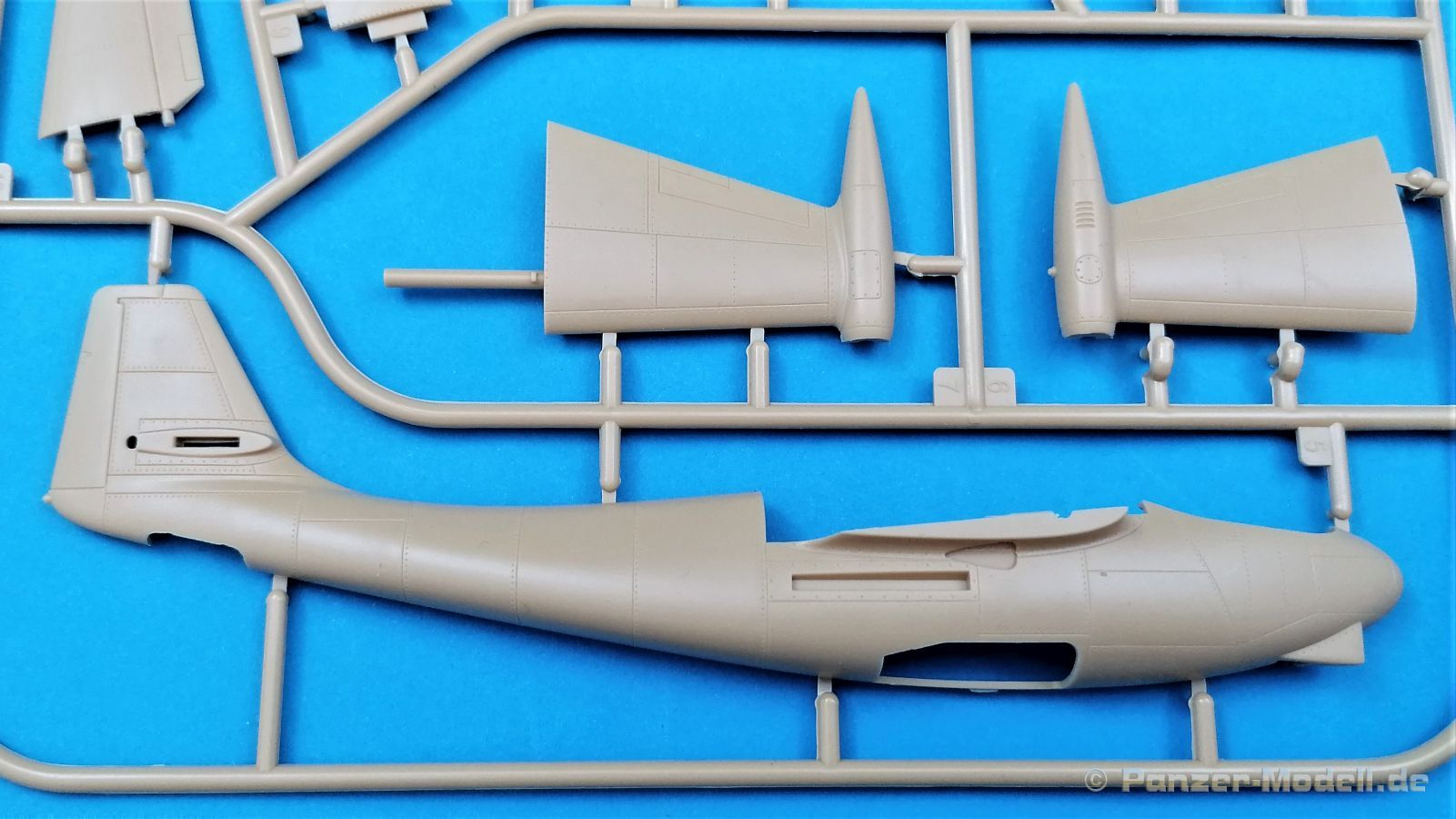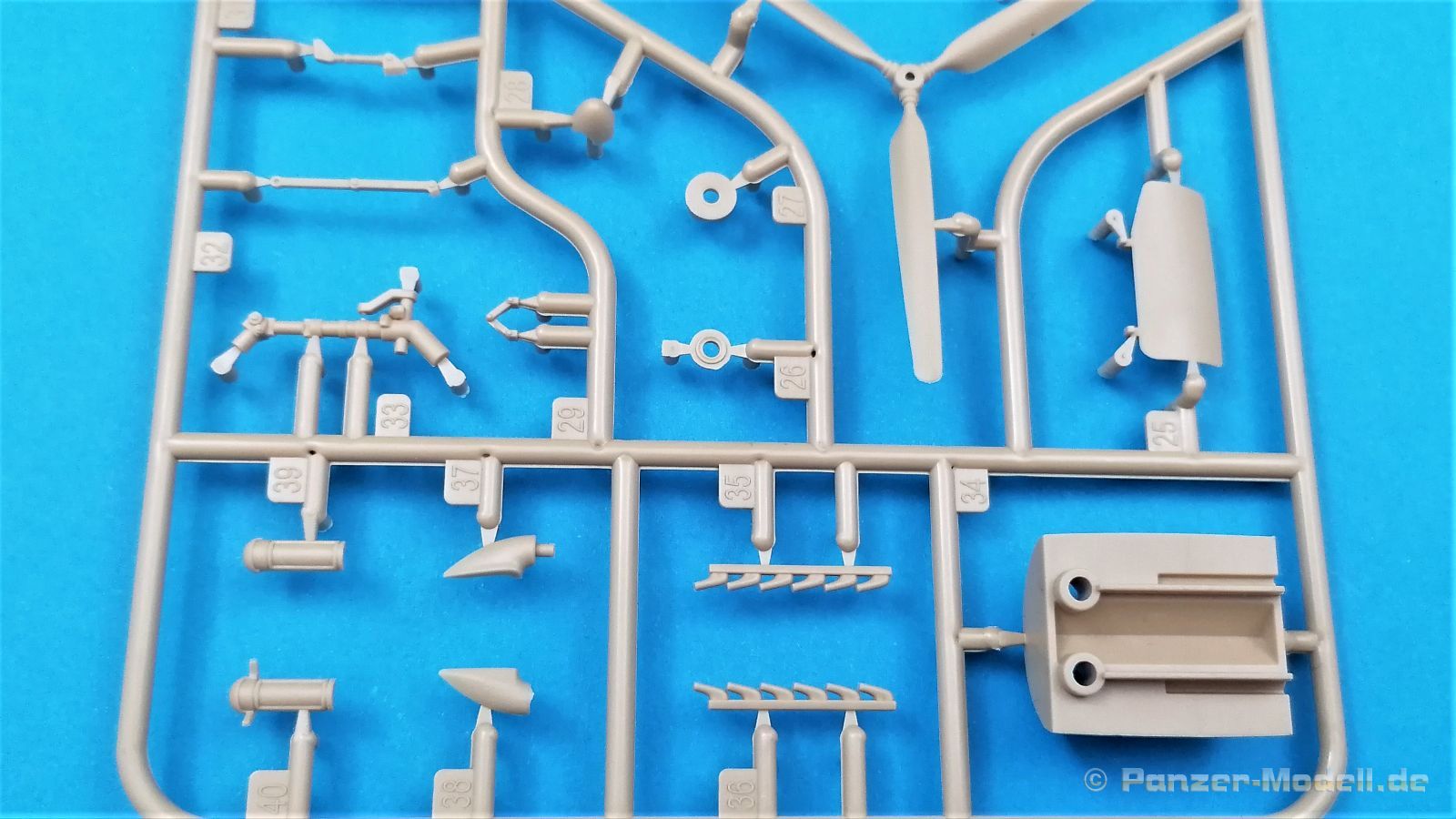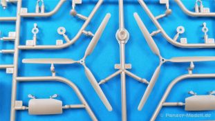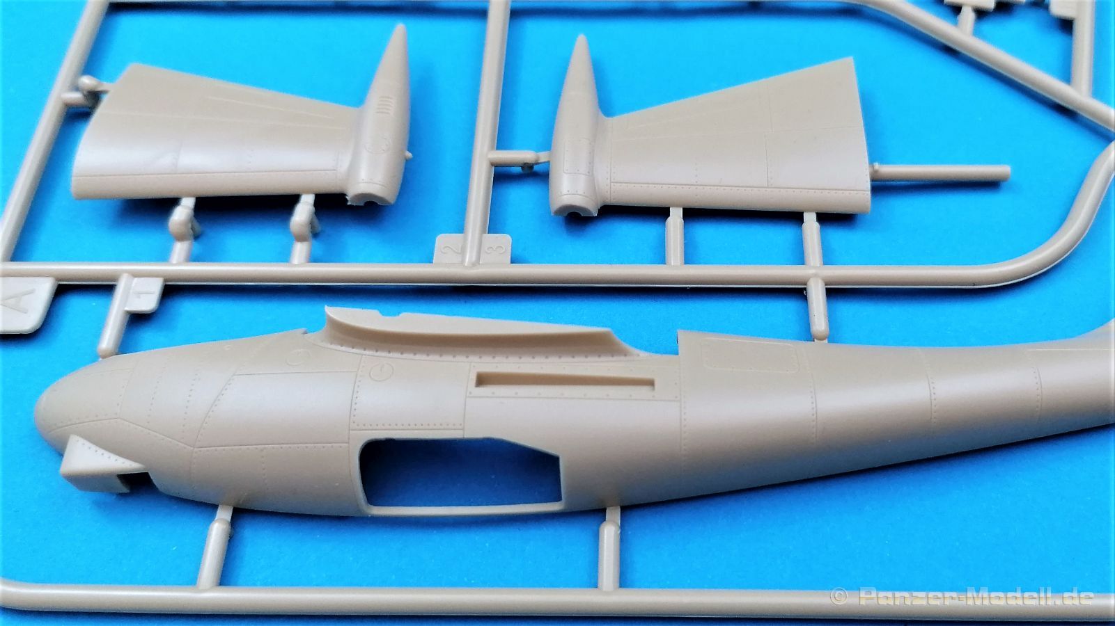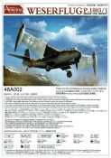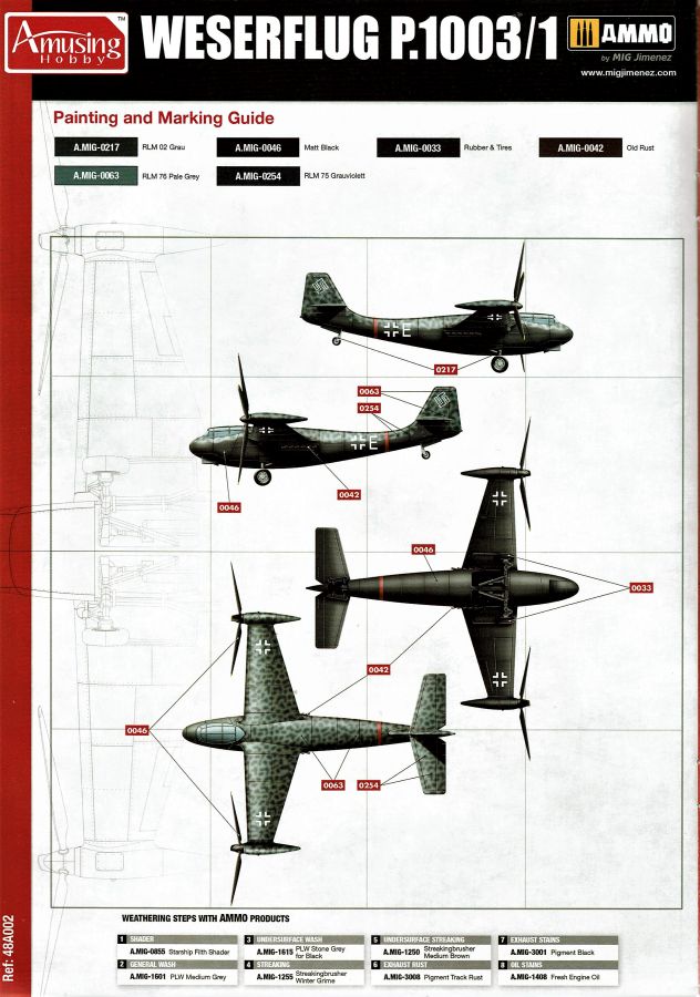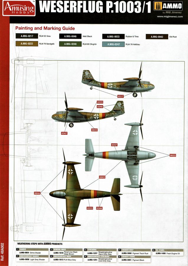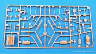 Der Projekt-Vorentwurf stammt bereits aus dem Jahr 1938. Geplant war ein Flugschrauber mit schwenkbaren Schrauben von 4m Durchmesser, die bei Start und Landung vertikal und nach Erreichen der Flughöhe horizontal arbeiten sollten. Das errechnete Fluggewicht sollte bei rund 2.000 kg liegen und als Antrieb war wahrscheinlich ein Reihenmotor von 900 PS (DM 600?) vorgesehen, der hinter der Kabine angeordnet war. Der Schacht für die Kühlluftzufuhr befand sich unter der Rumpfnase. Die errechnete Höchstgeschindigkeit sollte ca. 650 km/h pro Stunde betragen. Die Spannweite mit Luftschrauben lag bei 11 m, die Länge bei 8 m und die Rumpfbreite bei 1,15 m. Ãber eine (geplante) Bewaffnung habe ich nichts in Erfahrung gebracht. Lediglich ein Modell dieses Senkrechtstarters wurde gebaut. Man kann dieses Projekt von Weserflug durchaus als den ersten Entwurf eines Flugschraubers oder Senkrechtstarters bezeichnen. Dieser wurde damals in Deutschland aber nie aufgegriffen. Erst später wurde in den USA und der UdSSR diese Idee weiterentwickelt. Zumindest als Modell kann man sich dieses Flugzeug, nach dem Fw Triebflügler der zweite Streich von Amusing Hobby, in die Vitrine stellen. Sehen wir uns alles mal genauer an. In dem mit einem tollen Deckelbild versehenen Stülpkarton finden wir ânurâ zwei sandfarbene Spritzlinge, ein Klarsichtteil und den Decalbogen. Allerdings ist die überschaubare Teileanzahl vollkommen ausreichend. Der Guss der Bauteile ist wirklich gut. Keine Auswerferstellen, kein Versatz, keine unnötigen Grate, lediglich ein paar minimale Fischhäute. Der größere Rahmen beherbergt alle Komponenten für den Bau des Rumpfes und der Flügelsektionen. Auffallend ist die Tatsache das diese Teile feinste Gravuren besitzen. Auch Nietenreihen sind sehr schön gesetzt. Meiner Meinung hätten diese aber etwas prägnanter sein können. Gut, spätestens bei der Lackierung dürfte sich das evtl. bemerkbar machen oder man graviert im Vorfeld nach. Jedenfalls sieht das sehr gut aus. Die äußeren Flügelsektionen können beweglich gebaut werden. Somit ist die Darstellung beim Start oder im Flug möglich. Im kleineren Rahmen finden wir alle restlichen Teile für die Komplettierung des Flugschraubers. Das Cockpit erscheint etwas sehr spartanisch zu sein. Das Führergerätebrett zeigt einige Instrumente in erhabener Form während die Seitenkonsolen einer Nachbearbeitung bedürfen. Gut einsehbar ist das Cockpit durch die schlierenfreie Kanzel. Das bleibt aber jedem selbst überlassen. Unter die rechte Tragfläche kommt noch ein Luftfilter für den Motor, ähnlich den Tropenfiltern. Die Radschächte weisen innen bereits einige Details auf, die aber noch verfeinert werden können. Auch die Fahrwerksstreben machen einen guten Eindruck. Die Räder besitzen leider kein Profil. Allerdings sollte sich dieser Umstand bei der Größe nicht bemerkbar machen. Zu ergänzen wären wie üblich die Bremsleitungen. Die Propeller sind sehr gut umgesetzt und schon im richtigen Winkel gespritzt. Sieht sehr gut aus. Schön wäre noch die Beigabe von geätzten Sicherheitsgurten gewesen. Die Bauanleitung führt uns in 7(!) Schritten zum Ziel. Alles übersichtlich und klar strukturiert. Auf den letzten Seiten der Bauanleitung werden uns drei Bemalungs- und Markierungsvorschläge, jeweils in 4-Seitenansichten, vorgestellt. Diese sind aus dem Haus AMMO by MIG. Farbangaben aus dem gleichen Haus. Nette Idee auch die Weathering Steps unter den Profilen. Auf Einheiten wird nicht eingegangen und wäre nur spekulativ.