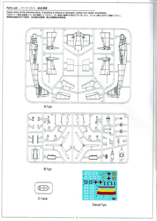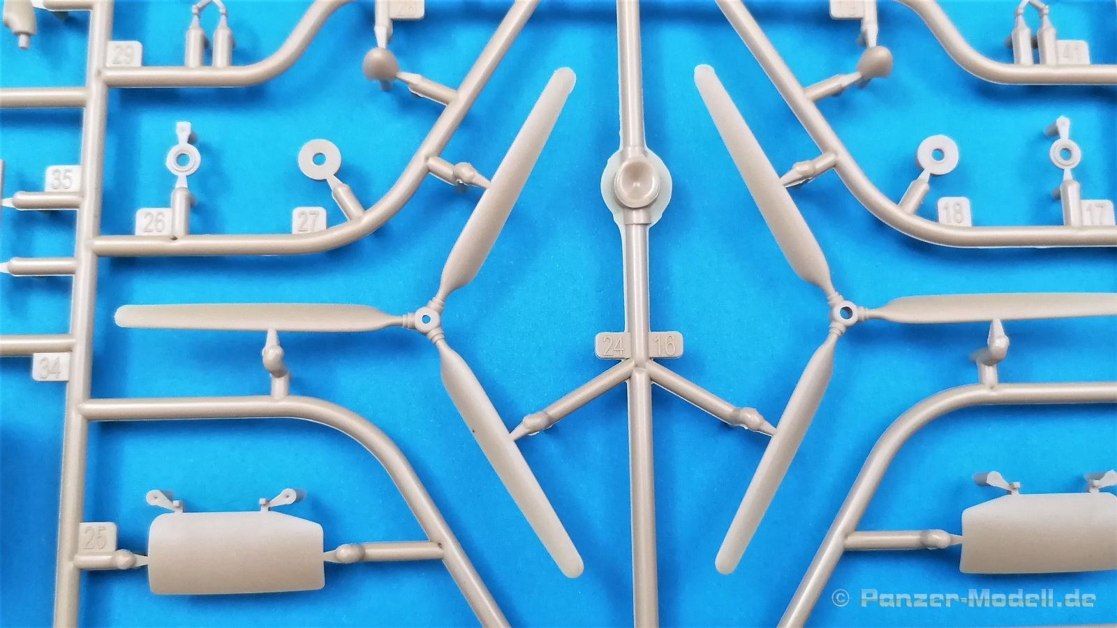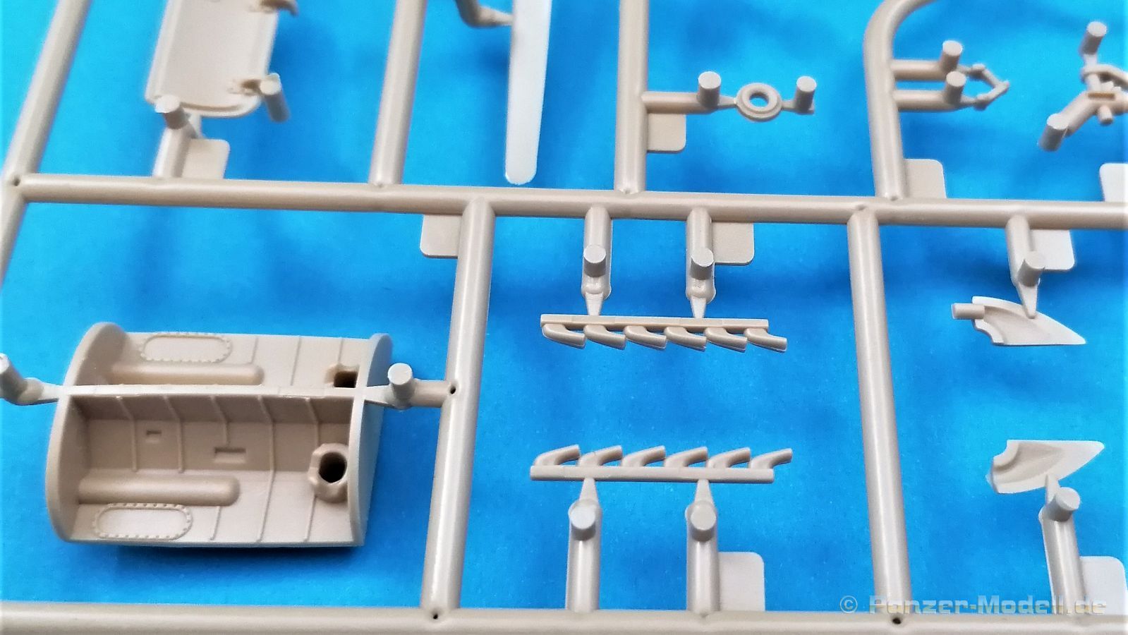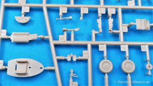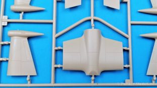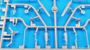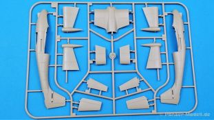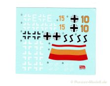 Auf dem Decalbogen sind alle Abzeichen für die Varianten enthalten. Der Druck ist matt und im Register. Ein interssantes Modell, das bereits aus dem Kasten gebaut und sorgfältig bemalt zum Eyecatcher wird. Spezialisten werden noch Verbesserungen vornehmen, vor allem im Cockpitbereich und in den Radschächten. Sehr empfehlenswerter Kit mit leichten Schwächen.