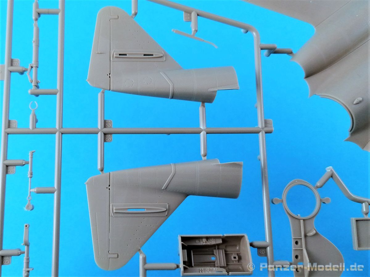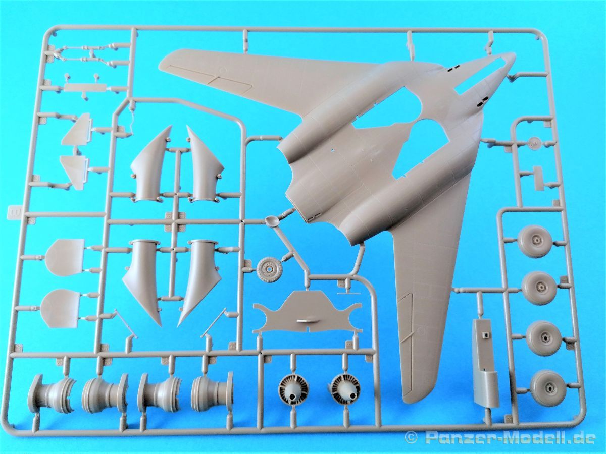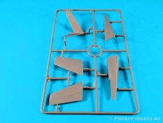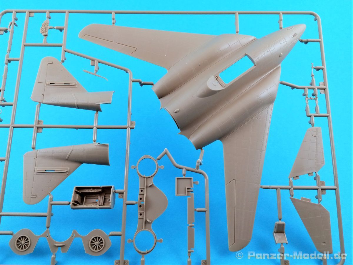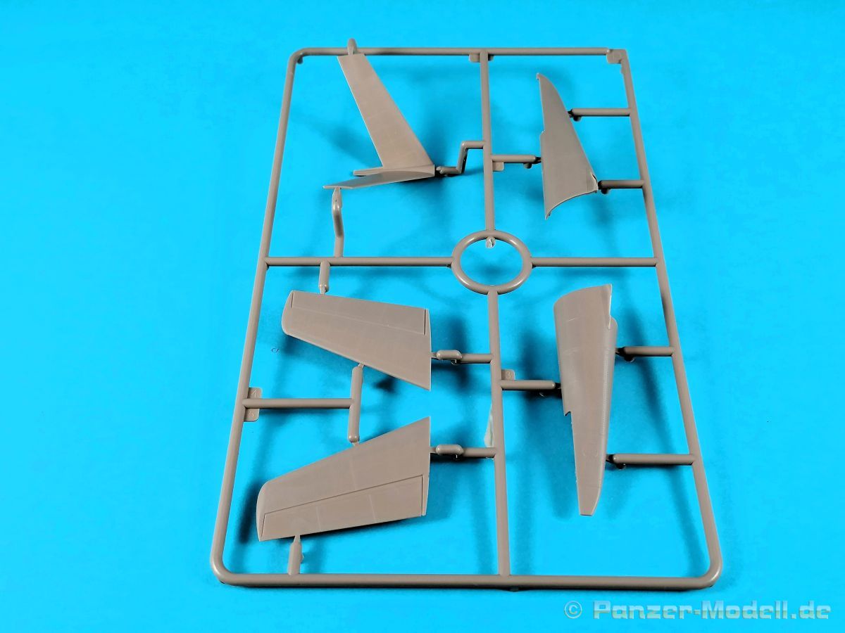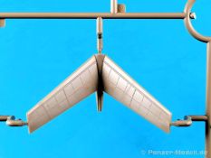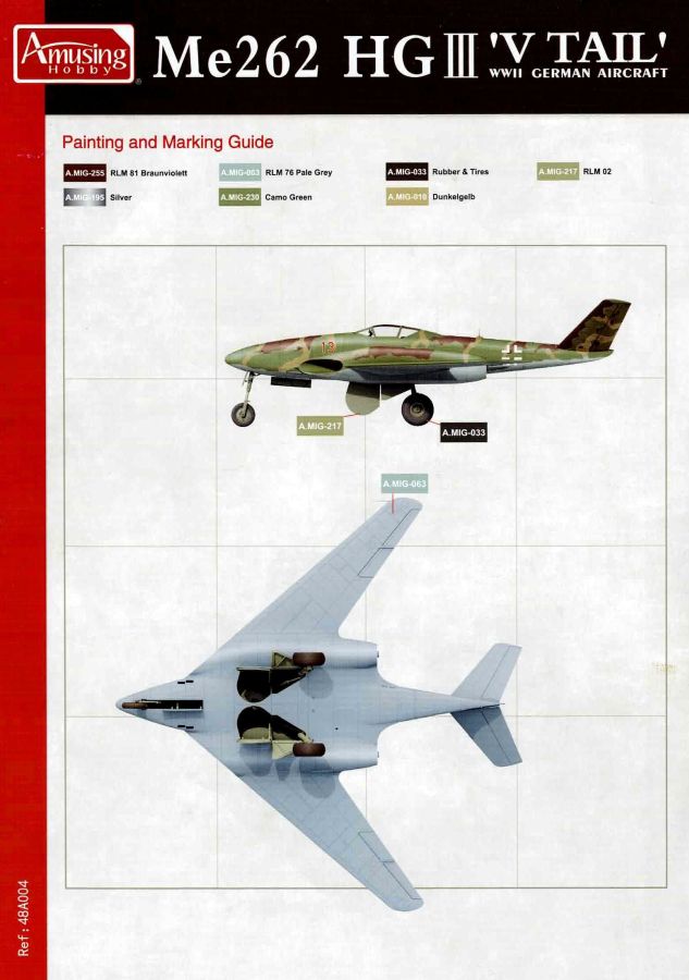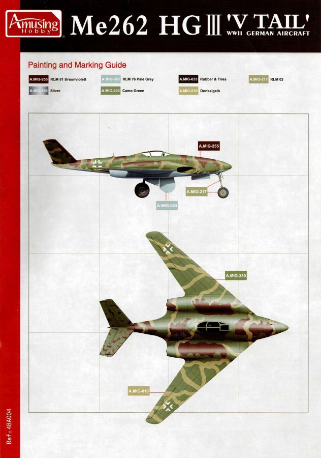 Die Entwurfs- und Entwicklungsabteilung von Messerschmitt beschäftigte sich mit neuen, innovativen Projekten sowie der Weiterentwicklung vorhandener Konstruktionen, so auch der Me 262. Um auf dem Gebiet des schallnahen Fluges voranzukommen und die Flugeigenschaften zu optimieren, wurde die Me 262 V9 als erste Stufe eines Hochgeschwindigkeits-Flugzeuges (HGI) mit flacher Kabinenhaube und gepfeiltem Höhenleitwerk sowie vergrößertem Seitenleitwerk ausgerüstet. Letzte Flüge erfolgten noch im März 1945. Ein weiterer Vorschlag für den HG III sollte ein V-Leitwerk erhalten bei dem die ursprüngliche Bauform im Großen und Ganzen beibehalten wurde. Nach dem Kriegsende wurden diese Projekte bzw. Entwürfe nicht mehr weitergeführt. Zumindest als Modell kann man sich dieses Flugzeug mit V-Leitwerk in die Vitrine stellen. Sehen wir mal genauer hin… In dem mit einem tollen Deckelbild versehenen Stülpkarton (schon das löst einen Kaufreflex aus!) finden wir drei sandfarbene Spritzlinge, ein Klarsichtteil und den Decalbogen. Vorhanden sind die zwei bekannten Spritzlinge (A und B) aus dem Bausatz der Me 262 HG III sowie ein neuer Spritzling (D) mit den Teilen für das Heck mit dem neuen Leitwerk. Der Guss der Bauteile ist auf den ersten Blick wirklich gut. Kein Versatz, keine unnötigen Grate, lediglich ein paar minimale Fischhäute. Auswerferfahnen sind einige vorhanden, aber alle im nicht sichtbaren Bereich und schnell zu entfernen. Etwas überraschend ist die relativ geringe Anzahl der Bauteile. Aber das ist relativ zu sehen. Den größten Teil der Rahmen nehmen Ober- und Unterseite mit den angegossenen Flügeln ein. Der Rest beherbergt Teile des Cockpits und des Fahrwerks und weiteren Kleinkram… Ganz toll umgesetzt sind der Rumpf und die Tragflächen. Diese weisen unzählige fein strukturierte Nieten und viele Panellines auf. Von Vorteil gerät auch die Tatsache das der Rumpf, bis auf das Heckteil, horizontal geteilt ist. Diese Tatsache müsste den Bau wesentlich erleichtern. Die Panellines hätten meiner Meinung nach etwas prägnanter ausfallen können denn hier besteht die Gefahr bei einer Lackierung mit dem Pinsel diese Details zuzusetzen. Für die Lackierung sollte also eine Airbrush bevorzugt werden. Steuer- und Ruderflächen sind allerdings alle mit angegossen und nicht einzeln beiliegend. Das stört aber keineswegs. Das Cockpit, das in die obere Rumphälfte eingesetzt wird ist ausreichend bestückt und kommt in der Gesamtheit der Kanzel einer Me 262 sehr nahe. Ergänzen sollte man auf jeden Fall die Sicherheitsgurte. Schade das diese nicht, wie mittlerweile bei vielen anderen Kits, beiliegen. Fehlanzeige auch bei einem Decal für das/die Führergerätebrett/er. Der Pinsel wird es schon richten… Und damit kann man schon sehr viel herausholen. Vermisst habe ich allerdings den Panzerschutz hinter dem Kopf des Piloten. Selbstbau ist u.U. angesagt. Aufbohren sollte man eventuell die geschlossenen Öffnungen für die vier 30mm MK 108. Dieser Umstand ist dem Formenbau geschuldet und sollte leicht zu beheben sein. Die Triebwerkssektionen mit den Jumo 005 besteht aus relativ wenigen, aber schön detaillierten Bauteilen. Diese finden ihren Platz im unteren Rumpf. Bevor man die Rumpfhälften zusammenbaut sollte man sein Augenmerk auch auf das Gewicht im Rumpfbug richten. Leider gibt die Anleitung keinen Gewichtsangabe vor. Probieren ist angesagt. Nichts ist ärgerlicher als wenn man am Ende einen “Tailsitter” hat. Die Radschächte weisen innen bereits einige Details auf, die aber in Eigenregie noch verfeinert werden können. Auch die Fahrwerksstreben machen einen sehr guten Eindruck obwohl sie im Detail etwas schärfer sein könnten. Die Räder besitzen ein ausreichend reproduziertes Profil, sind aber nicht belasted dargestellt. Zu ergänzen wären wie üblich die Bremsleitungen. Auf den Abdeckungen der Radschächte finden sich ein paar Auswerfermarken. Diese sind aber leicht zu beheben. Überzeugen kann auch die flache Kabinenhaube (Rennhaube J) die klar und schlierenfrei ist. Die Bauanleitung führt uns in nur acht Schritten zum Ziel. Alles übersichtlich und klar strukturiert. Fragen sollten keine auftauchen. Nur mit näheren Farbangaben wurde gespart. Während auf der ersten Seite neben dem Bild des Jägers noch diverse Hinweise etc. zu verzeichnen sind ist auf der zweiten Seite der Raum für die Darstellung der Spritzlinge und der Decals. Auf den letzten Seiten der Bauanleitung werden uns zwei fiktive Bemalungs- und Markierungsvorschläge, jeweils in drei Ansichten, vorgestellt. Diese stammen von AMMO by MIG. Farbangaben aus dem gleichen Haus. Auf Einheiten wird nicht eingegangen und wären sowieso rein spekulativ. In der Cockpitsektion dominierte RLM 66 (Schwarzgrau) mit etwas RLM 02 (Grau). Im Rumpfinneren sowie an den Fahrwerksstreben kam in erster Linie RLM 02 zum Einsatz. Und keine Regel ohne Ausnahme… Im Rumpfinnenbereich wurde häufig das Material nicht behandelt sondern in seinem originalen Zustand (blank!, z.B. naturmetall) belassen. Auf dem Decalbogen sind alle Abzeichen für die beiden Varianten enthalten. Der Druck ist matt und im Register. Wartungshinweise glänzen leider durch Abwesenheit. Da ist wieder mal der Fundus gefragt. Ein interessantes Modell, das bereits aus dem Kasten gebaut und sorgfältig bemalt zum Eyecatcher wird. Spezialisten werden noch Verbesserungen vornehmen, vor allem im Cockpitbereich und in den Radschächten. Für die Lackierung (Zeitraum 45 ++) ist etwas Recherche anzuraten. Sehr empfehlenswerter Kit mit ganz leichten Schwächen.