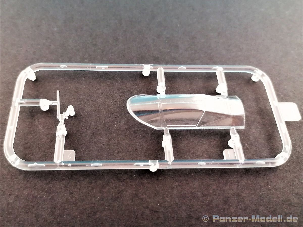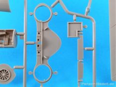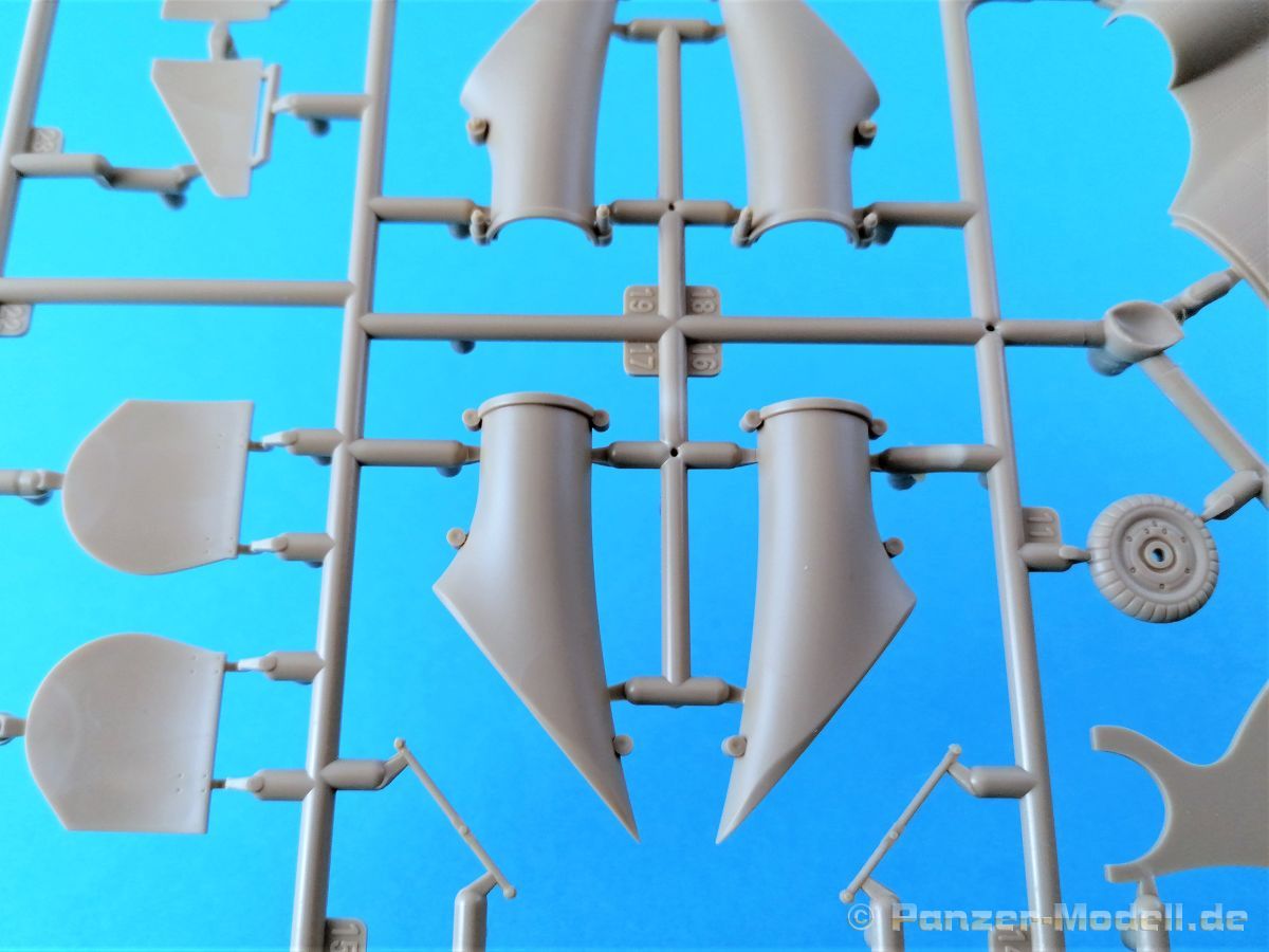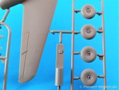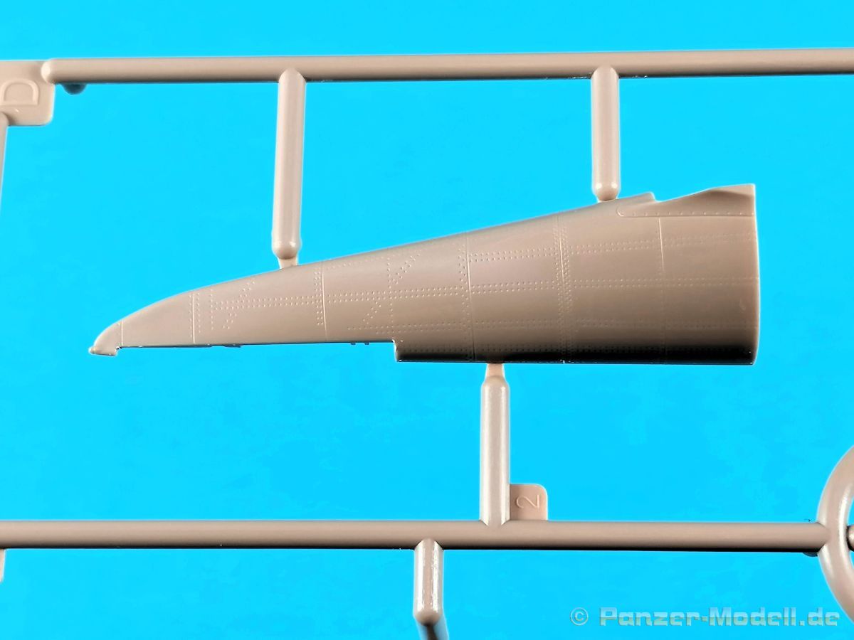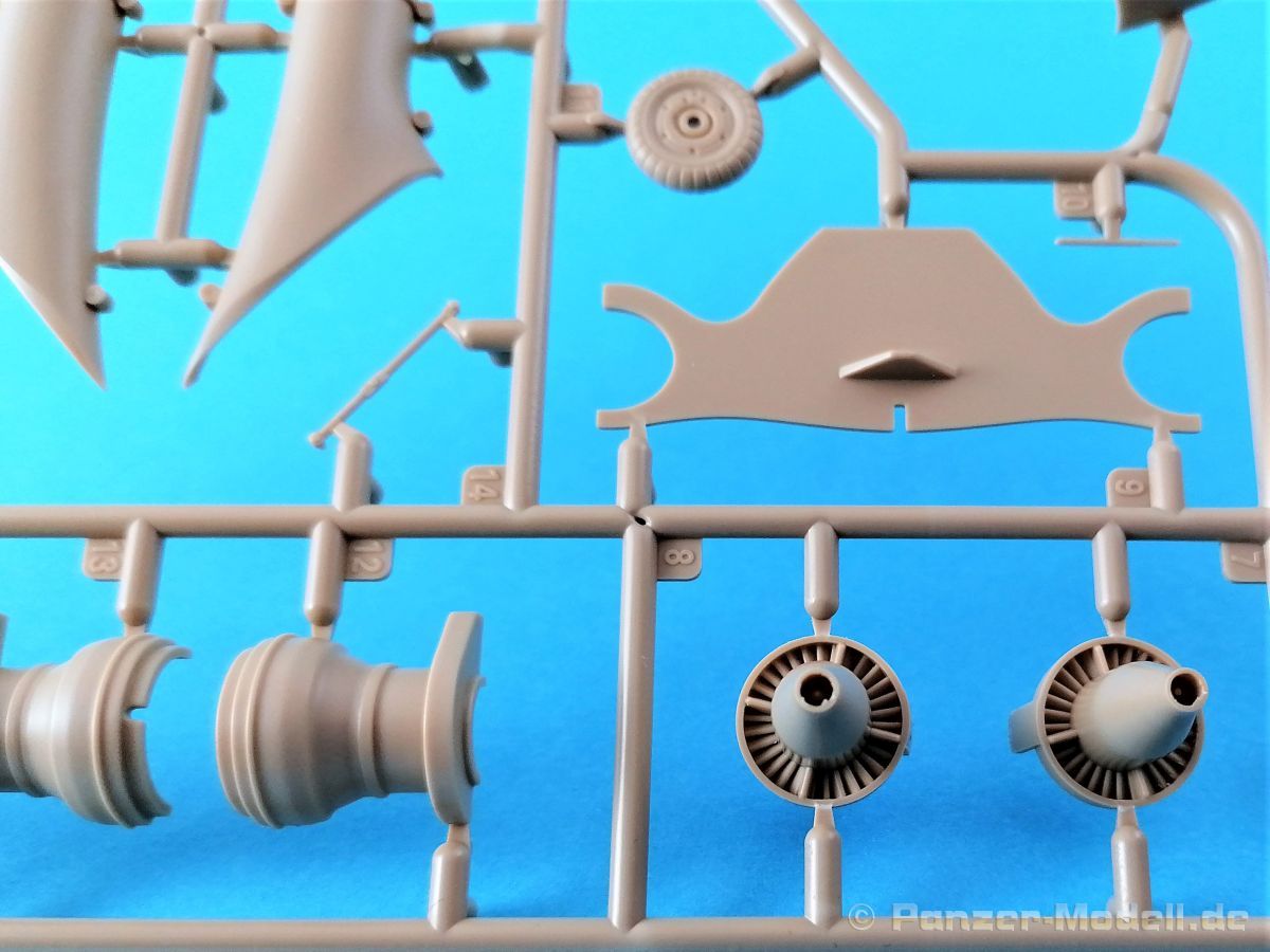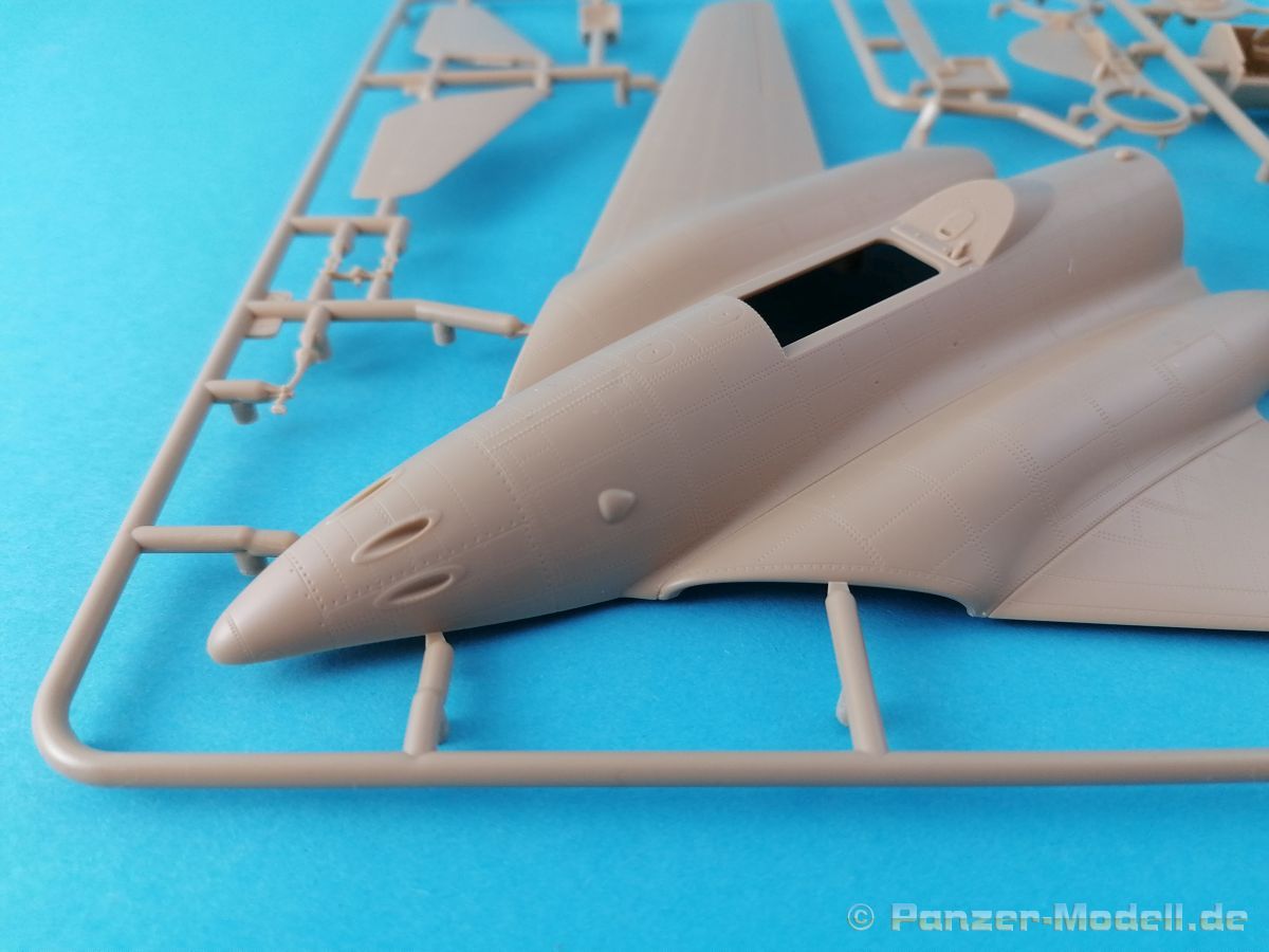 Die Entwurfs- und Entwicklungsabteilung von Messerschmitt beschäftigte sich mit neuen, innovativen Projekten sowie der Weiterentwicklung vorhandener Konstruktionen, so auch der Me 262. Um auf dem Gebiet des schallnahen Fluges voranzukommen und die Flugeigenschaften zu optimieren, wurde die Me 262 V9 als erste Stufe eines Hochgeschwindigkeits-Flugzeuges (HGI) mit flacher Kabinenhaube und gepfeiltem Höhenleitwerk sowie vergrößertem Seitenleitwerk ausgerüstet. Letzte Flüge erfolgten noch im März 1945. Ein weiterer Vorschlag für den HG III sollte ein V-Leitwerk erhalten bei dem die ursprüngliche Bauform im Großen und Ganzen beibehalten wurde. Nach dem Kriegsende wurden diese Projekte bzw. Entwürfe nicht mehr weitergeführt. Zumindest als Modell kann man sich dieses Flugzeug mit V-Leitwerk in die Vitrine stellen. Sehen wir mal genauer hin… In dem mit einem tollen Deckelbild versehenen Stülpkarton (schon das löst einen Kaufreflex aus!) finden wir drei sandfarbene Spritzlinge, ein Klarsichtteil und den Decalbogen. Vorhanden sind die zwei bekannten Spritzlinge (A und B) aus dem Bausatz der Me 262 HG III sowie ein neuer Spritzling (D) mit den Teilen für das Heck mit dem neuen Leitwerk. Der Guss der Bauteile ist auf den ersten Blick wirklich gut. Kein Versatz, keine unnötigen Grate, lediglich ein paar minimale Fischhäute. Auswerferfahnen sind einige vorhanden, aber alle im nicht sichtbaren Bereich und schnell zu entfernen. Etwas überraschend ist die relativ geringe Anzahl der Bauteile. Aber das ist relativ zu sehen. Den größten Teil der Rahmen nehmen Ober- und Unterseite mit den angegossenen Flügeln ein. Der Rest beherbergt Teile des Cockpits und des Fahrwerks und weiteren Kleinkram… Ganz toll umgesetzt sind der Rumpf und die Tragflächen. Diese weisen unzählige fein strukturierte Nieten und viele Panellines auf. Von Vorteil gerät auch die Tatsache das der Rumpf, bis auf das Heckteil, horizontal geteilt ist. Diese Tatsache müsste den Bau wesentlich erleichtern. Die Panellines hätten meiner Meinung nach etwas prägnanter ausfallen können denn hier besteht die Gefahr bei einer Lackierung mit dem Pinsel diese Details zuzusetzen. Für die Lackierung sollte also eine Airbrush bevorzugt werden. Steuer- und Ruderflächen sind allerdings alle mit angegossen und nicht einzeln beiliegend. Das stört aber keineswegs. Das Cockpit, das in die obere Rumphälfte eingesetzt wird ist ausreichend bestückt und kommt in der Gesamtheit der Kanzel einer Me 262 sehr nahe. Ergänzen sollte man auf jeden Fall die Sicherheitsgurte. Schade das diese nicht, wie mittlerweile bei vielen anderen Kits, beiliegen. Fehlanzeige auch bei einem Decal für das/die Führergerätebrett/er. Der Pinsel wird es schon richten… Und damit kann man schon sehr viel herausholen. Vermisst habe ich allerdings den Panzerschutz hinter dem Kopf des Piloten. Selbstbau ist u.U. angesagt. Aufbohren sollte man eventuell die geschlossenen Öffnungen für die vier 30mm MK 108. Dieser Umstand ist dem Formenbau geschuldet und sollte leicht zu beheben sein. Die Triebwerkssektionen mit den Jumo 005 besteht aus relativ wenigen, aber schön detaillierten Bauteilen. Diese finden ihren Platz im unteren Rumpf. Bevor man die Rumpfhälften zusammenbaut sollte man sein Augenmerk auch auf das Gewicht im Rumpfbug richten. Leider gibt die Anleitung keinen Gewichtsangabe vor. Probieren ist angesagt. Nichts ist ärgerlicher als wenn man am Ende einen “Tailsitter” hat. Die Radschächte weisen innen bereits einige Details auf, die aber in Eigenregie noch verfeinert werden können. Auch die Fahrwerksstreben machen einen sehr guten Eindruck obwohl sie im Detail etwas schärfer sein könnten. Die Räder besitzen ein ausreichend reproduziertes Profil, sind aber nicht belasted dargestellt. Zu ergänzen wären wie üblich die Bremsleitungen. Auf den Abdeckungen der Radschächte finden sich ein paar Auswerfermarken. Diese sind aber leicht zu beheben. Überzeugen kann auch die flache Kabinenhaube (Rennhaube J) die klar und schlierenfrei ist. Die Bauanleitung führt uns in nur acht Schritten zum Ziel. Alles übersichtlich und klar strukturiert. Fragen sollten keine auftauchen. Nur mit näheren Farbangaben wurde gespart. Während auf der ersten Seite neben dem Bild des Jägers noch diverse Hinweise etc. zu verzeichnen sind ist auf der zweiten Seite der Raum für die Darstellung der Spritzlinge und der Decals. Auf den letzten Seiten der Bauanleitung werden uns zwei fiktive Bemalungs- und Markierungsvorschläge, jeweils in drei Ansichten, vorgestellt. Diese stammen von AMMO by MIG. Farbangaben aus dem gleichen Haus. Auf Einheiten wird nicht eingegangen und wären sowieso rein spekulativ. In der Cockpitsektion dominierte RLM 66 (Schwarzgrau) mit etwas RLM 02 (Grau). Im Rumpfinneren sowie an den Fahrwerksstreben kam in erster Linie RLM 02 zum Einsatz. Und keine Regel ohne Ausnahme… Im Rumpfinnenbereich wurde häufig das Material nicht behandelt sondern in seinem originalen Zustand (blank!, z.B. naturmetall) belassen. Auf dem Decalbogen sind alle Abzeichen für die beiden Varianten enthalten. Der Druck ist matt und im Register. Wartungshinweise glänzen leider durch Abwesenheit. Da ist wieder mal der Fundus gefragt. Ein interessantes Modell, das bereits aus dem Kasten gebaut und sorgfältig bemalt zum Eyecatcher wird. Spezialisten werden noch Verbesserungen vornehmen, vor allem im Cockpitbereich und in den Radschächten. Für die Lackierung (Zeitraum 45 ++) ist etwas Recherche anzuraten. Sehr empfehlenswerter Kit mit ganz leichten Schwächen.