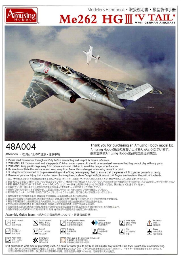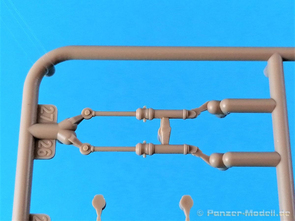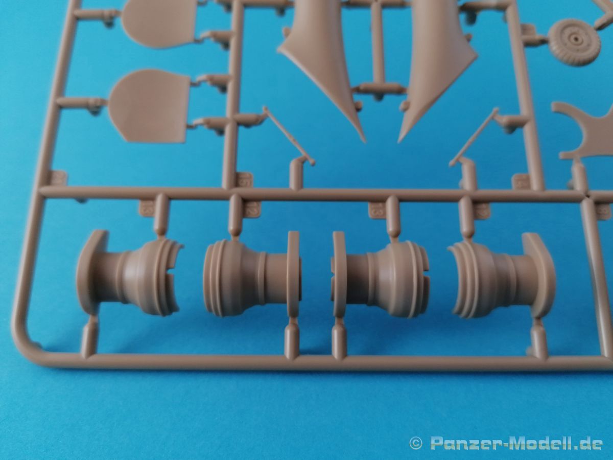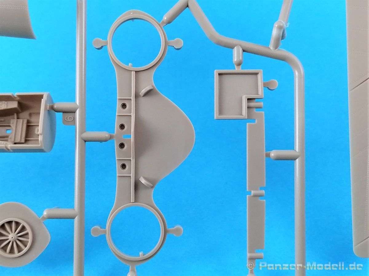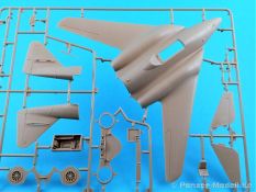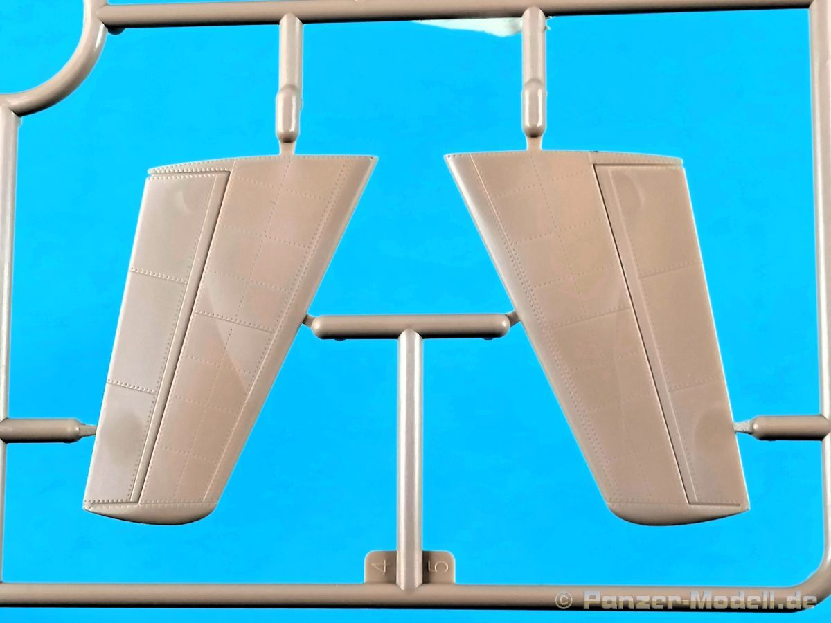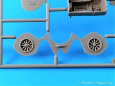 Die Entwurfs- und Entwicklungsabteilung von Messerschmitt beschäftigte sich mit neuen, innovativen Projekten sowie der Weiterentwicklung vorhandener Konstruktionen, so auch der Me 262. Um auf dem Gebiet des schallnahen Fluges voranzukommen und die Flugeigenschaften zu optimieren, wurde die Me 262 V9 als erste Stufe eines Hochgeschwindigkeits-Flugzeuges (HGI) mit flacher Kabinenhaube und gepfeiltem Höhenleitwerk sowie vergrößertem Seitenleitwerk ausgerüstet. Letzte Flüge erfolgten noch im März 1945. Ein weiterer Vorschlag für den HG III sollte ein V-Leitwerk erhalten bei dem die ursprüngliche Bauform im Großen und Ganzen beibehalten wurde. Nach dem Kriegsende wurden diese Projekte bzw. Entwürfe nicht mehr weitergeführt. Zumindest als Modell kann man sich dieses Flugzeug mit V-Leitwerk in die Vitrine stellen. Sehen wir mal genauer hin… In dem mit einem tollen Deckelbild versehenen Stülpkarton (schon das löst einen Kaufreflex aus!) finden wir drei sandfarbene Spritzlinge, ein Klarsichtteil und den Decalbogen. Vorhanden sind die zwei bekannten Spritzlinge (A und B) aus dem Bausatz der Me 262 HG III sowie ein neuer Spritzling (D) mit den Teilen für das Heck mit dem neuen Leitwerk. Der Guss der Bauteile ist auf den ersten Blick wirklich gut. Kein Versatz, keine unnötigen Grate, lediglich ein paar minimale Fischhäute. Auswerferfahnen sind einige vorhanden, aber alle im nicht sichtbaren Bereich und schnell zu entfernen. Etwas überraschend ist die relativ geringe Anzahl der Bauteile. Aber das ist relativ zu sehen. Den größten Teil der Rahmen nehmen Ober- und Unterseite mit den angegossenen Flügeln ein. Der Rest beherbergt Teile des Cockpits und des Fahrwerks und weiteren Kleinkram… Ganz toll umgesetzt sind der Rumpf und die Tragflächen. Diese weisen unzählige fein strukturierte Nieten und viele Panellines auf. Von Vorteil gerät auch die Tatsache das der Rumpf, bis auf das Heckteil, horizontal geteilt ist. Diese Tatsache müsste den Bau wesentlich erleichtern. Die Panellines hätten meiner Meinung nach etwas prägnanter ausfallen können denn hier besteht die Gefahr bei einer Lackierung mit dem Pinsel diese Details zuzusetzen. Für die Lackierung sollte also eine Airbrush bevorzugt werden. Steuer- und Ruderflächen sind allerdings alle mit angegossen und nicht einzeln beiliegend. Das stört aber keineswegs. Das Cockpit, das in die obere Rumphälfte eingesetzt wird ist ausreichend bestückt und kommt in der Gesamtheit der Kanzel einer Me 262 sehr nahe. Ergänzen sollte man auf jeden Fall die Sicherheitsgurte. Schade das diese nicht, wie mittlerweile bei vielen anderen Kits, beiliegen. Fehlanzeige auch bei einem Decal für das/die Führergerätebrett/er. Der Pinsel wird es schon richten… Und damit kann man schon sehr viel herausholen. Vermisst habe ich allerdings den Panzerschutz hinter dem Kopf des Piloten. Selbstbau ist u.U. angesagt. Aufbohren sollte man eventuell die geschlossenen Öffnungen für die vier 30mm MK 108. Dieser Umstand ist dem Formenbau geschuldet und sollte leicht zu beheben sein. Die Triebwerkssektionen mit den Jumo 005 besteht aus relativ wenigen, aber schön detaillierten Bauteilen. Diese finden ihren Platz im unteren Rumpf. Bevor man die Rumpfhälften zusammenbaut sollte man sein Augenmerk auch auf das Gewicht im Rumpfbug richten. Leider gibt die Anleitung keinen Gewichtsangabe vor. Probieren ist angesagt. Nichts ist ärgerlicher als wenn man am Ende einen “Tailsitter” hat. Die Radschächte weisen innen bereits einige Details auf, die aber in Eigenregie noch verfeinert werden können. Auch die Fahrwerksstreben machen einen sehr guten Eindruck obwohl sie im Detail etwas schärfer sein könnten. Die Räder besitzen ein ausreichend reproduziertes Profil, sind aber nicht belasted dargestellt. Zu ergänzen wären wie üblich die Bremsleitungen. Auf den Abdeckungen der Radschächte finden sich ein paar Auswerfermarken. Diese sind aber leicht zu beheben. Überzeugen kann auch die flache Kabinenhaube (Rennhaube J) die klar und schlierenfrei ist. Die Bauanleitung führt uns in nur acht Schritten zum Ziel. Alles übersichtlich und klar strukturiert. Fragen sollten keine auftauchen. Nur mit näheren Farbangaben wurde gespart. Während auf der ersten Seite neben dem Bild des Jägers noch diverse Hinweise etc. zu verzeichnen sind ist auf der zweiten Seite der Raum für die Darstellung der Spritzlinge und der Decals. Auf den letzten Seiten der Bauanleitung werden uns zwei fiktive Bemalungs- und Markierungsvorschläge, jeweils in drei Ansichten, vorgestellt. Diese stammen von AMMO by MIG. Farbangaben aus dem gleichen Haus. Auf Einheiten wird nicht eingegangen und wären sowieso rein spekulativ. In der Cockpitsektion dominierte RLM 66 (Schwarzgrau) mit etwas RLM 02 (Grau). Im Rumpfinneren sowie an den Fahrwerksstreben kam in erster Linie RLM 02 zum Einsatz. Und keine Regel ohne Ausnahme… Im Rumpfinnenbereich wurde häufig das Material nicht behandelt sondern in seinem originalen Zustand (blank!, z.B. naturmetall) belassen. Auf dem Decalbogen sind alle Abzeichen für die beiden Varianten enthalten. Der Druck ist matt und im Register. Wartungshinweise glänzen leider durch Abwesenheit. Da ist wieder mal der Fundus gefragt. Ein interessantes Modell, das bereits aus dem Kasten gebaut und sorgfältig bemalt zum Eyecatcher wird. Spezialisten werden noch Verbesserungen vornehmen, vor allem im Cockpitbereich und in den Radschächten. Für die Lackierung (Zeitraum 45 ++) ist etwas Recherche anzuraten. Sehr empfehlenswerter Kit mit ganz leichten Schwächen.