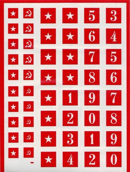 Das Set enthält neben dem russ. Stern in diversen Grössen auch Hammer und Sichel Logo, sowie Ziffern von 0 bis 9. Die einzelnen Schablonen sind auf einer 0,05mm dünnen, reissfeste Folie aufgebracht, welche einfach und schnell ausgeschnitten und auf das passende Fahrzeug aufgebracht werden können. Anschliessend noch die Schutzfolie abziehen und schon kann man das Zeichen auflackieren.