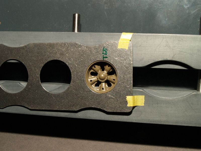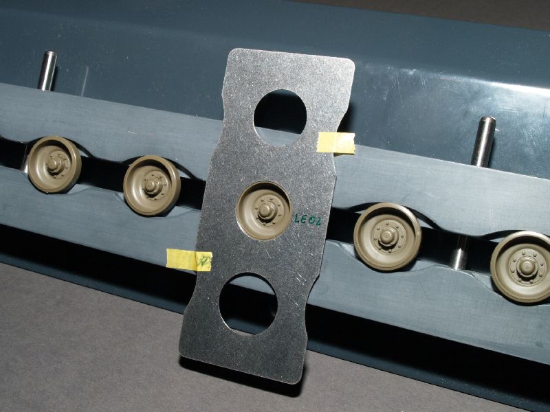 Zur Testzwecken habe ich Laufrollen von einem M8 HMC, einem Leopard 2 und einem T-55 (alle Tamiya) in die Vorrichtung eingespannt, um ein möglicht breites Spektrum der Laufrollendurchmesser abzudecken. Bei jedem Test war die Passgenauigkeit sehr gut. Das auf den Photos sichtbare Masking Tape diente bei den Tests nur zur Fixierung beim Photographieren. Darüber hinaus war es bei den Tests sinnvoll, bei den entsprechenden Durchmesser den Typ auf der Rückseite der Schablone mit einem Edding zu vermerken.