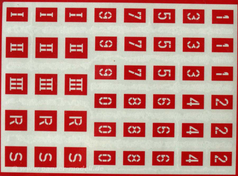 Es enthält 45 Schablonen - je 3mal die Ziffern 0-9 und dazu die Symbole I, II, III, R und S..