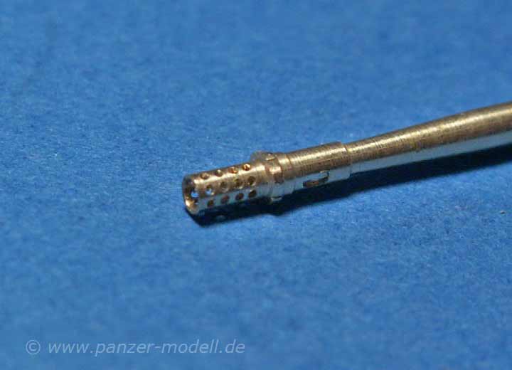 Das Rohr ist aus Messing gedreht und von sehr guter Qualität - besonder die feinen Bohrungen im Mündungsfeuerdämpfer treiben einem die Freudentränen in die Augen, denn noch sieht man diesen Detailgrad selten am Metallrohr-Zubehörmarkt.