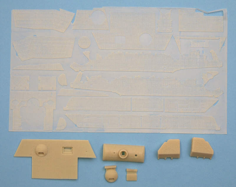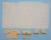 35021 - Panther A späte Ausführung (Dragon Modell): 17,- € Die Zimmerit Struktur besteht aus dem vertikalen Standard Muster mit zusätzlichen diagonalen Linien am Turm. Neben den Zimmerit Flächen für Ober- und Unterwanne und Turm, liegen dem Set auch neu gegossene Teile für Staukörbe, Walzenblende und Fahrerblende. Die Bugplatte liegt auch hier zweifach bei - einmal als Resinmatte mit zusätzlicher MG Blende, sowie als komplett neues Gussteil. |