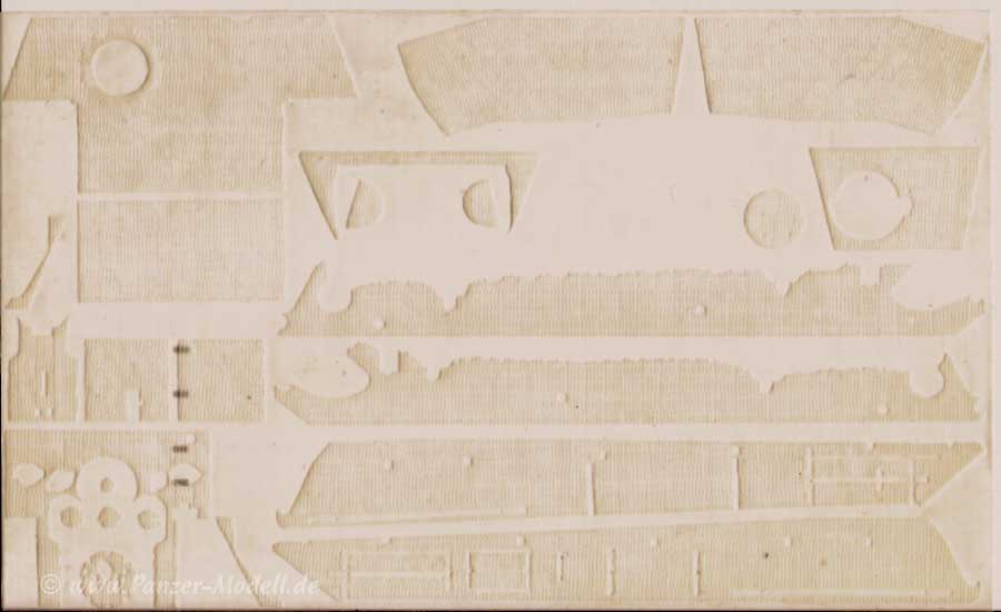 An Teilen enthalten sind: die beiden Seitenteile für die Wanne und Unterwanne, Heckwanne (mehrteilig), Bugplatte der Wanne, Glacisplatte, Turmseite- und Heck mit Ausstiegsluke, usw.