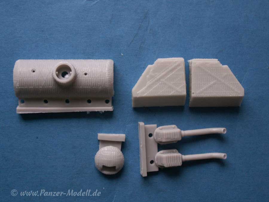 Dankbarerweise sind neben den guten Resinfolien mit Zimmerit auch die komplexen Teile, wie Kanonenblende, Gepäckkästen und Auspuffe als Komplettteile beigelegt, die einfach die Bausatzteile ersetzen.