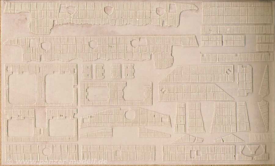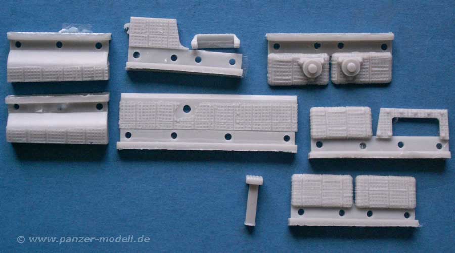 An Resinfolienteilen sind Zimmeritteile für den gesamten Aufbau, Wannenfront, Wannenheck und auch die Wannenseiten im Laufwerk, sowie Glacisplatte, Motordeck und Übergangsbereiche enthalten.