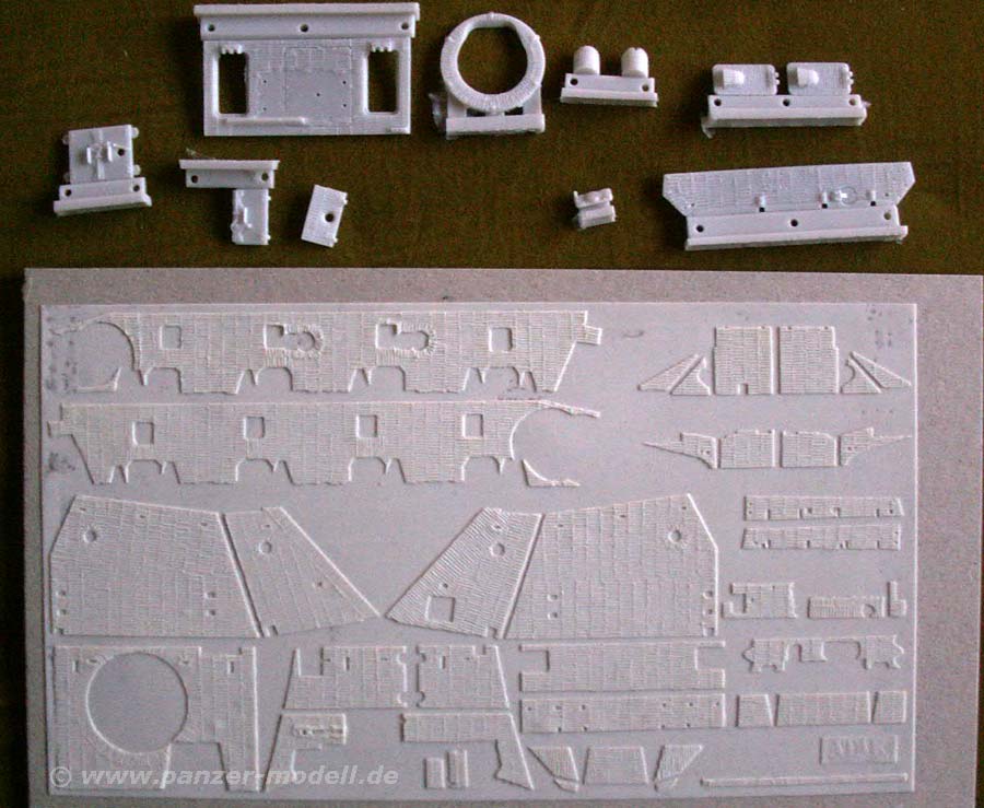 Die Komplettteile aus Resin, die die Originalteile ersetzen, sind die Glacisplatte mit Wartungsklappen, Geschützkragen, Motorraumheckwand, Aufbautüren, usw.