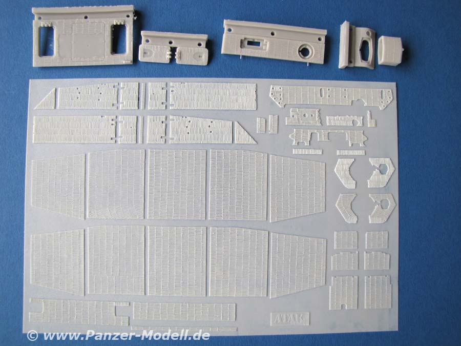 Das Set besteht wie gewohnt aus einem großen Bogen hauchdünnem Resin mit den entsprechenden Flächen mit Zimmeritmuster. Dieses ist sehr überzeugend und realistisch dargestellt. Zusätzlich gibt es für die komplexen Teile des Bausatzes komplette Ersatzteile aus Resin mit entsprechender Zimmerittextur!