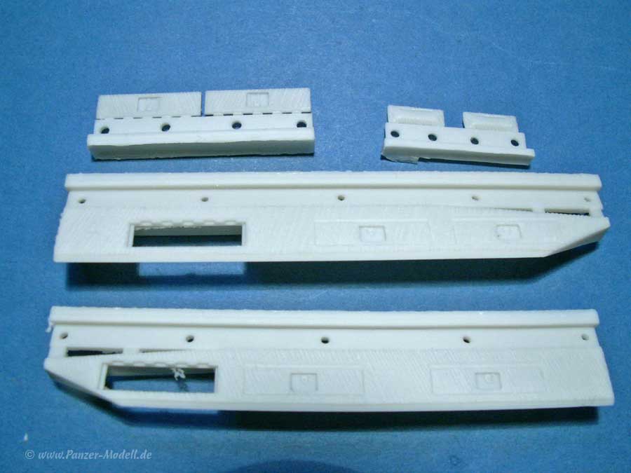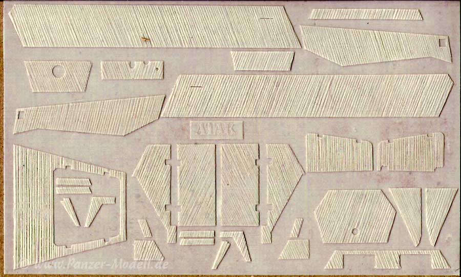 Die dünnen Resinfolien mit dem Zimmerit umfassen die Oberwannenseiten, die Heckwanne mit Türen, Frontbech, Motorraumseiten, Motorraumoberseite mit Zugangsklappen, Kotflügel und Fahrerfrontplatte.