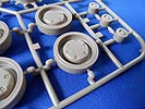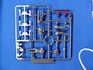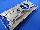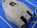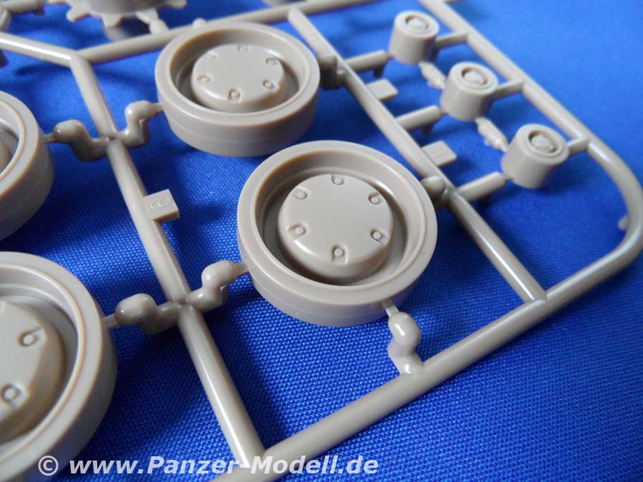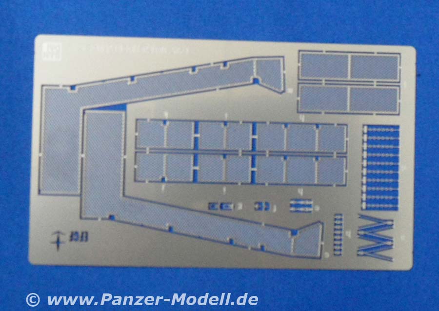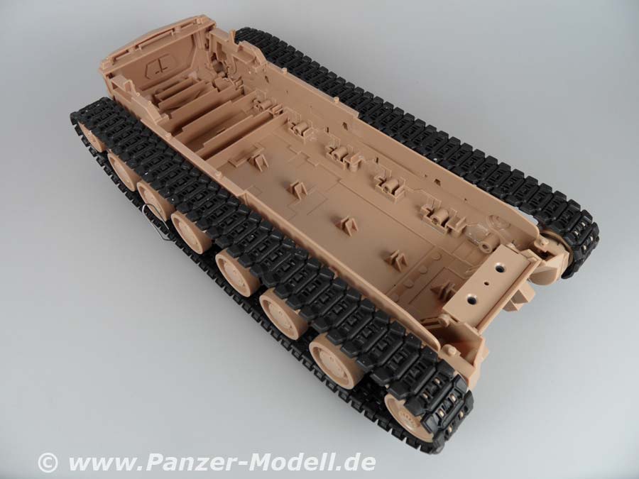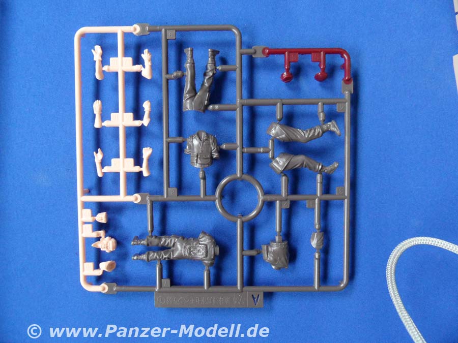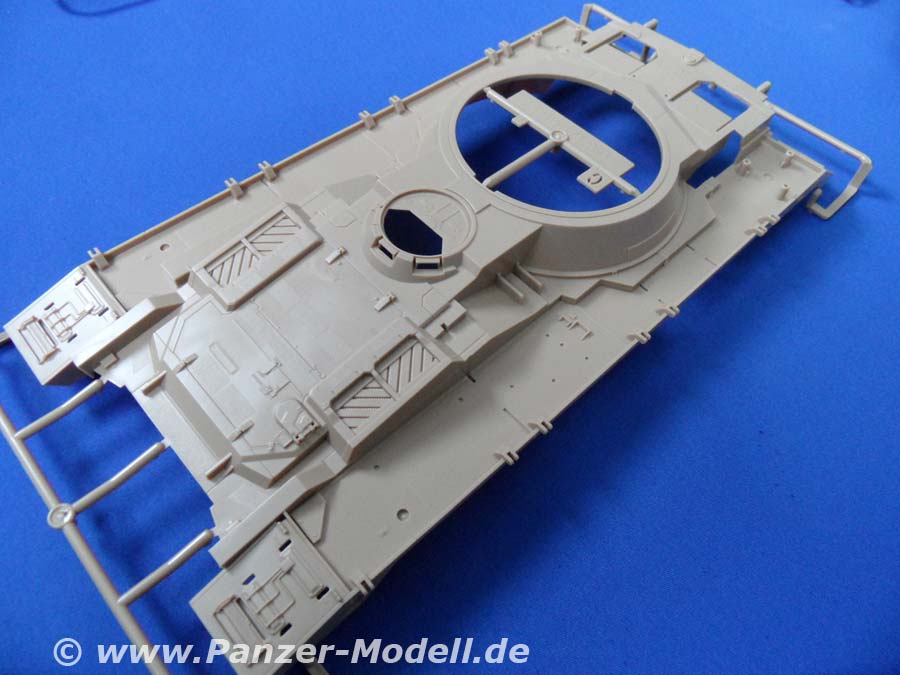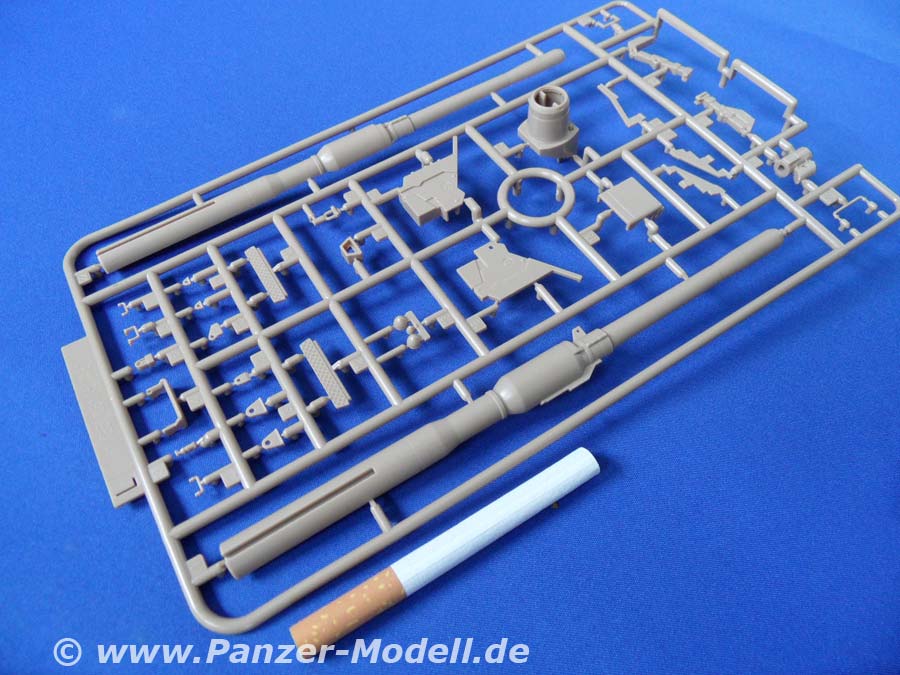 Es handelt sich um den Bandai Bausatz 157471 namens E.F.G.F. M61A5 MBT „Semovente“ Phantom Element. Der Bausatz besteht aus 18 Spritzlingen, davon zwei aus Vinyl, einer aus Klarplastik und einer für die Figuren, die in unterschiedlichen Farben gegossen sind. Dazu kommt ein Ätzteilbogen, Decals, Metallstifte und Schnur. Wenn man sich nun die Bauanleitung zur Hand nimmt, stößt man zuerst auf sehr liebevoll gemachte Zeichnungen des Panzers und diverser Ausrüstungsgegenstände. Überhaupt sind in der Anleitung haufenweise solche Zeichnungen zu finden. Klappt man die Seite dann auf gibt es exelente Farbfotos eines gebauten Modells und der Besatzung. Wie gewohnt beginnt die Anleitung mit der Wanne. Diese ist super detailiert und wie auch alle anderen Teile perfekt gegossen. Die großen Hecktüren lassen sich theoretisch offen darstellen. Nachdem man dann die riesigen Laufrollen angebracht hat folgt die Kette. Diese besteht aus je zwei Vinylkettenhälften, die mittels Metallstiften verbunden werden und nicht wie so oft per heißem Schraubenzieher verschweißt. Genial einfach und hält garantiert ewig! Folgt die Oberwanne mit perfekten Details, zu öffnender Fahrerluke und zwei Luken am Heck. (Der Motor sitzt übrigens Vorne. Nicht nur deshalt erinnert dies Monster an einen Merkava. ) Der Fahrer bekommt einen speziellen „Sitz“, durch den die Vollfigur des Fahrers in der richtigen Höhe gehalten wird. Warum ich das so betone ist das der Fahrer, obwohl nur der Kopf rausguckt, als Vollfigur enthalten ist und somit auch neben dem Fahrzeug plaziert werden kann. Die dicken Kästen auf dem vorderen Teil der Kettenbleche können ebenso wie die Seitenschürzen optional angebaut werden. Kommen wir also langsam zum Turm! Bevor Ober- und Unterteil verbunden werden kommt noch der Boden der Staukörbe (geniale Konstruktion, die Ausrichten der Streben überflüssig macht), die Rohrwiege und die Klarteile für die Winkelspiegel rein. Außerdem gibt es noch den Sitz des Kommandanten. Sonst bleibt der Innenraum allerdings leer. Die beiden Kanonen werden durch ein strammes System sicher in Position gehalten. Fehlen noch die Seitenteile des riesigen (was ist bei dem Teil nicht riesig???) Staukorbes, welche mit den beiliegenden Ätzteilen vergittert werden. Noch die restlichen Kleinteile ran und schon steht der Hochzeit von Wanne und Turm nichts mehr im Wege. Fehlt noch die tolle Besatzung und die MGs, sowie die Rohrverzurrung, welche wahlweise das Rohr fest hält oder zusammengeklappt gebaut wird. Als Bemalungsvariation wird ein Panzer gezeigt, der einem Israeli doch stark ähnelt. Insgesamt sehr Merkava-like, dies Monster. Allerdings ist, und das ist ja das schöne an solchen Zukunftsbausätzen, die Bemalung reine Fantasiesache. Und wenn er rosa mit gelben Punkten wird. Fazit: Wenn man immer nur das alte Zeug baut ist das evtl. auch irgendwann langweilig und der Schweinepanzer vielleicht nicht jedermanns Sache. Hier kann man sich dann mal entspannt mit einem Schüttelbausatz kreativ austoben und bleibt dem 35er Maßstab trotzdem noch treu. Zudem ist es ein echter Hingucker. Schlägt er doch in seinen Abmessungen locker die Maus und den E-100. Leider ist der Bausatz nicht billig. 110-120 EUR sind schon viel Geld. Und dann gibt’s ja noch das ganze Zeug drumrum. Soldaten, Jeeps, Truppentransporter und sogar die riesigen Roboter (in 1:48, aber passt schon!). Also! Kaufen, wenn man mal was Anderes und Besonderes will!