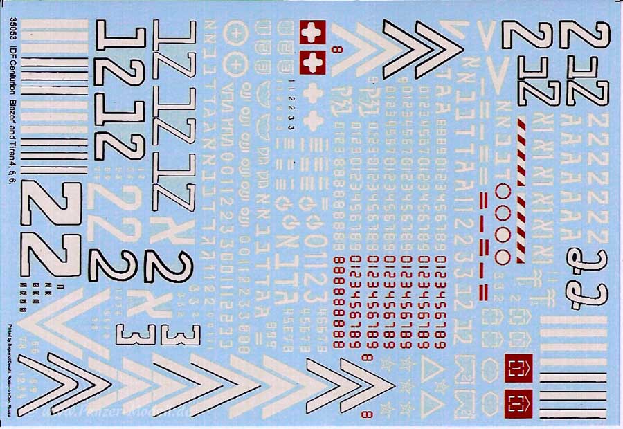 Der 10x15cm große Decalbogen enthält haufenweise Markierungen für diese israelischen Panzer. Auf dem Bogen enthalten sind viele verschieden große Winkel, große Ziffern, hebräische Schriftzeichen in verschiedenen Größen, weiße Balken, rote Ziffern, weiße Ziffern, sowie weitere spezifische Markierungen.