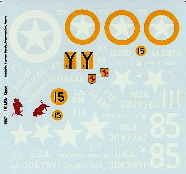 In dem Set sind Decals für 4,5 (kein Scherz) M5A1 Stuarts vorhanden, welche in Europa und im Pazifik eingesetzt wurden.