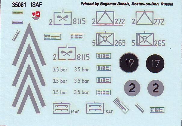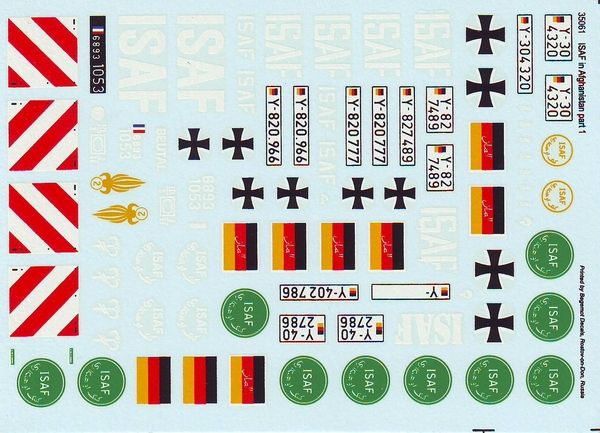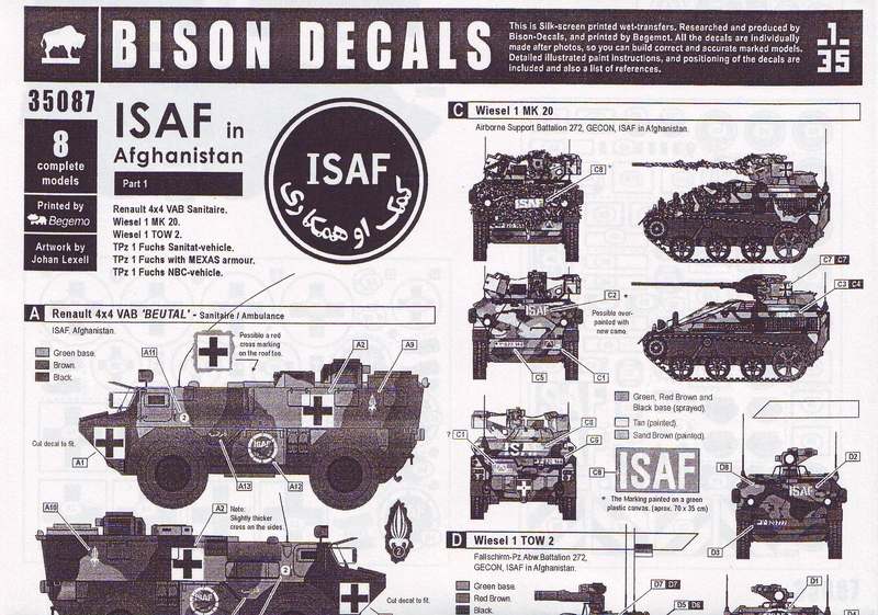 Neben Fahrzeugen aus dem zweiten Weiltkrieg widmet sich Bison Decals auch aktuellen Themen. Unter der Nummer 35087 gibt es einen Decalbogen für Fahrzuege der ISAF in Afghanistan (Part 1).
