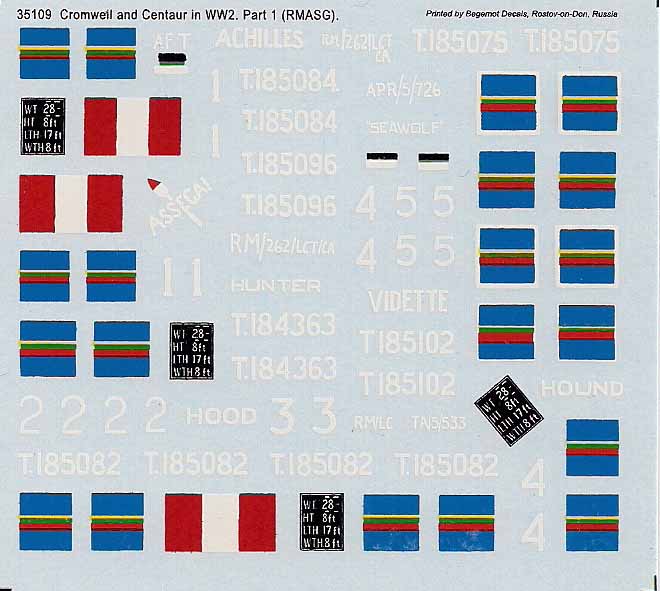 Insgesamt sind Markierungen für 6 Fahrzeuge enthalten die allesamt für Centaur Mark IV aus den Jahren 1944 in Europa gedacht sind. Mit diesen Sets können die 6 verschiedenen Panzer jeweils optional markiert werden. Enthalten sind sehr viele britische Markierungen und Schriftzüge.