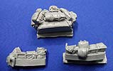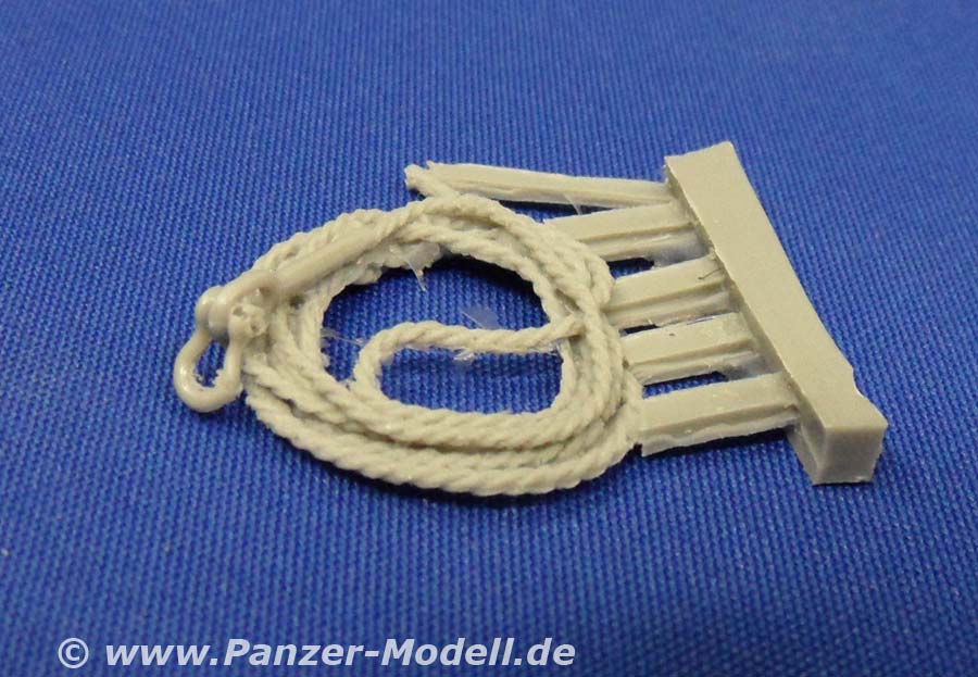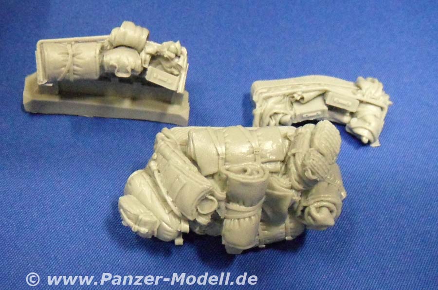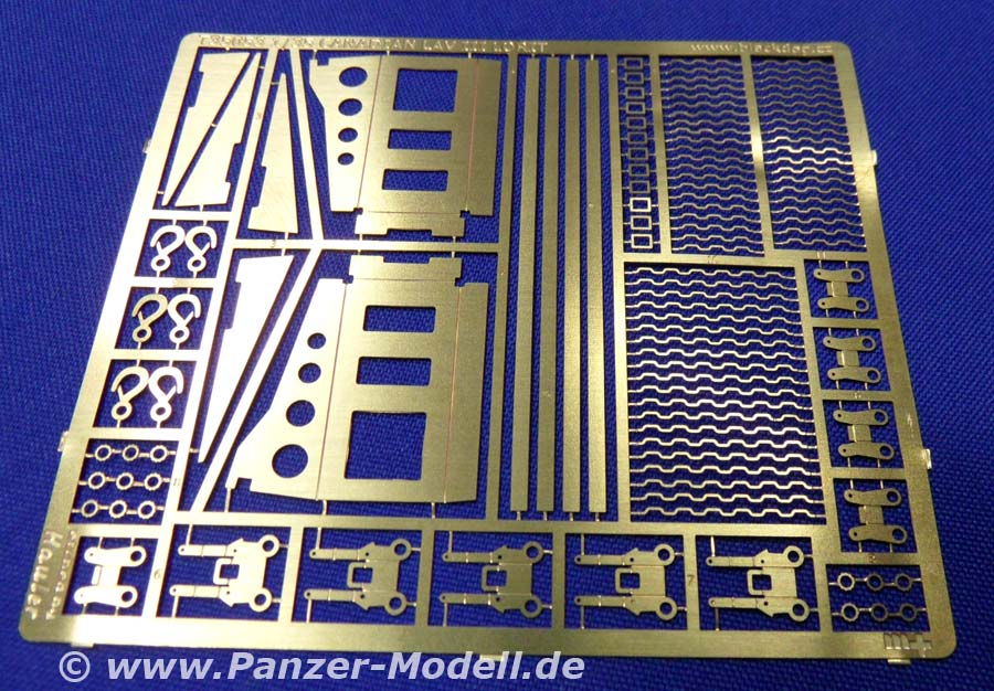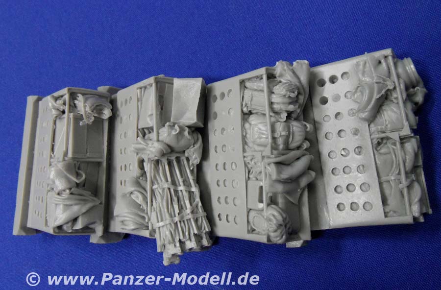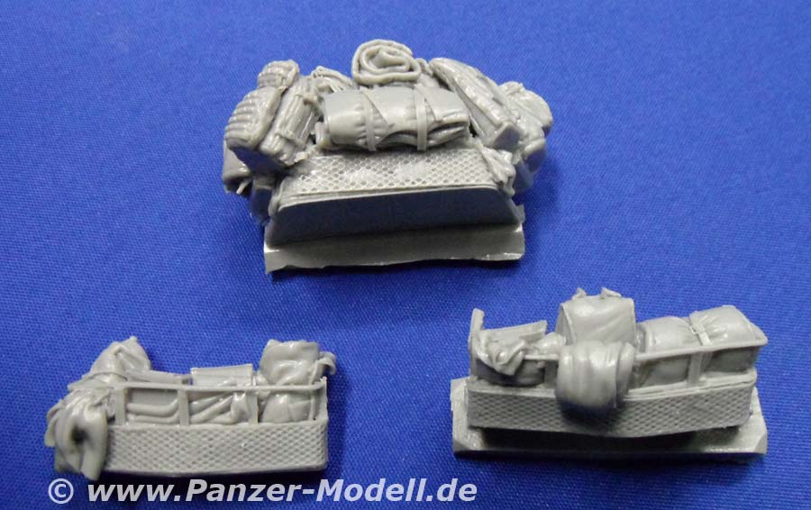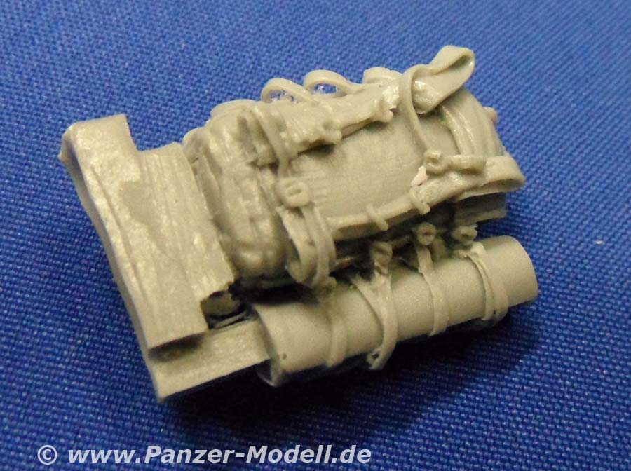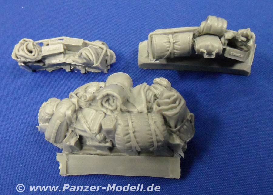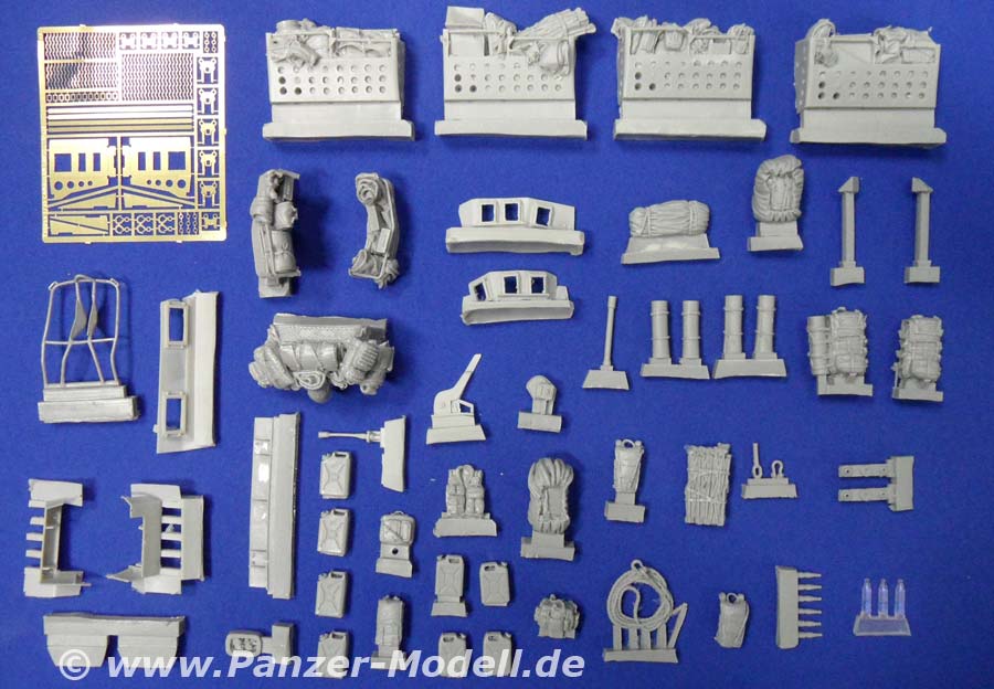 Was der geneigte Bastelfreund evtl. schon erraten hat ist folgendes: Dieser „Zubehörsatz“ ist wenn überhaupt ein ausgewachsener Umbausatz und von erstklassiger Qualität und Formtreue! Es enthält die großen Staukörbe an den Seiten der Wanne und um den Turm herum, die Schutzschilde auf dem Turm und um die hinteren Wannenluken, die T-Antennen, neuen Kabelschneider, die Ersatzradhalterung am Bug, diverses Gerödel und drei Wasserflaschen aus klaren Resin. Dazu gibt es eine Platine mit Ätzteilen für die Kanisterhalterungen und Zurrösen, sowie die Spannschlösser von Spanngurten (Tamiyatape oder Pflaster!?). Man braucht wohl nicht extra zu erwähnen, dass die Staukörbe voller Gerödel stecken und auch weitere Rucksäcke, Isomatten usw lose beiliegen. Insgesamt bleibt von der ursprünglichen Form nicht viel übrig! Dazu gibt es sowas wie eine Bauanleitung!!! Eine ganze DIN-A4 Seite mit Ansichten eines gebauten Modells und Zeichnungen zu den Ätzteilen!!! Wer Black Dog kennt weiß warum mich das so begeistert! Wer nicht kann es sich denken! Alles was man jetzt noch braucht, sind ein paar neue Resinreifen und evtl. noch den Trumpeter-Bausatz des LAV-III. Mit diesem Umbausatz hat man auch als Gelegenheitsmodellbauer die Möglichkeit einen Lorit zu bauen, da die Staukörbe als Ganzes in Resin gegossen sind und somit nicht wie sonst üblich aus Ätzteilen und Draht selbst hergestellt werden müssen. Und der Profi wird das Real Model Modell zur Seite legen und erleichtert durchatmen! Da die Staukörbe nach Wahl verteilt werden können lassen sich sogar zwei nebeneinander bauen, die nicht gleich aussehen! Super! Zur Qualität der Teile gibt es nur eins zu sagen: Perfekt! Urmodellbauer und Gießer verstehen ihr Handwerk! Nicht ein Detail nicht vorhanden. Keine Luftblasen. Null Verzug. Perfekt eben! Fazit: Wem der normale LAV-III zu langweilig ist, dem sei zu diesem Set geraten! Besser geht nicht (bis auf die „Anleitung“ vielleicht)!