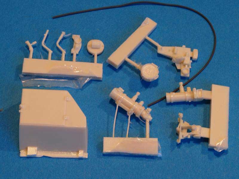 Insgesamt setzt sich das Set aus 11 Teilen aus cremefarbenen Resin, sowie einem Gummischlauch für die Verkabelung zusammen. Die Qualität der Teile ist sehr gut, sie haben nur einen kleinen Resinfilm, der sich leicht mit einem scharfen Bastelmesser entfernen läßt. Ferner ist der Detailierungsgrad der Teile erstklassig. Daneben gibt es noch eine kleine schwarz/weiß Anleitung, die in 5 Schritten den Zusammenbau der Infrarot-Asurüstung, sowie die Montage der einzelnen Komponenten erklärt.
