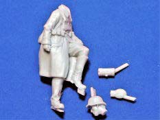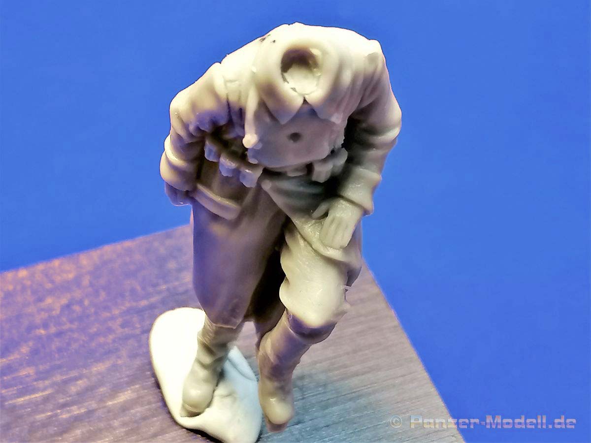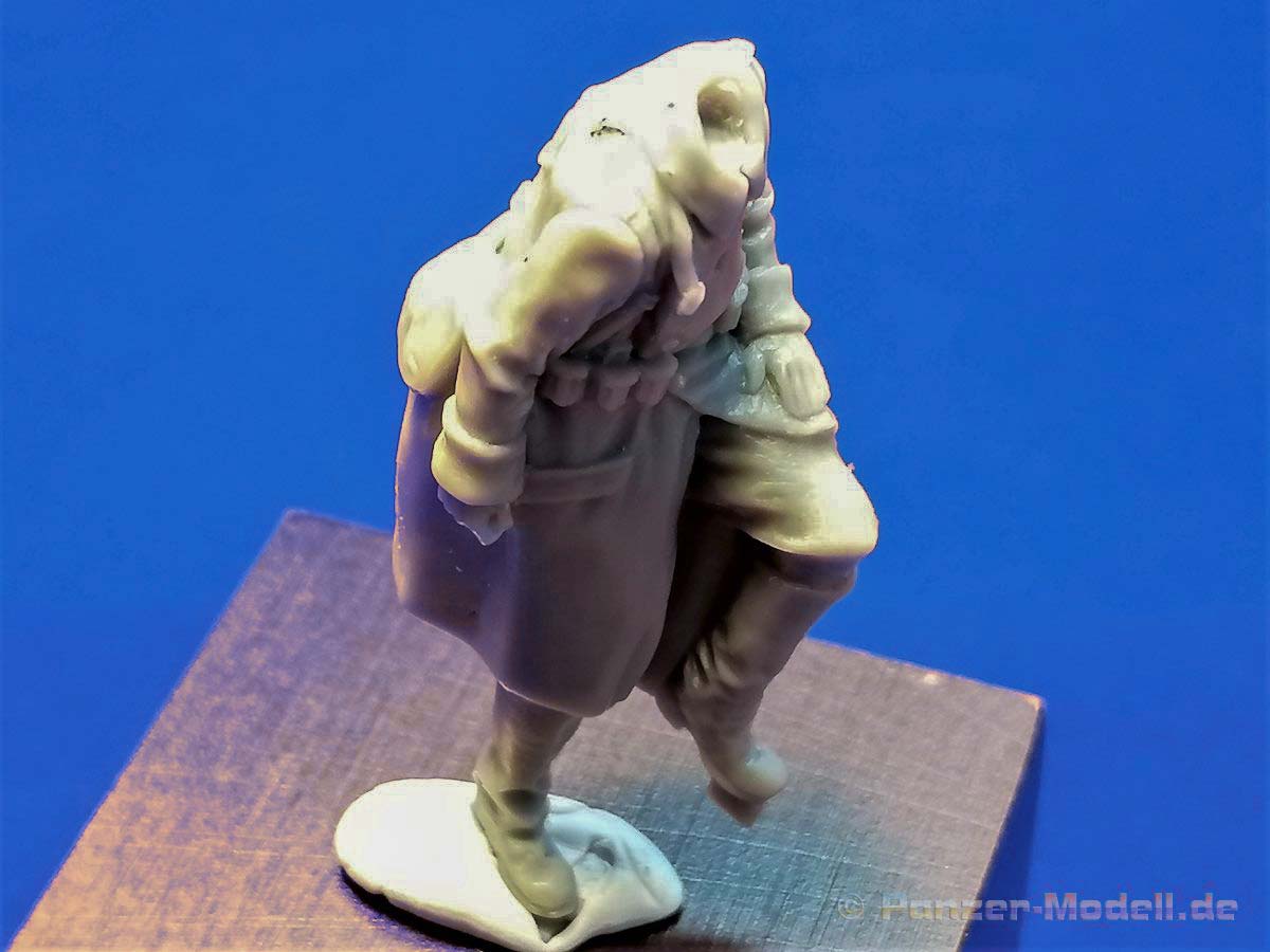 Die Angüsse sind nicht prägnant und sollten sich einfach entfernen und versäubern lassen. Das gilt auch für das bisschen Fischhaut das sich hier und da zeigt. Aber alles kein Problem… Der Körper ist einteilig, nur der Kopf, ein Gasmaskenbehälter und eine Feldflasche sind zu ergänzen. Lediglich der Anguß des Kopfes liegt auf dem Stahlhelm. Hier ist etwas Vorsicht bei der Versäuberung geboten. Die Figur ist wunderschön umgesetzt und auch in den Proportionen stimmig. Auch der Faltenwurf des Mantels und der Hose kann überzeugen. Durch die halb sitzende Haltung kann die Figur auf einem Panzer, einer Mauer oder auch einer Kiste zum Einsatz kommen. Möglichkeiten gibt es ja genug. In Summe eine durchaus empfehlenswerte Figur. Das Set kann direkt über den Hersteller oder über den Händler ihres Vertrauens bestellt werden