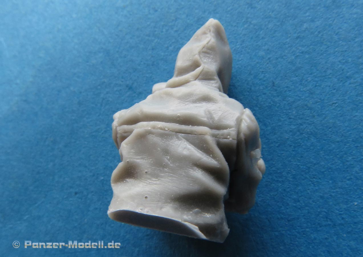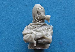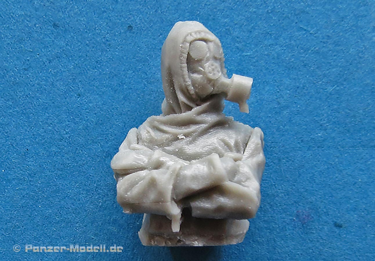Die Figur ist wunderschön umgesetzt und auch in den Proportionen stimmig. Diese Halbfigur ist mit Gasschutzoverall und Gasmaske, sowie Handschuhen dargestellt. Die Details der Uniform mit dem Faltenwurf sind exzellent umgesetzt und auch die Gasmaske mit Filter ist fein und sauber modelliert und gegossen. Die herausforderung hier liegt gediglich in der passenden Bemalung der eigentlich durchsichtigen Sichtscheiben für die Augen ...