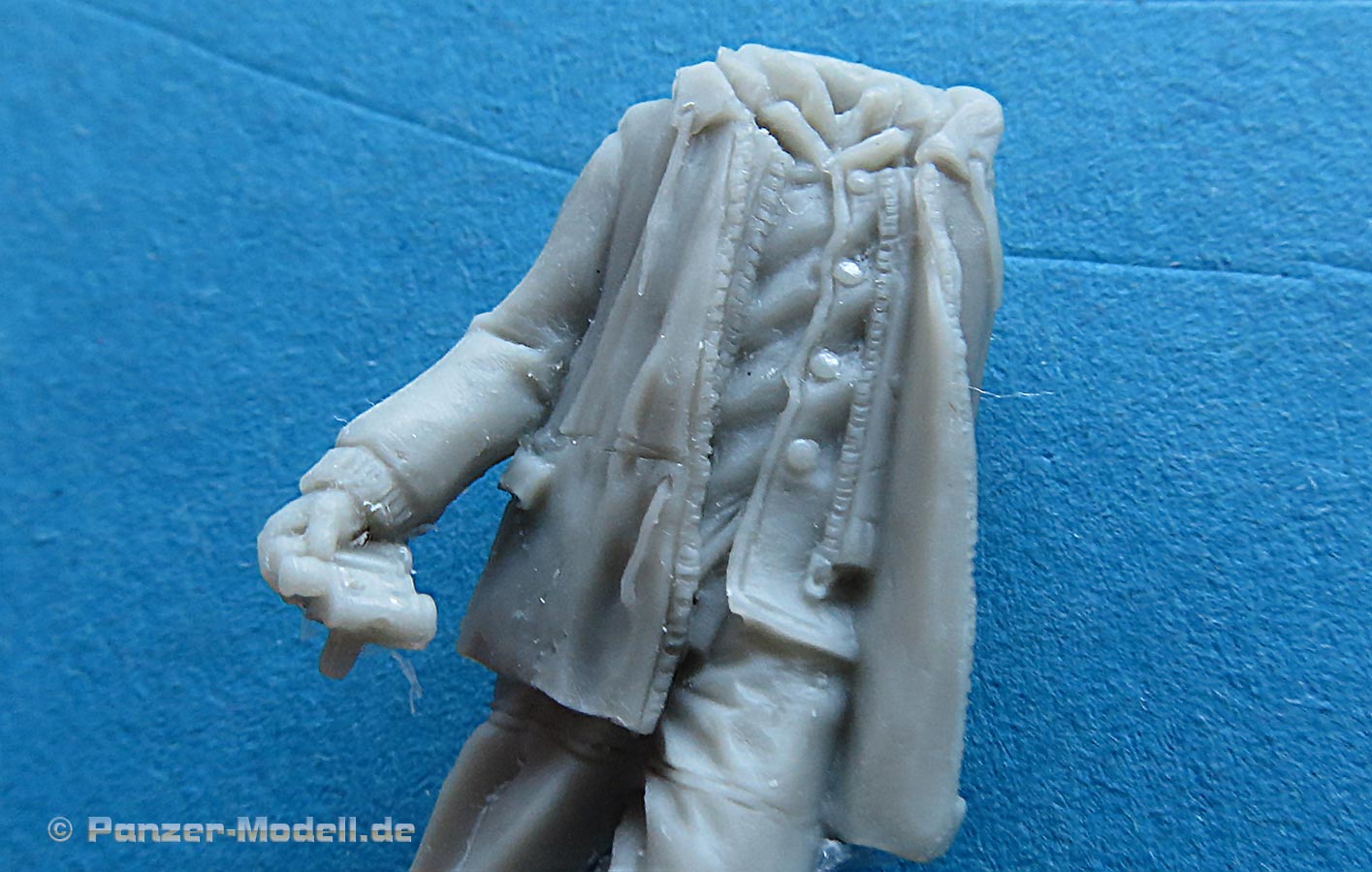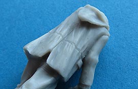 Diese Figur ist mit eine Uniformmix ausgestattet, der Richtung letzte Kriegstage, bzw. Wehrmacht 46 geht, denn die Grunduniform sieht nach Arbeitsanzug Mannschaften aus mit darüber getragener, offener Wendejacke - diese hier hat allerdings einen (sehr fein gestalteten) Reißverschluss. Die weiteren Details der Uniform mit dem Faltenwurf, Kragen und Kapuze sind wahrlich exzellent umgesetzt.