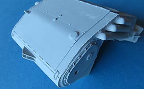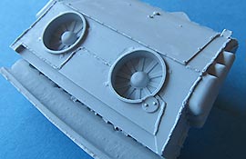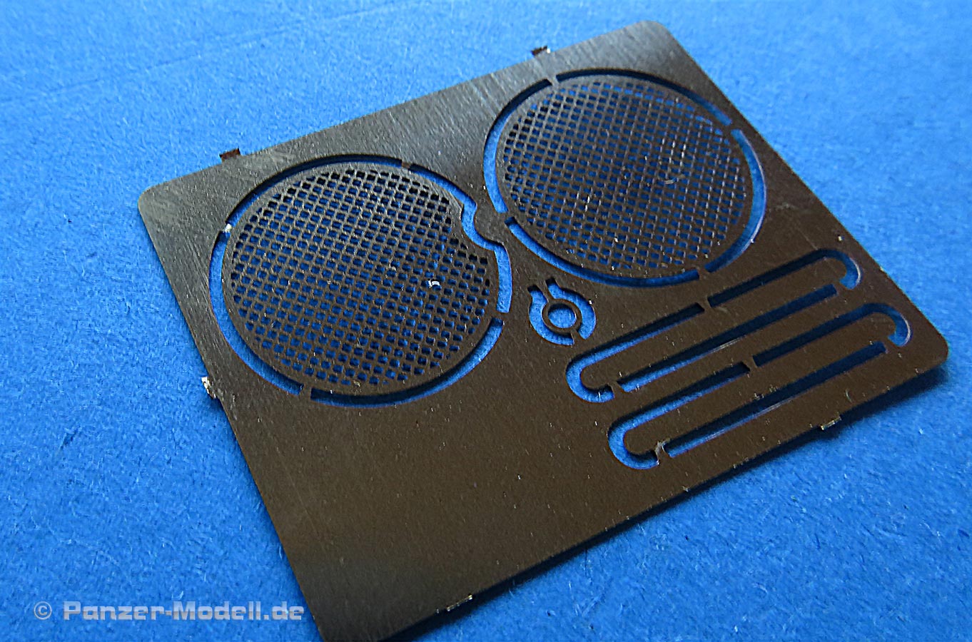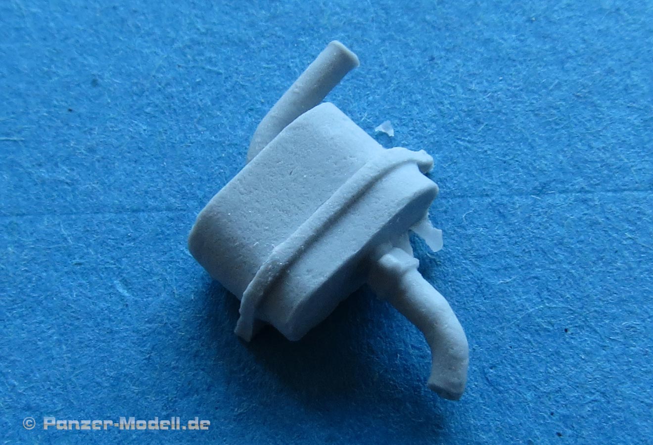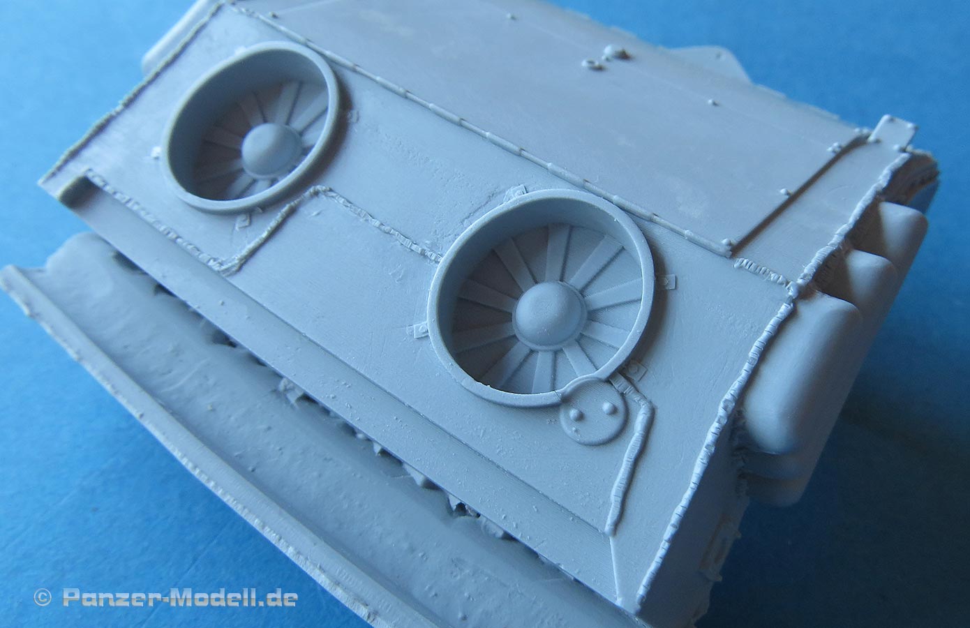 Das größte Teil ist das markanteste des Umbausatzes, denn es stellt das komplett umgebaute und völlig anders geformte Heck mit Motorraum in einem Stück dar. Die Detaillierung ist sehr gelungen und die eigenwillige Form ist sehr schön wiedergegeben. Die Motorraumluken sind geschlossen angegossen. Die Lüfter sind bis in die Tiefe mit Lüfterradschaufeln dargestellt und werden darüber mit PE Gittern abgedeckt. Die Schweißnähte sind recht markant - vielleicht eine Spur zu erhaben - aber mit wunderschöner Struktur versehen. Auch die markanten seitlich Luftöffnungen sind ebenfalls sehr gut dargestellt.