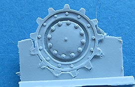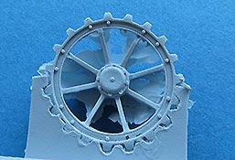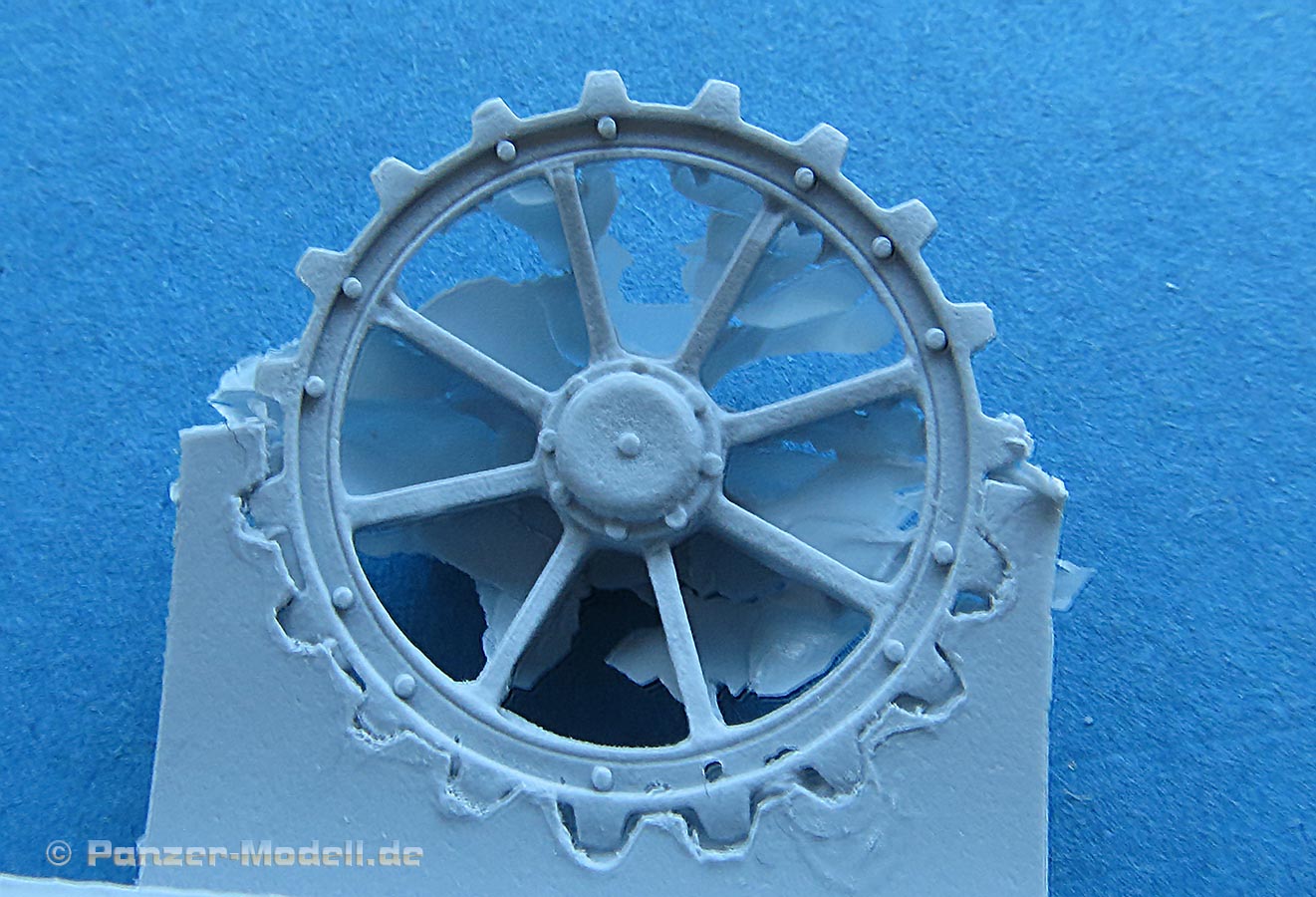 Die Gussqualität der Teile ist gewohnt sehr gut - keine Luftblasen oder Verzug. Die Angüsse sind bei den Rädern etwas aufwändiger, da sie die Häfte des Rades umfassen und man aufpassen muss keine Zähne zu beschädigen - in den Speichen finden sich ein paar Fischhäute, aber die sind mit einem Skalpell schnell weggekratzt. Und am großen Heckteil gibt es einen Anguss über die gesamte Breite.