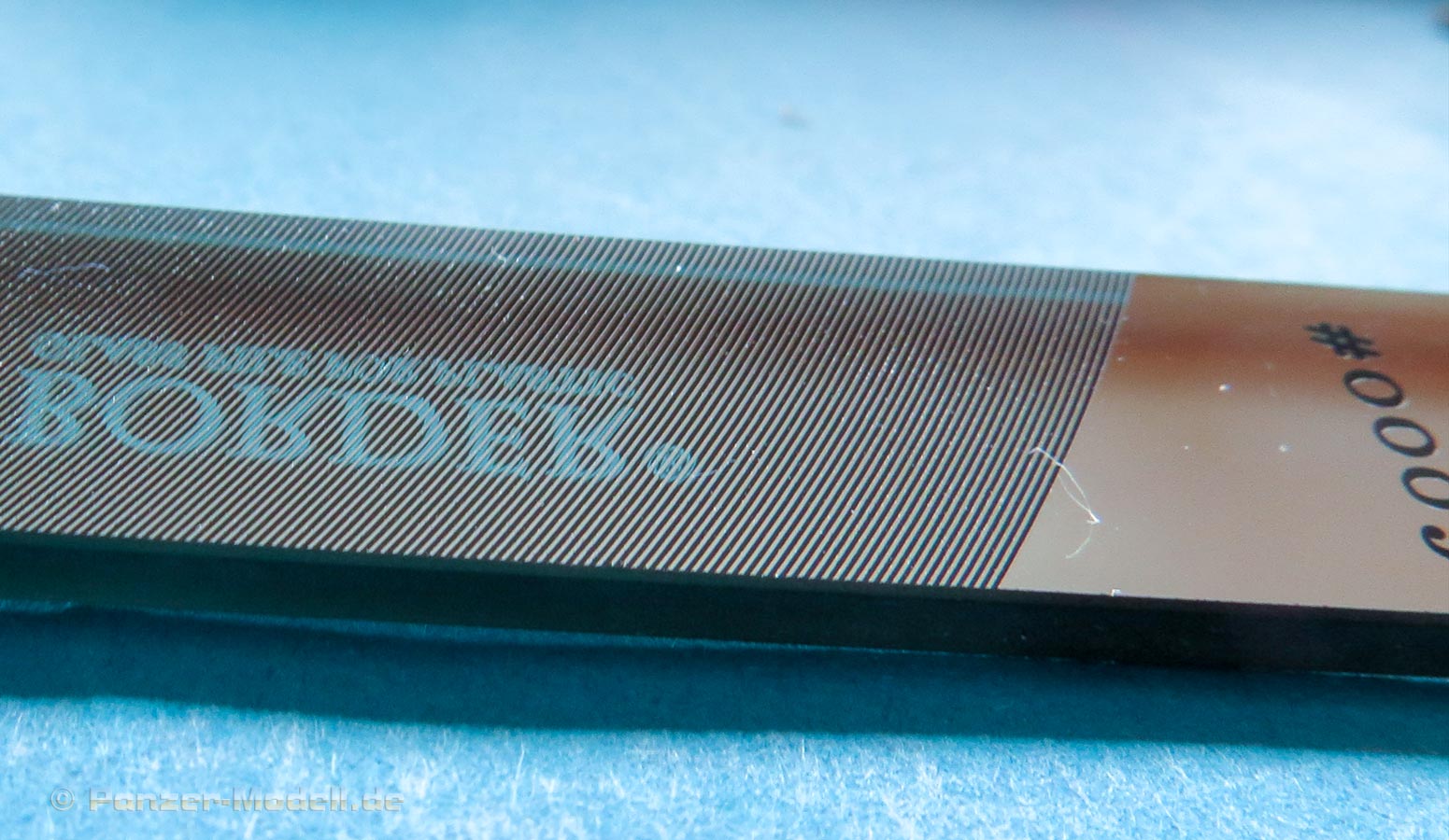Die 6000er "Körnung" ist fürs feine polieren nach dem Grobfeilen, teilweise sogar für Klarsichtteile und die ENtfernung von Kleberückständen und ist nur auf einer Seite der Feile angebracht die andere Seite ist glatt und verspiegelt, auf der geriffelten Seite ist die ersten 5cm ebenfalls glatt und bietet somit Platz um die Feile gut anzufassen, denn ehrlichgesagt fühlt sich die geätzte Riffelung auf der Haut seltsam unangenehm an.