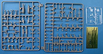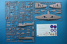 Im Karton finden wir 6 graue und einen transparenten Spritzling, eine PE Platine und einen riesen Decalbogen
