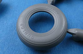 Das Fahrwerk ist im eingefahrenen oder ausgefahrenen Zustand anbaubar. Leider ist hier nur eine Version Reifen, nämlich im unbelasteten Zustand enthalten - so macht nur eine Darstellung im eingefahrenen Zustand Sinn. Die Reifen selber sehen aber ganz gut aus mit den Details und den Herstelleraufdrucken von Dunlop an den Seiten.