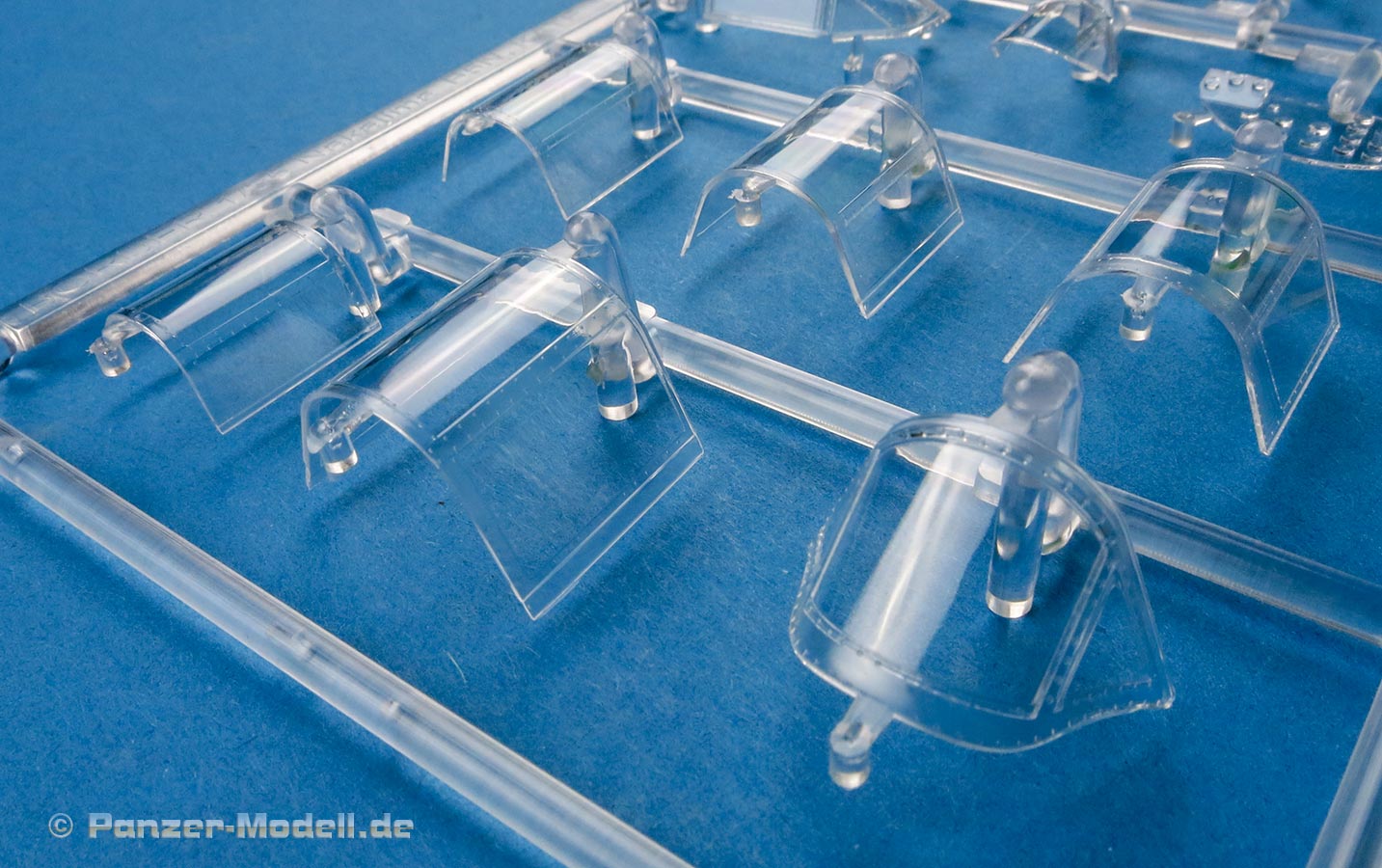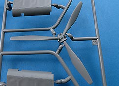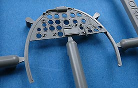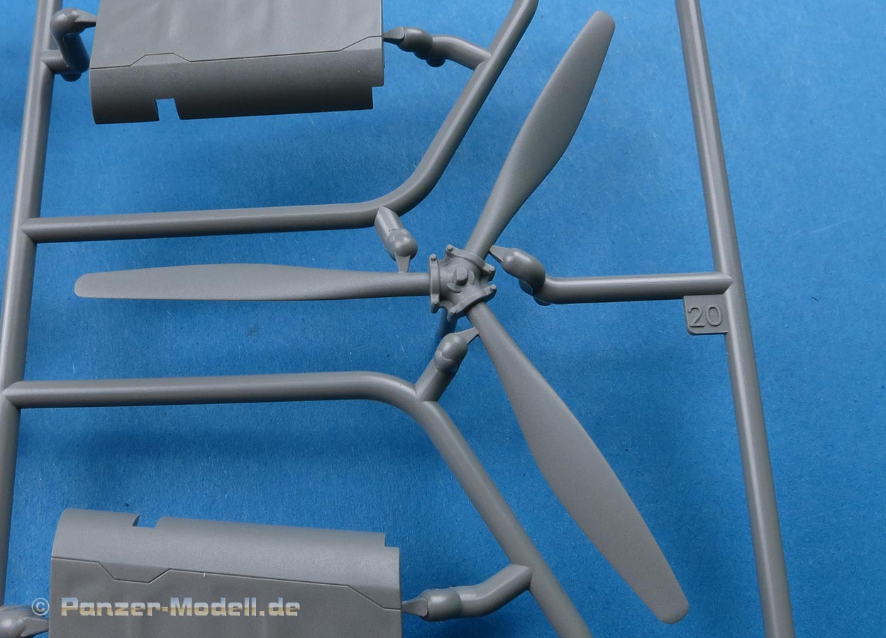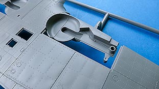 Die Cockpitverglasung ist mehrteilig mit einzelnen Klarsichtteilen, die sauber gespritzt und durchsichtig sind. Das hinterste Element lässt sich wahlweise mit MG und hochgeklappter Verglasung oder mit verschlossenem Element.