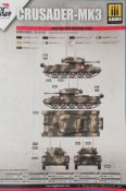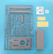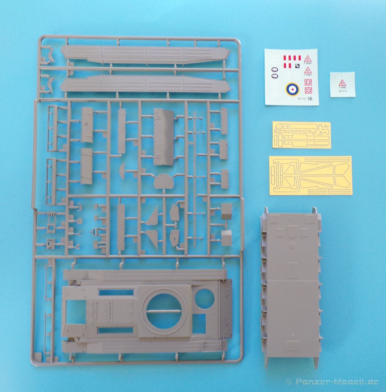 Beim Öffnen des sehr stabilen Stülpkartons zeigen sich siebzehn Spritzlinge in einem schönen grauen Plastik (Davon 9 nur mit Kettenbolzen), ein klarer Spritzling, eine einteilige Unterwanne mit allen benötigten Details, Polycaps, zwei kleine Platinen mit Ätzteilen, ein Beutel mit Kettengliedern, Polycaps, Decals (Mit einem kleinen Decal zur Berichtigung) und die Bauanleitung. In meinem Besprechungsmodell lagen zusätzlich noch ein gedrehtes Kanonenrohr und eine wüstengelbe Schneidematte mit Crusader-Dekor bei.