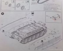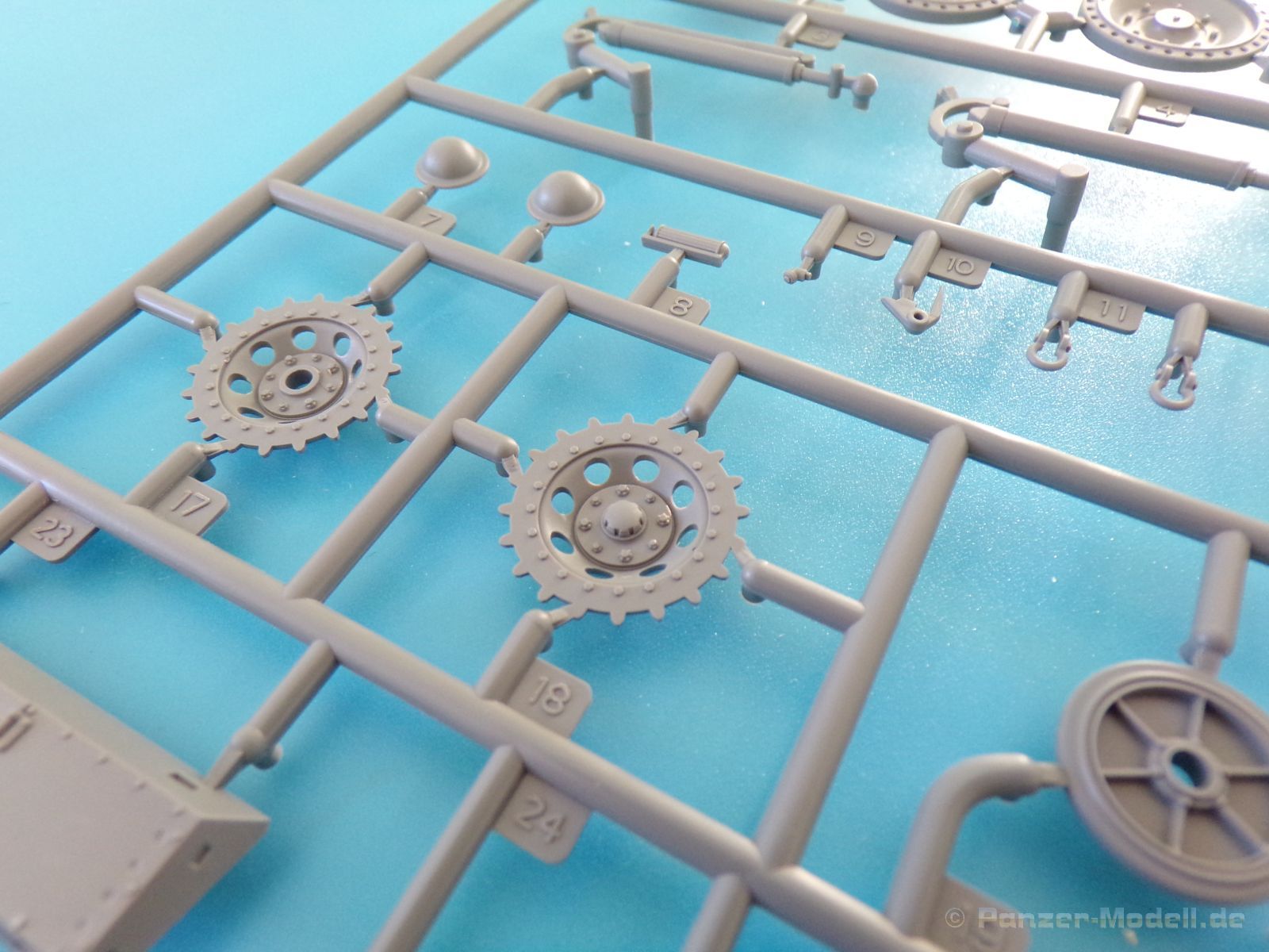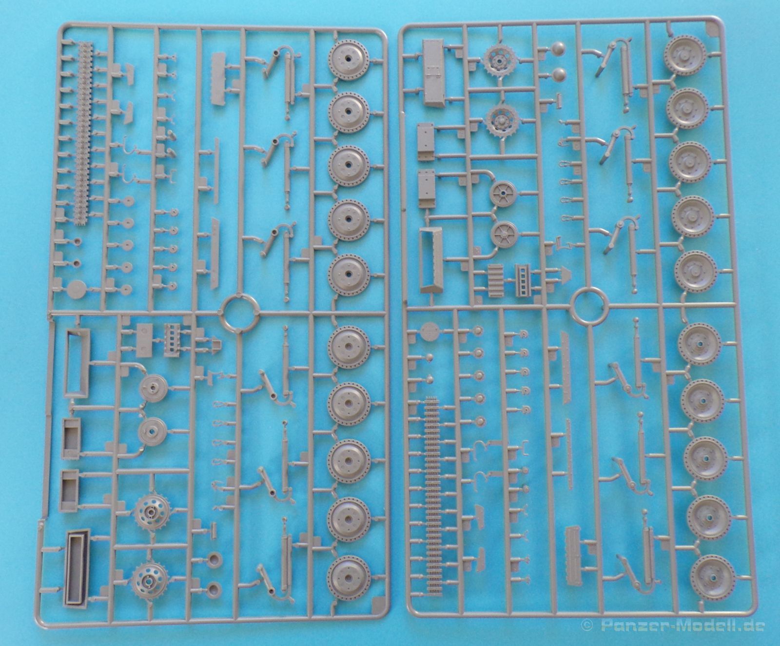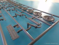 Die Federungselemente der Christie Aufhängung werden an die Unterwanne geklebt, und der Hersteller gibt dem Modellbauer hier zwei Optionen. Entweder könne diese fest verklebt werden, und das Fahrzeug bleibt dann fest in dieser Position, oder es können bestimmt Plastikangüsse entfernt werden, so dass die Federung in sich beweglich bleibt und zum Beispiel an eine unebene Diorama-Grundfläche angepasst werden kann. Aus diesem Grunde gibt es bei den Kettengliedern auch zwei Optionen. Zunächst befinden sich mehr als 234 Kettenglieder in einem Beutel.