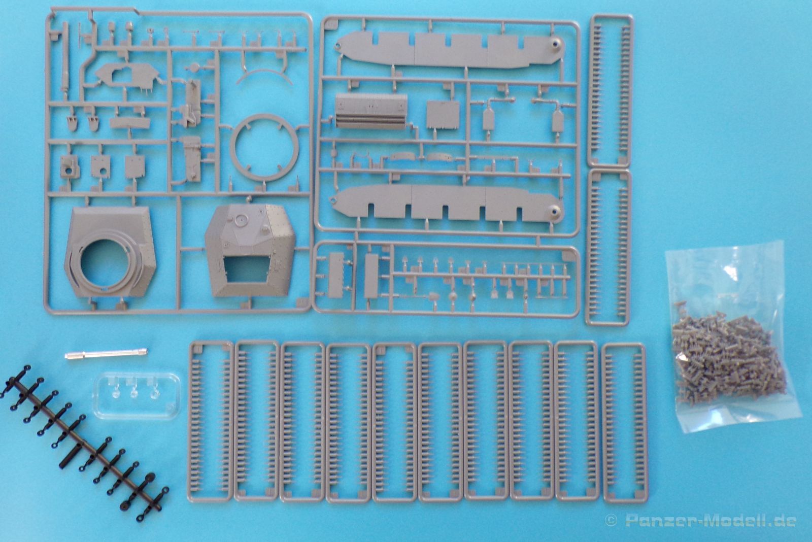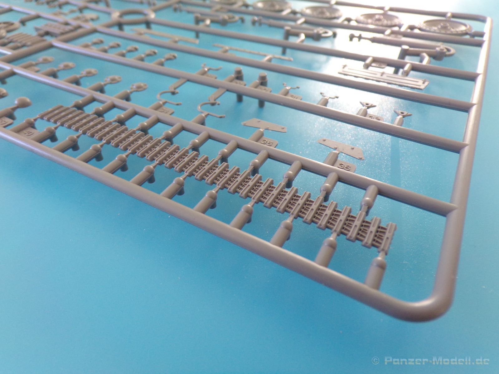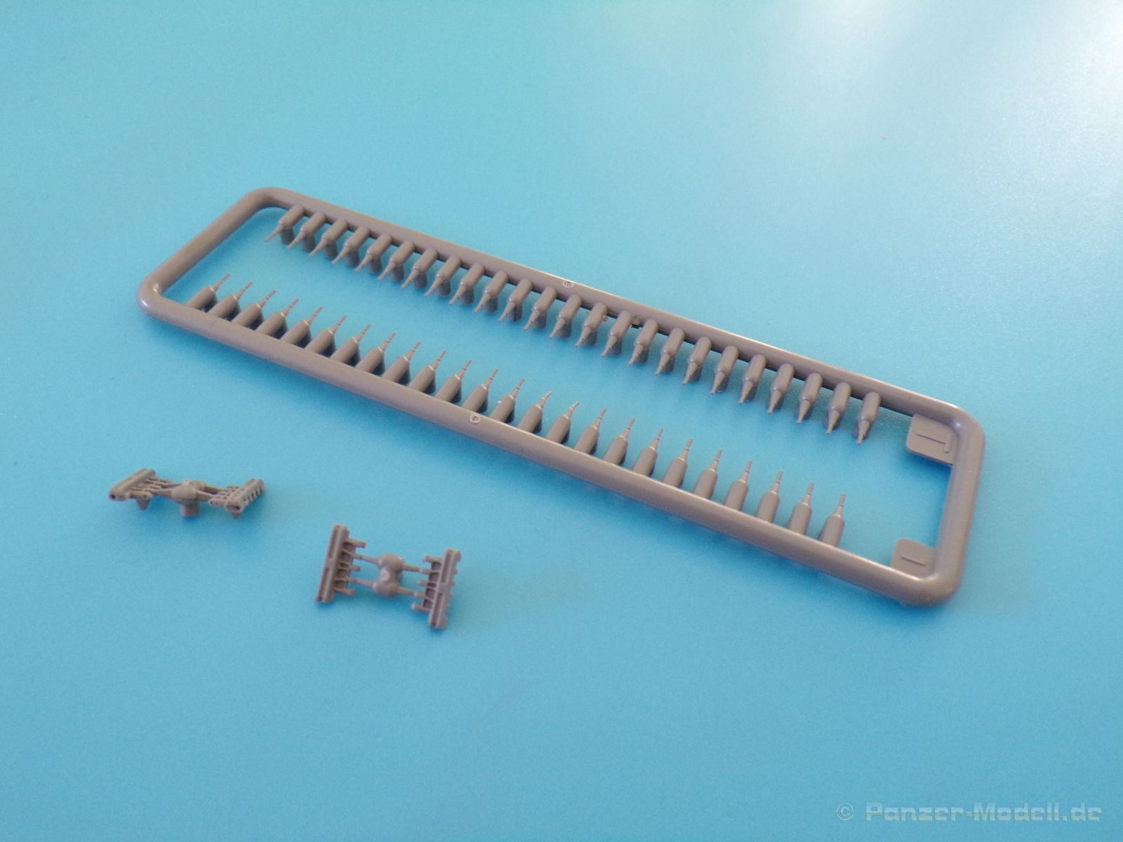 Jedes einzelne Kettenglied wird mit dem nächsten Kettenglied mit je zwei Bolzen verbunden. Für jede Seite werden 117 Kettenglieder benötigt, somit macht der Kettenbau einen Großteil der Arbeit an diesem Bausatz aus. Es sei denn man spart sich etwas Arbeit, in dem man auf das bewegliche Laufwerk verzichtet. Für diesen Fall lieht bereits ein etwas längeres Kettensegment bei, welches aus 34 bereits verbunden Kettengliedern besteht. Auch diese macht einen sehr schönen Eindruck.