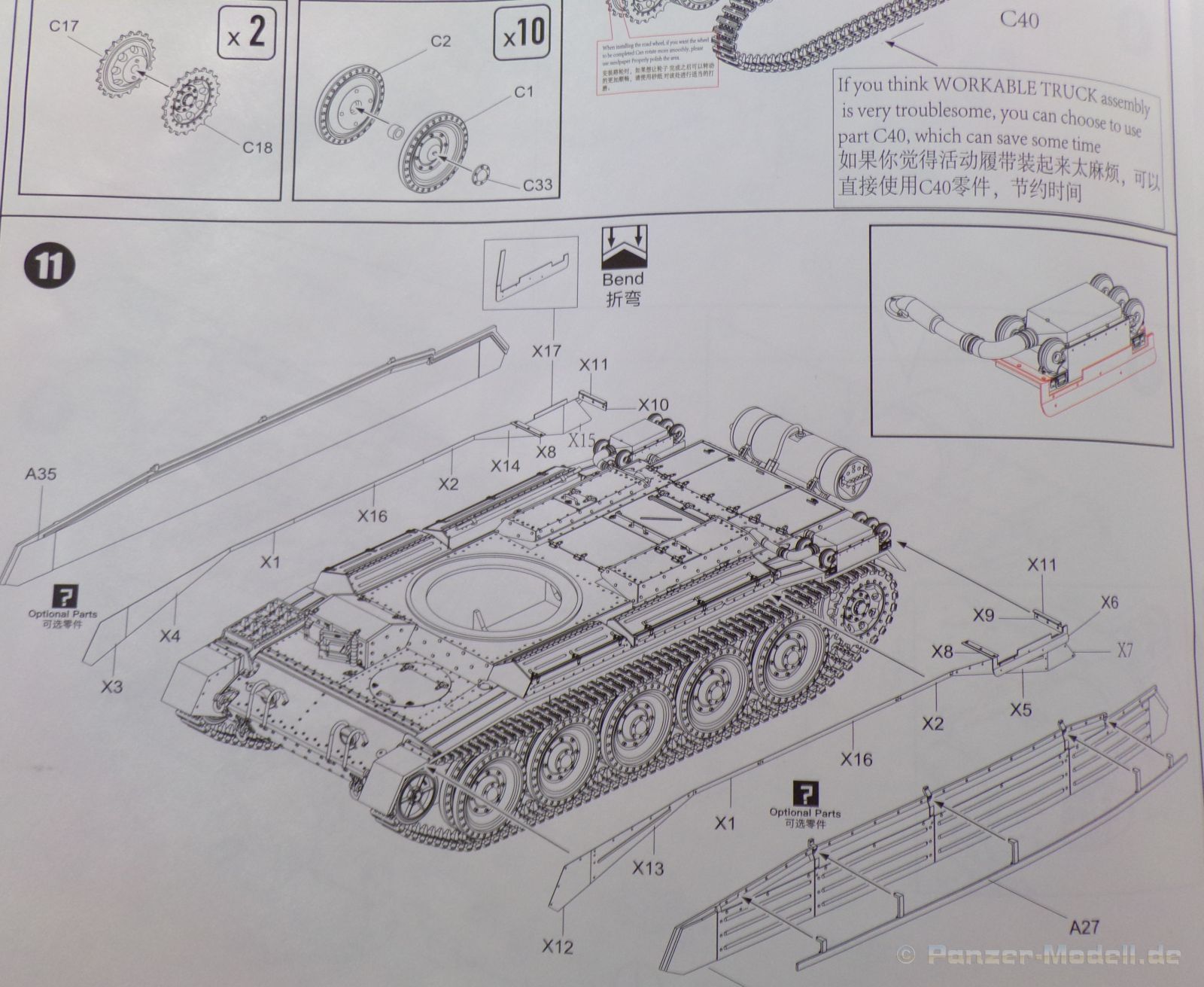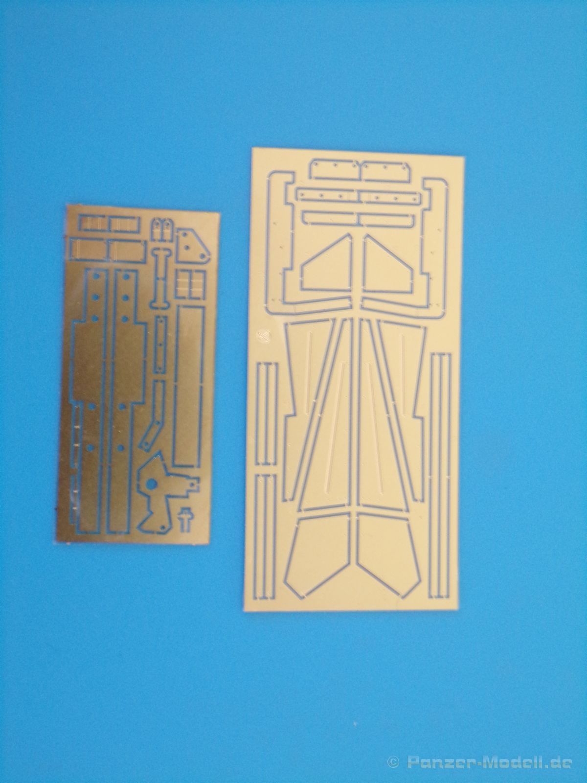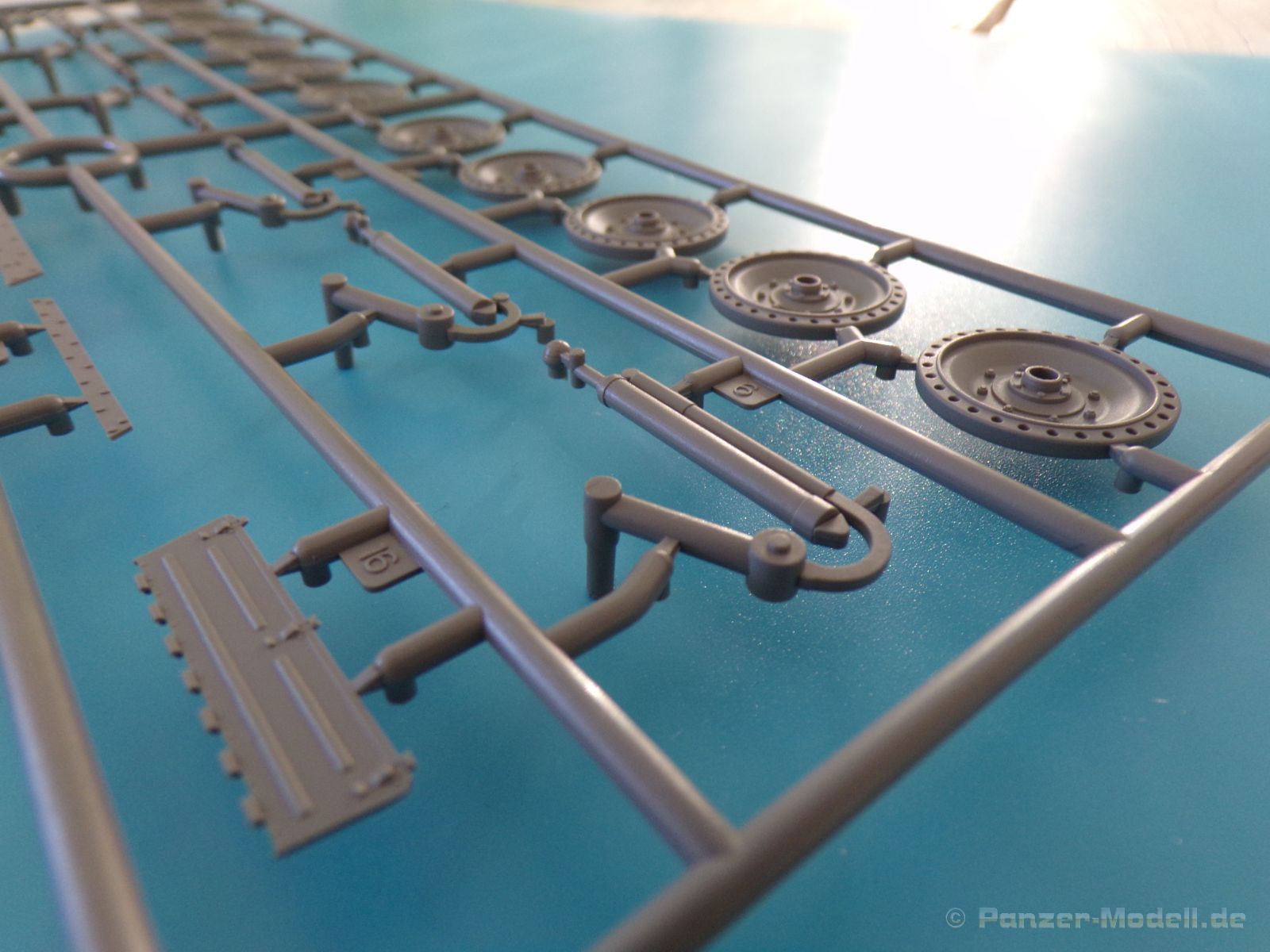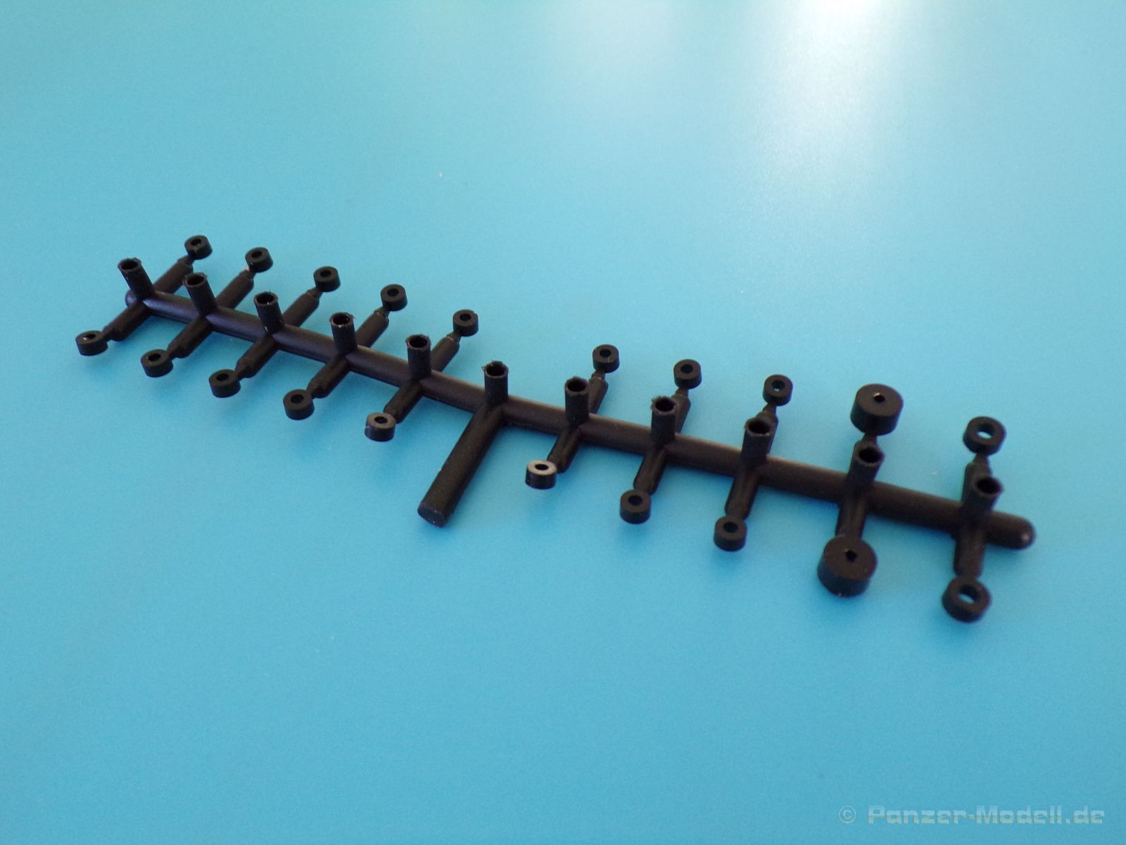 Jedes einzelne Kettenglied wird mit dem nächsten Kettenglied mit je zwei Bolzen verbunden. Für jede Seite werden 117 Kettenglieder benötigt, somit macht der Kettenbau einen Großteil der Arbeit an diesem Bausatz aus. Es sei denn man spart sich etwas Arbeit, in dem man auf das bewegliche Laufwerk verzichtet. Für diesen Fall lieht bereits ein etwas längeres Kettensegment bei, welches aus 34 bereits verbunden Kettengliedern besteht. Auch diese macht einen sehr schönen Eindruck.