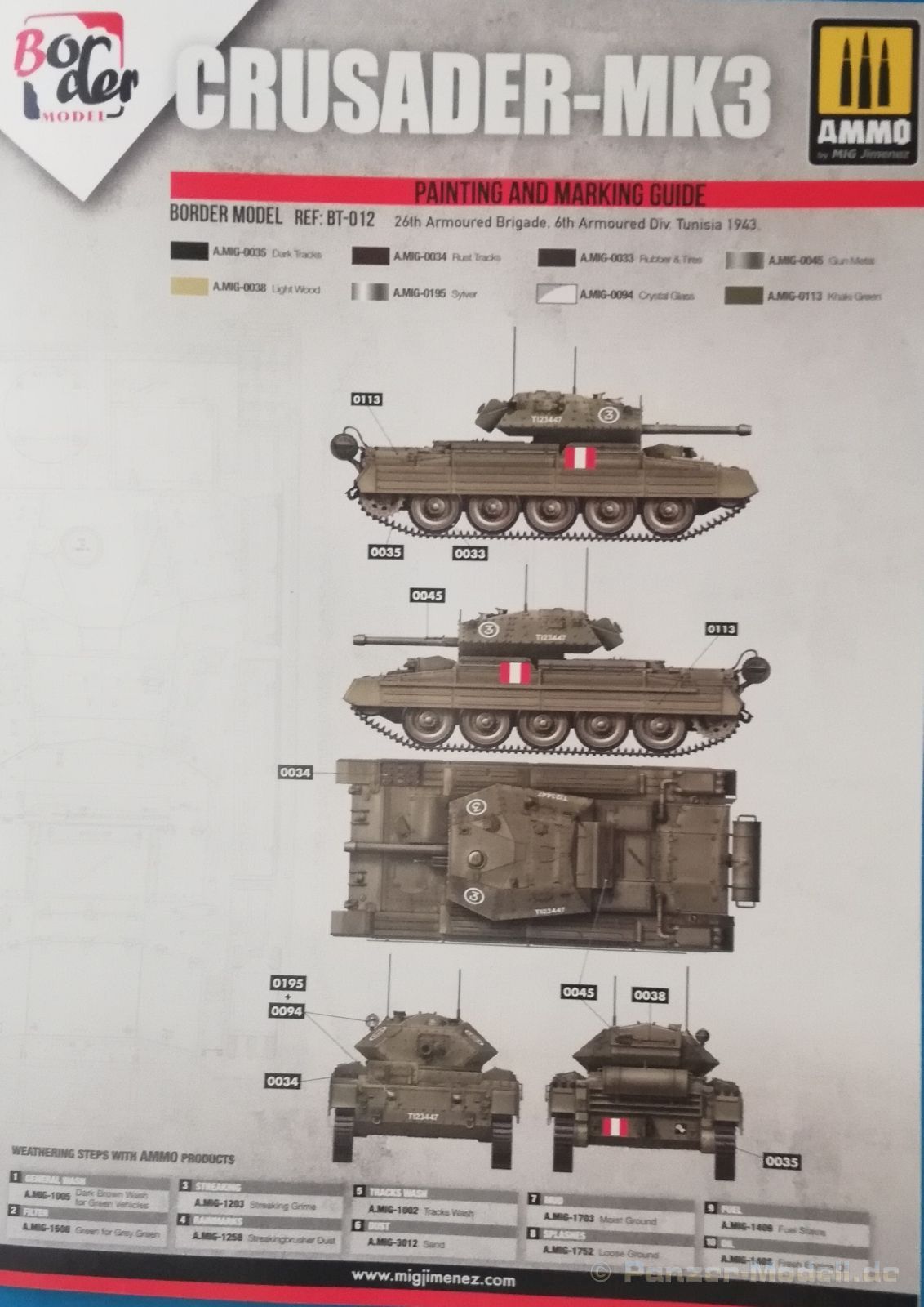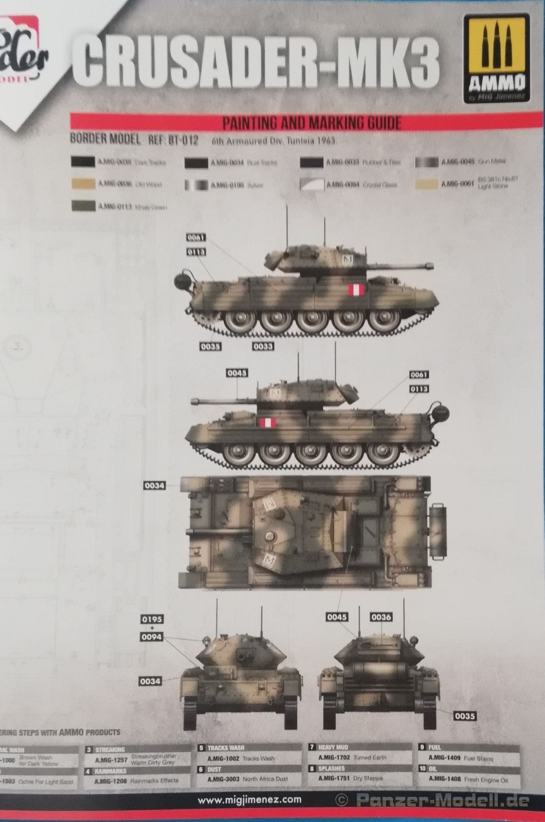Die Farbangaben beziehen sich leider nur auf die Farben und Alterungsmittel von Ammo by Mig., da der spanische Hersteller hier die Recherche betrieben hat.
