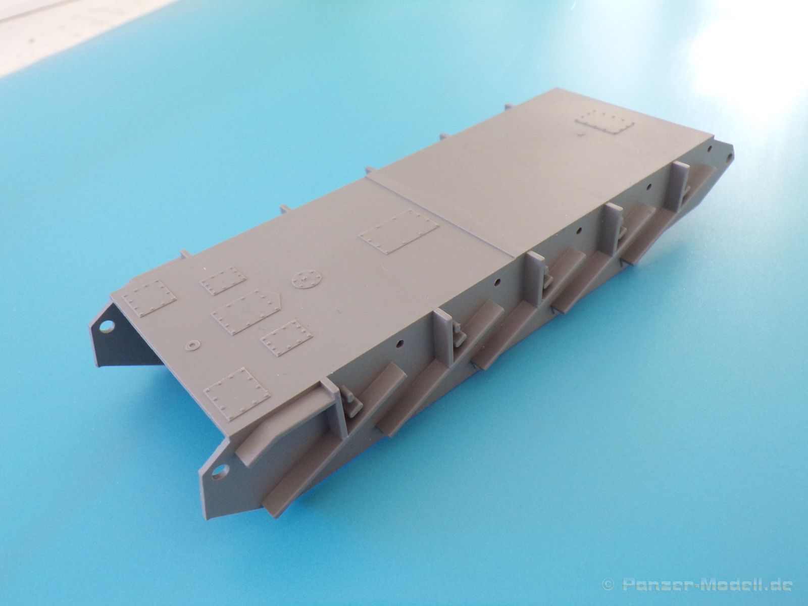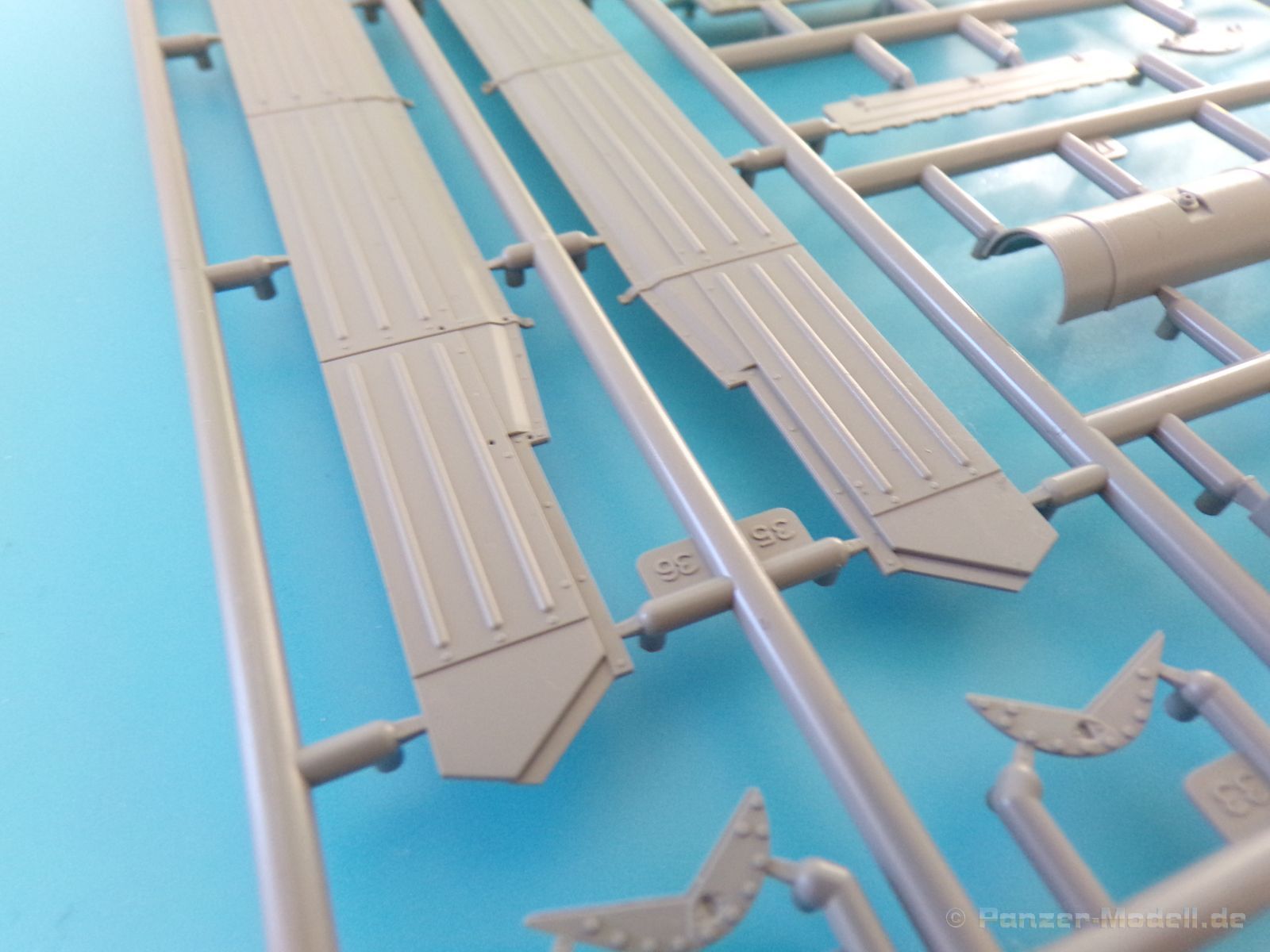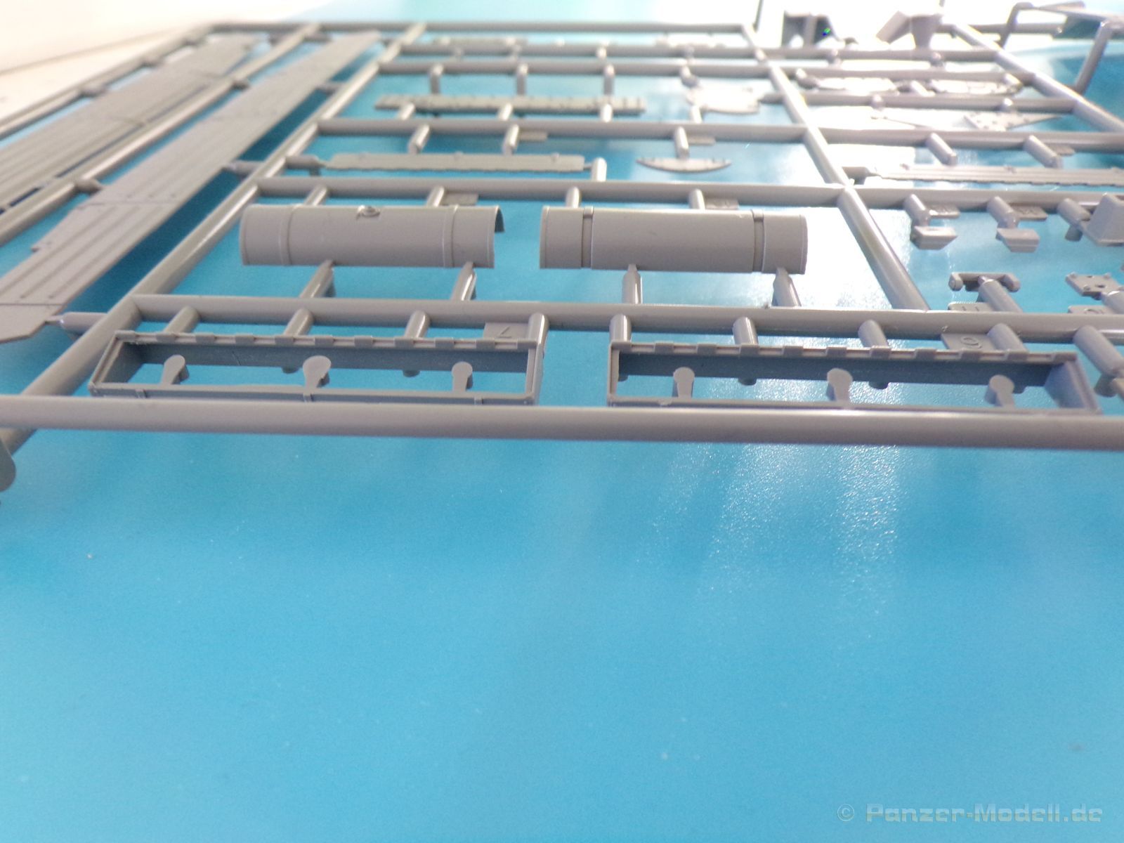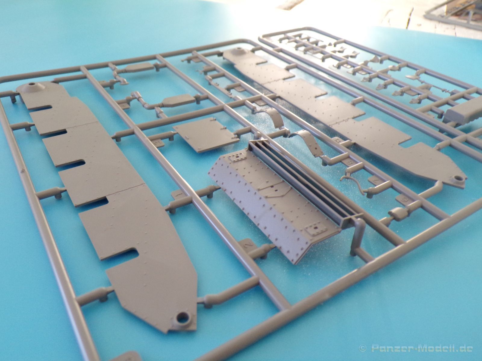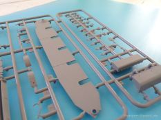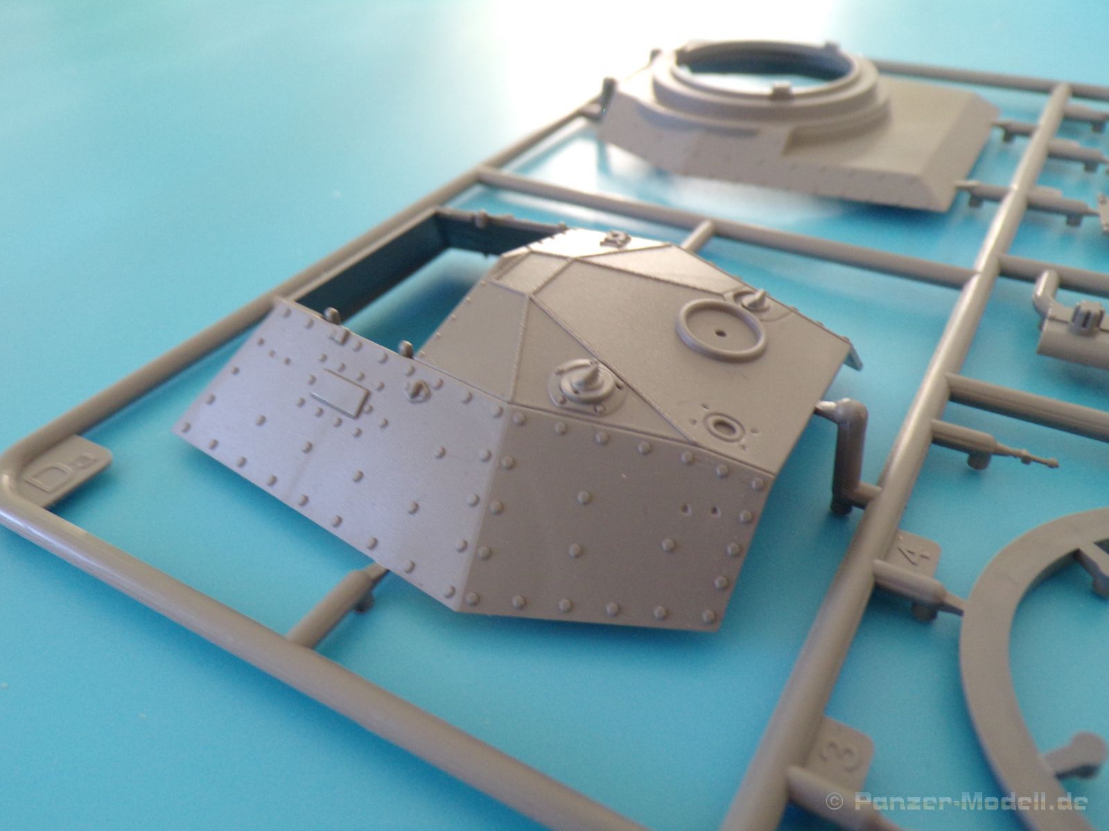 Die Detaillierung am gesamten Bausatz bewegt sich auf sehr hohem Niveau. An Ober-, Unterwanne und Turm sind richtig gut gestaltete Nietenreihen nachgebildet, auch die unterschiedlichen Größen wurden berücksichtigt. Auch die Gravur der Oberflächendetails überzeugt allerdings sollte man bei der Lackierung vorsichtig sein, damit die feinen Senknieten nicht durch zu viel Farbe aufgefüllt werden. Alle Luken an Turm und Wanne können geöffnet oder geschlossen dargestellt werden, sehr praktisch, wenn man plant den Panzer mit Figuren und Ausrüstung beladen darzustellen. Wenn man allerdings auf eine Inneneinrichtung gehofft hat, wird man enttäuscht, diese ist (bis auf den Verschluss der Kanone) leider nicht vorhanden. Das heißt auch keine Motornachbildung, so ist das Öffnen der Motorraunklappe obsolet. Dafür kann der Bausatz mit vielen schönen Außendetails, wie zum Beispiel der Auspuffanlagen, dem sehr schön gestaltetem Bug und dem schönen Heck mit Zusatztank glänzen.
