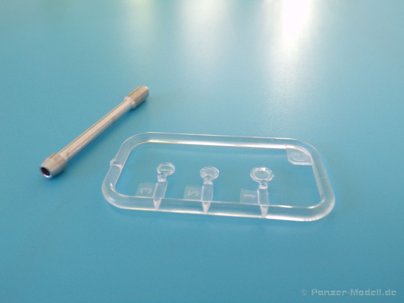 Die Konstruktion der Kanone ist ansonsten sehr gut. Diese ist sehr schön im Slide-Mould Verfahren einteilig gespritzt, mit (wie bereits erwähnt) zwei verschiedenen Mündungsbremsen. Auch bleibt diese durch eine geschickte Verklebung in der Höhe beweglich. Das beiliegende Metallrohr bietet nur die Option mit der etwas größeren Mündungsbremse. Natürlich soll nicht unerwähnt bleben, dass das koaxiale Maschinengewehr an der Mündung ebenfalls offen dargestellt ist.