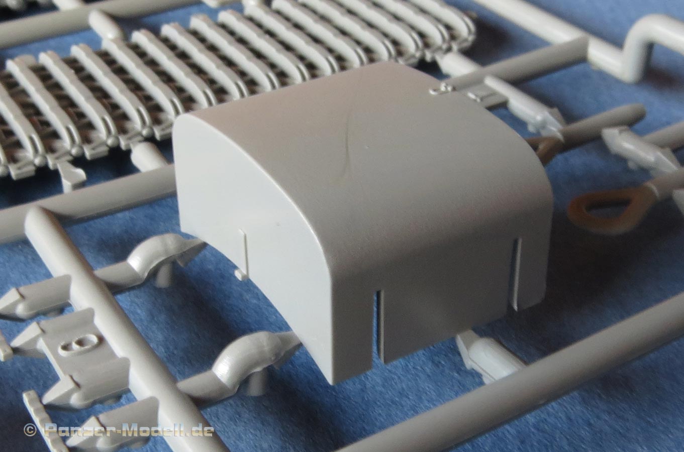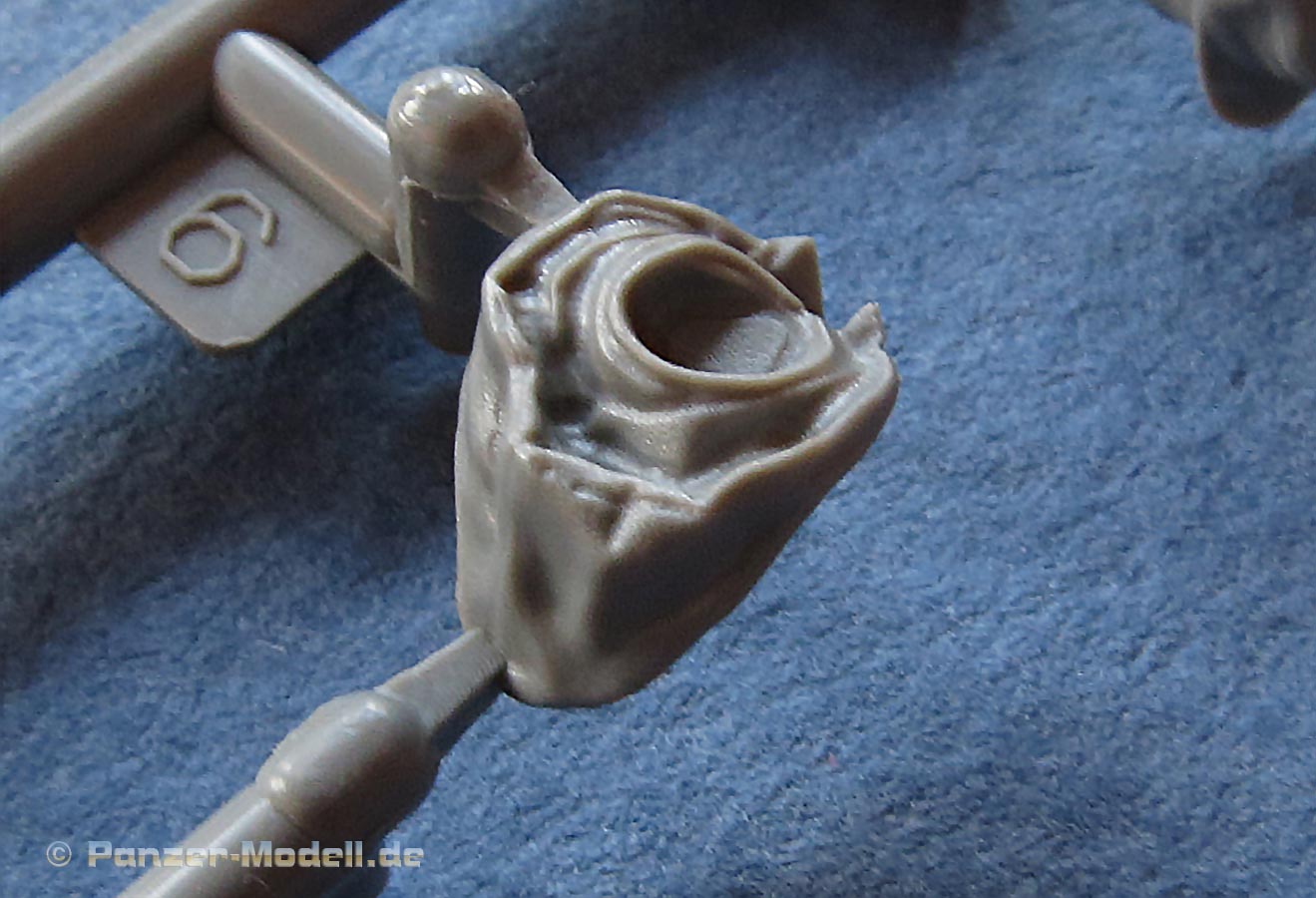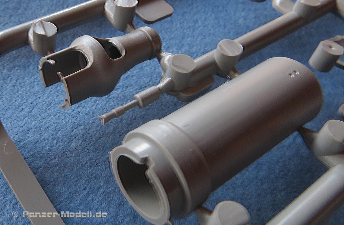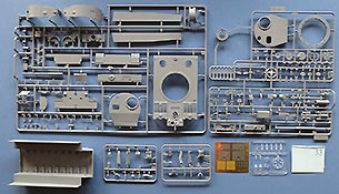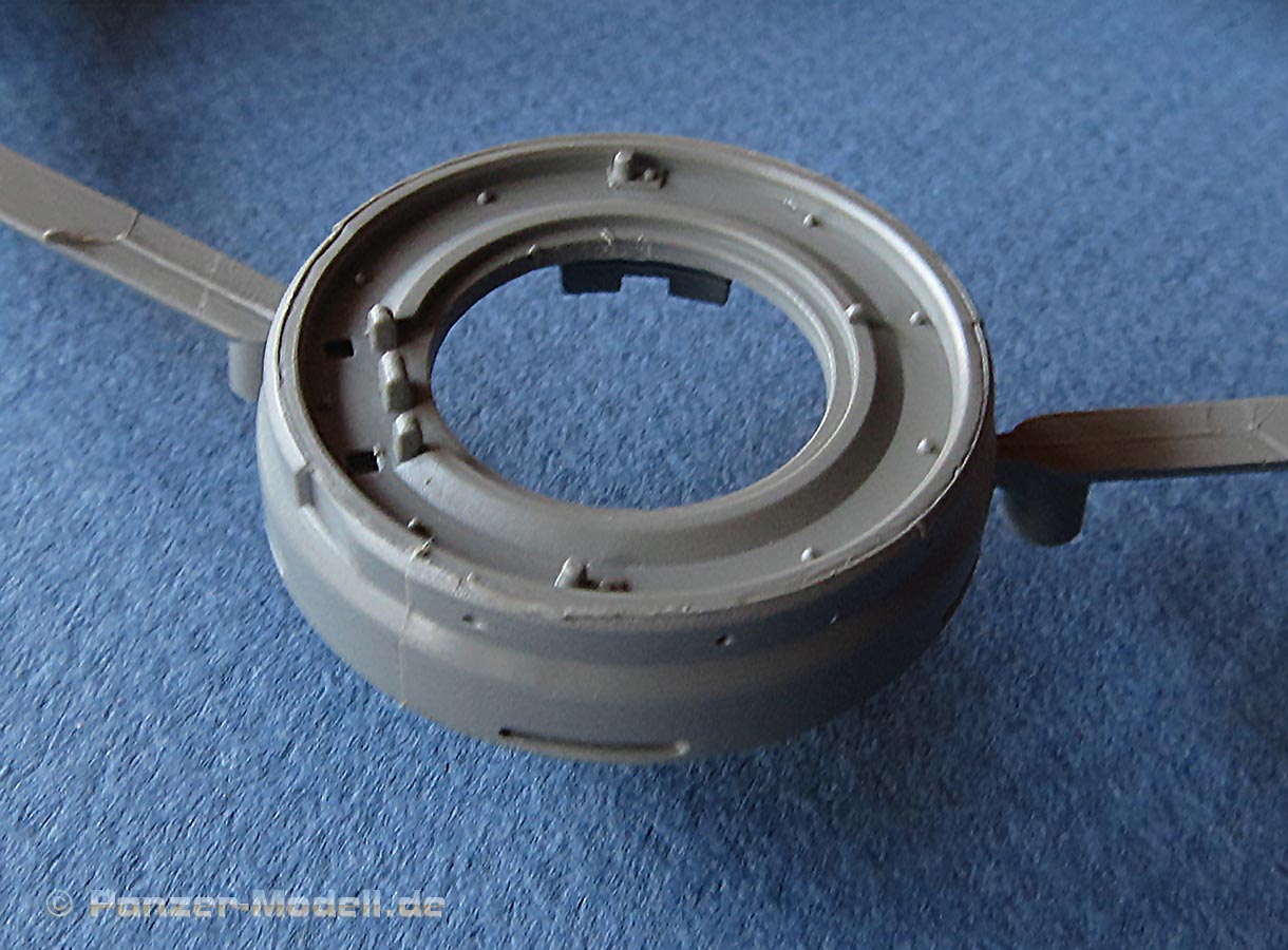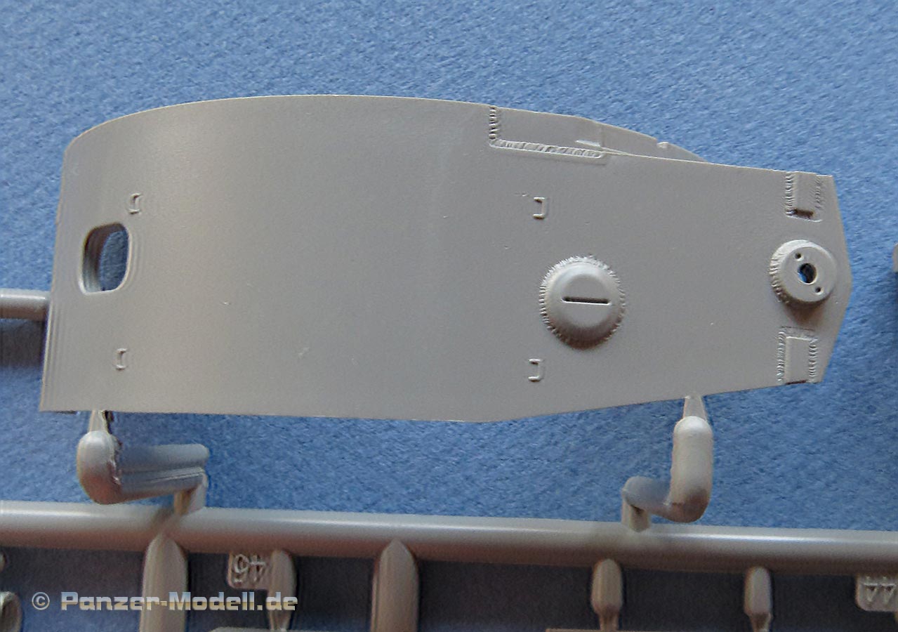Kommen wir zum Turm - dieser macht ebenfalls einen exzellenten Eindruck in Formgebung und Details. Auch hier feinste Schweißnahtdetails und Bolzenköpfe. Die Komamndantenkuppel ist vom frühen Typ und einteilig gespritzt. Diese wird mit Anbauteilen und Lukendeckel vervollständigt. Die Kanonenblende ist einteilig und schön detailliert dargestellt. Das Kanonenrohr ist einteilig aus Plastik (UND in der ersten Ausgabe des Bausatzes auch als schönes Metaillrohr beigelegt) und auch die Mündungsbremse ist zwar nicht einteilig, aber wenigstens nicht, wie sonst häufig, in zwei Längshälften geteilt. Daumen hoch dafür.