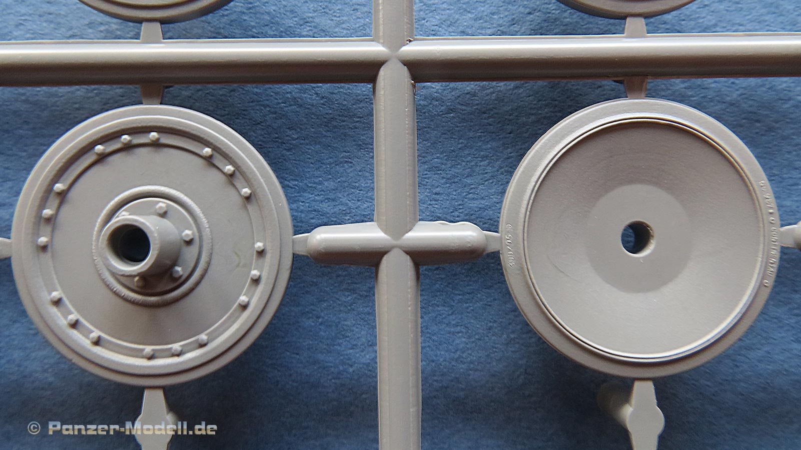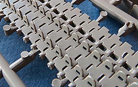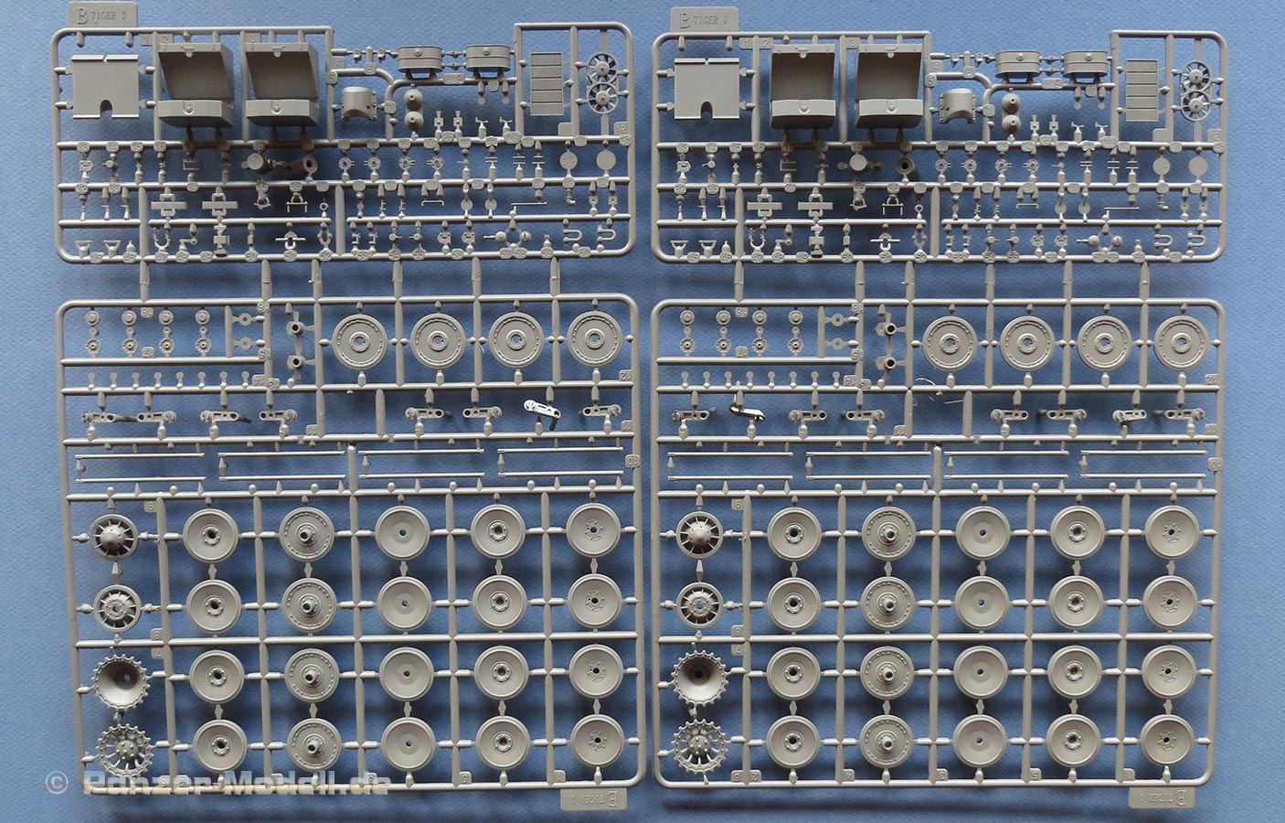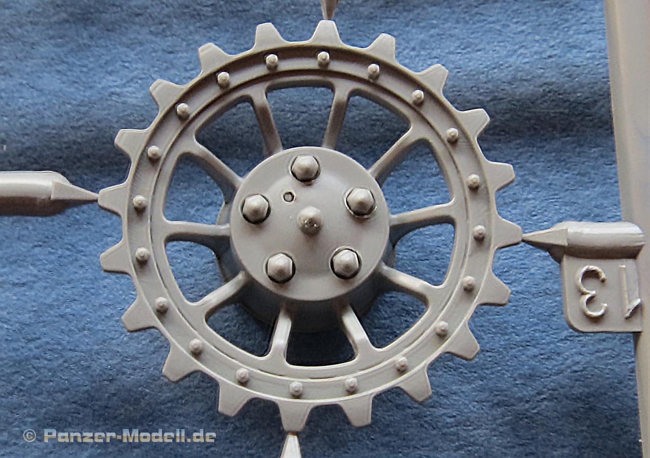 Die Laufrollen sind mit das Beste, was ich in den letzten Jahren an Tiger Laufrollen gesehen habe. Feine Ausführung der verschiedenen Rollentypen mit ihrem spezifischen Aussehen und extrem feine und realistische Herstelleraufdrucke auf den Gummibandagen, das ist richtig geil! Sehr gut empfinde ich auch, dass Border hier für alle äusseren Radstationen auch den entsprechenden Montagering als Optionsteil beigelegt hat um abgenommene äußere Laufrollen darzustellen! Wie gerade schon erwähnt, liegen die Ketten hier als Segmentketten bei - dies hat sich in den vergangenen Jahren zum Standard gemausert, da diese Art Ketten auch von Anfängern gut zu beherrschen ist und dazu einen schnellen Bau bei hervorragender Detaillierung. Aber Achtung: wir haben es hier mit zwei verschiedenen Kettentypen zu tun. Einmal den normalen Tiger I Ketten und den für rechts und links spiegelbuildlichen, die nur auf den allerersten Tigern verwendet wurden. Bei dem einen Kettentyp Einzelgliedern muss man leider die zwei Kettenzähne je Glied noch einzeln aufkleben, was doch wieder einiges an sorgsamer Arbeit erfordert, bei dem anderen Kettentyp sind die Zähne bereits mit angegossen. An den langen Segmenten higegen ist bereits alles komplett mit angespritzt - dafür finden sich hier leider auf den Innenseiten Auswerfermarken. Ärgerlich, aber wenn ich das Schachtellaufwerk des Tigers ansehe, denke ich, dass man diesen Bereich der Kette eh nicht sehen wird - also halb so wild.