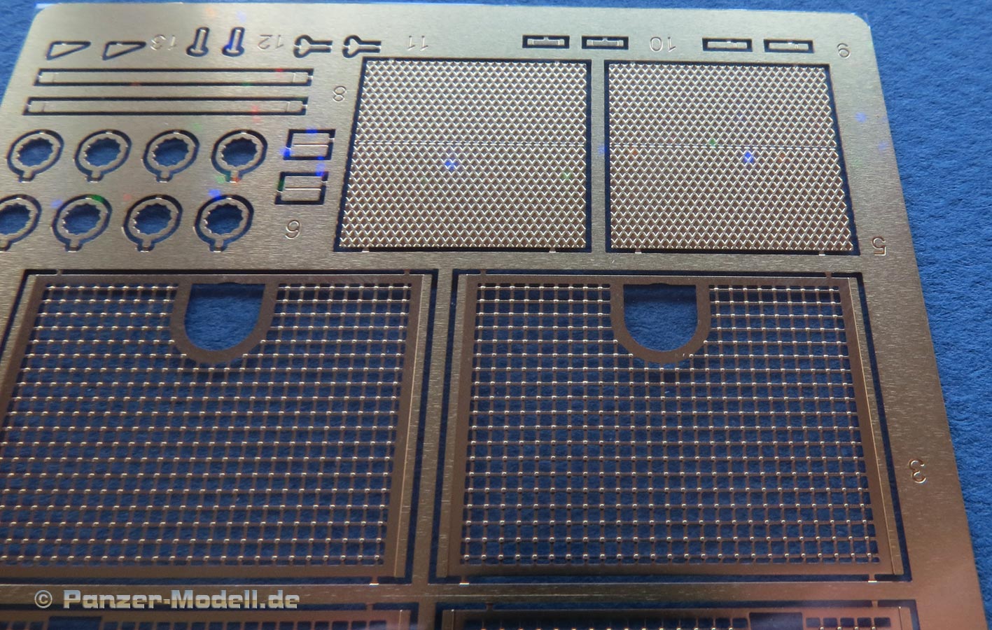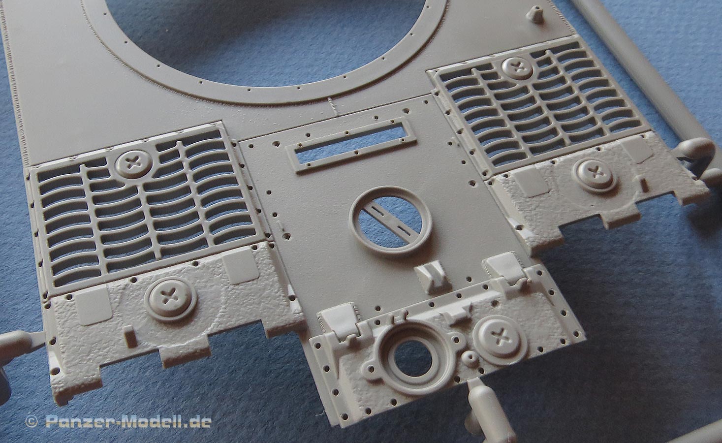 Die Unterwanne ist im Prinzip einteilig, aber dann irgenwie auch doch nicht, denn Heckwand sowie Glacis-, Fahrerfront- und Deckplatte müssen einzeln eingeklebt werden und die Seitenwände werden durch zwei aufzuklebende Bauteile erst komplettiert. Das Ganze dürfte dann recht herausfordernd sein in allen Kontakt und Nahtstellen sauber und spaltenfrei hinzubekommen. Die Detaillierung der Teile hingegen ist wirklich toll - fein gravierte Schnittkanten und superfein strukturierte Schweißnähte, das ist wirklich "eyecandy". In der Deckplatte sind die Luken für Fahrer und Funker, sowie die hinteren Lüftergrätings offen oder geschlossen baubar. Die Grätings werden dann noch von den beiliegenden extrem feinen PE Gittern abgedeckt - diese sind wirklich hauchdünn und filigran - das sind mit die besten Gitter die ich bisher gesehen habe.