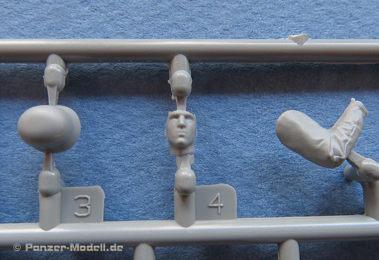 Löblich erwähnen muss man hier dass Border auch bei diesem Bausatz wieder Figuren beigelegt hat, was bei anderen Herstellern oft kein Usus ist. Diese beiden Kameraden (Panzerbesatzung und Infanterist) setzen sich aus den üblichen Bauteilen zusammen und weisen eine sehr schöne Gestaltung der Uniformen auf mit feinen Details und realistischem Faltenwurf. Die Gesichter sind für Spritzguss gut und sauber gemacht.