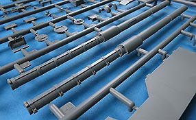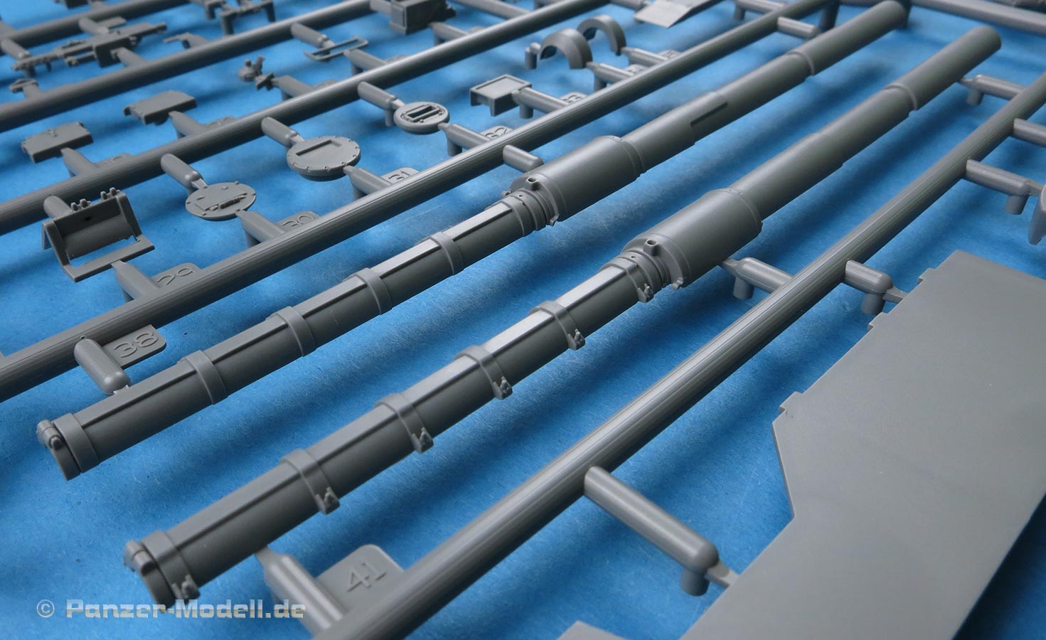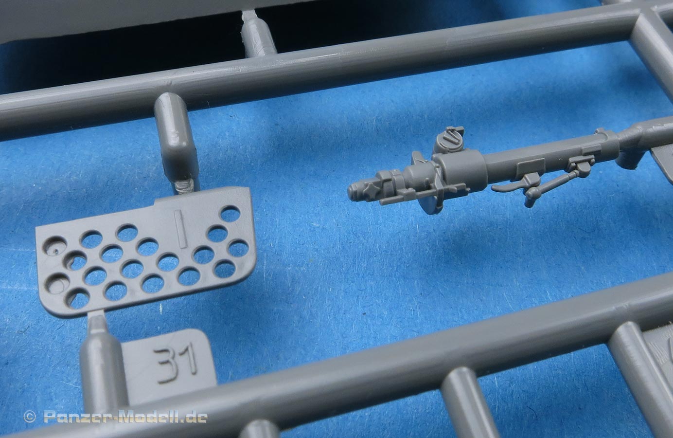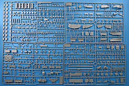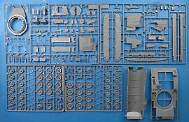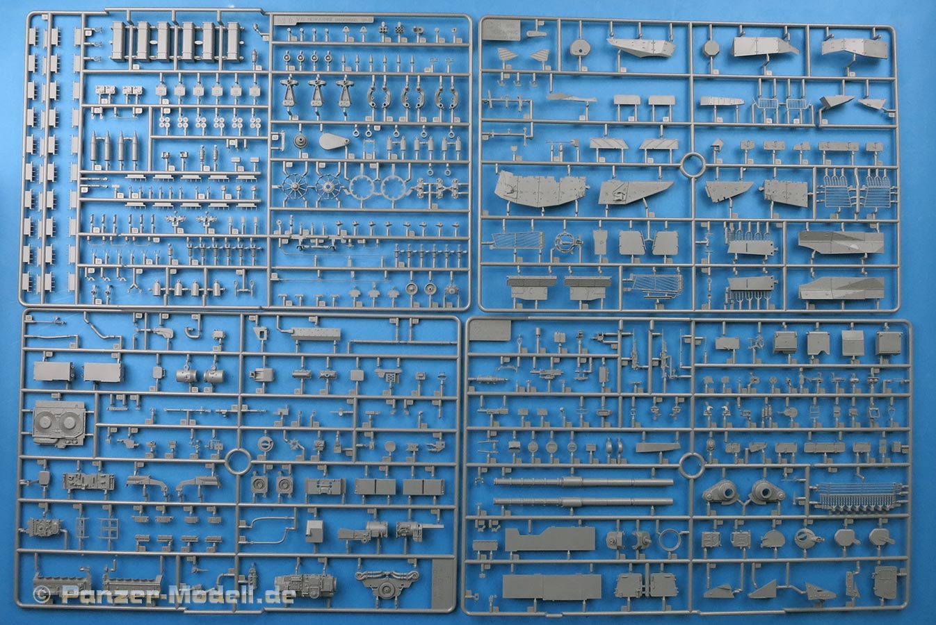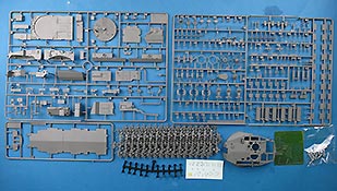 11 graue Spritzlinge, eine separate Unterwanne, Oberwanne, das Turmoberteil, 15 Streifen Kettenspritzlinge, eine Ätzteilplatine, Polycaps, 8 Metallfedern und ein Decalbogen.