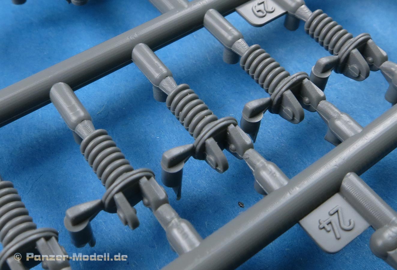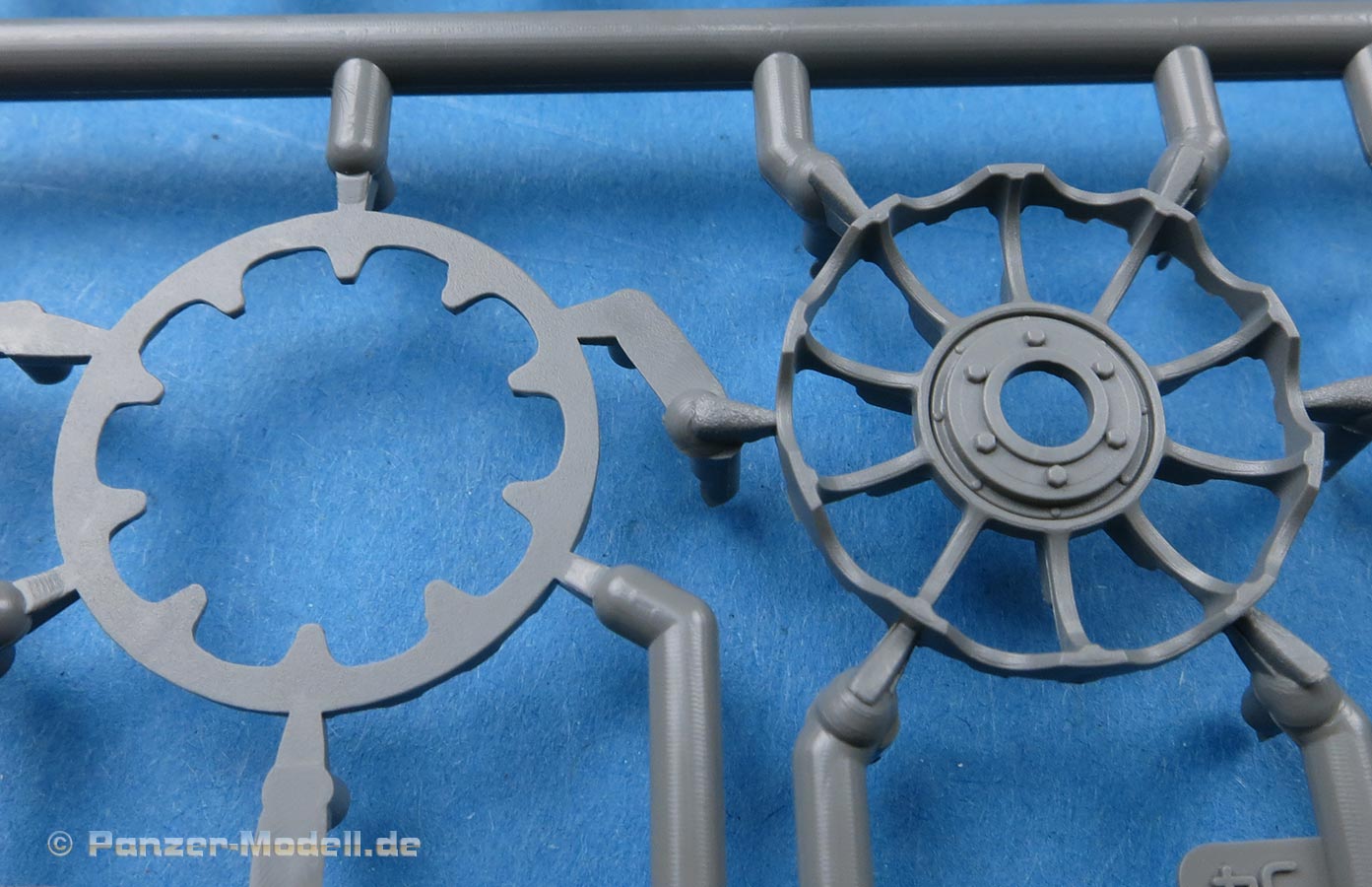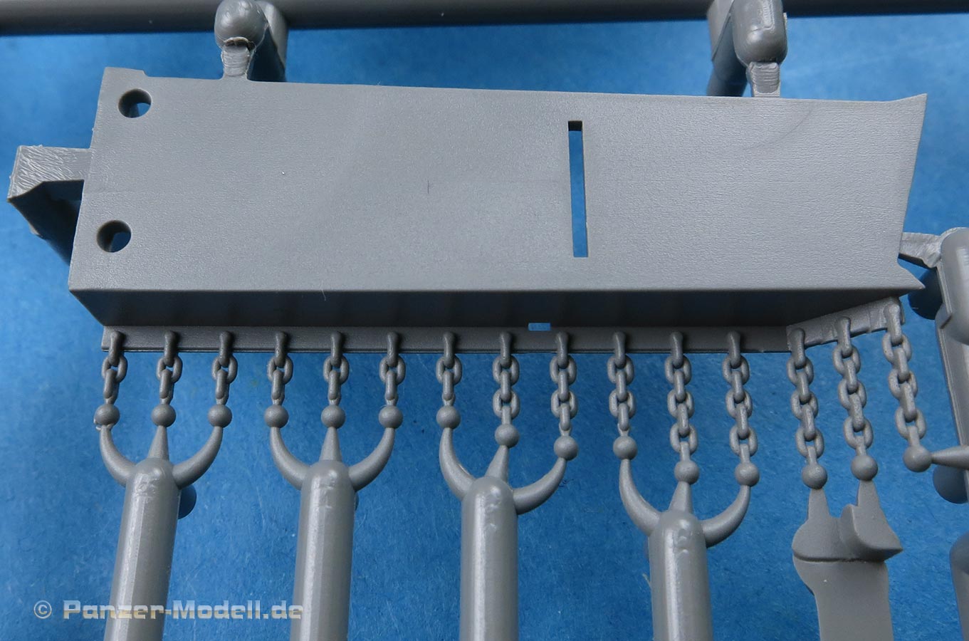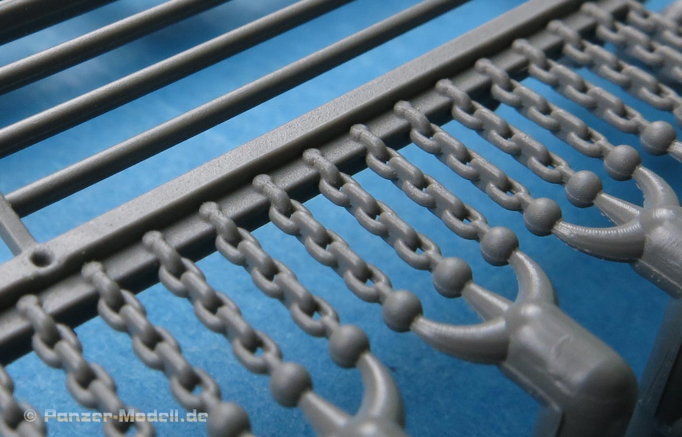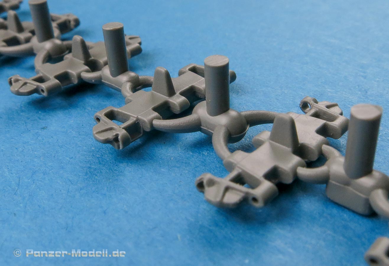 Die Ketten bauen sich zu einer beweglichen Einzelgliedkette zusammen. Die Kettenglieder sind sauber und ohen Auswerfermarken gespritzt, d.h. schöne glatte Laufflächen und fein detallierte Formung des Kettenkörpers außen. Die Kettenbolzen sind in 5er-Packs gespritzt ind genau dem richtigen Abstand um immer 5 Stück gleichzeitig in ein zusammengelegtes Kettentrum einzuführen. Diese scheinen etwas kurz zu sein, aber wenn korrekt eingeführt, halten sie die Kettenglieder gut zusammen.