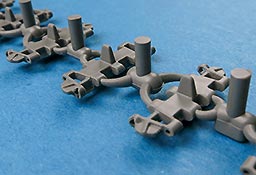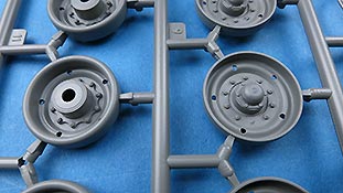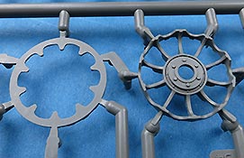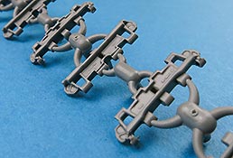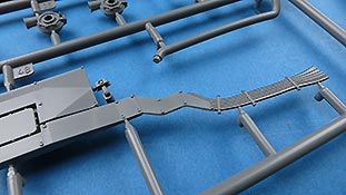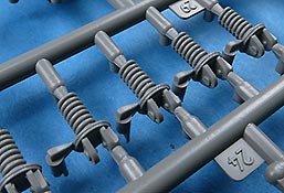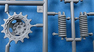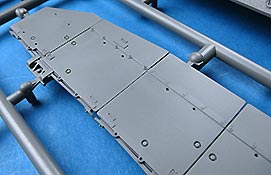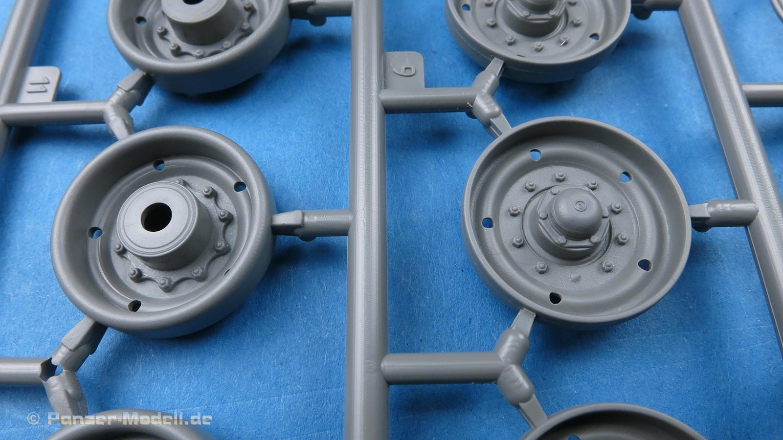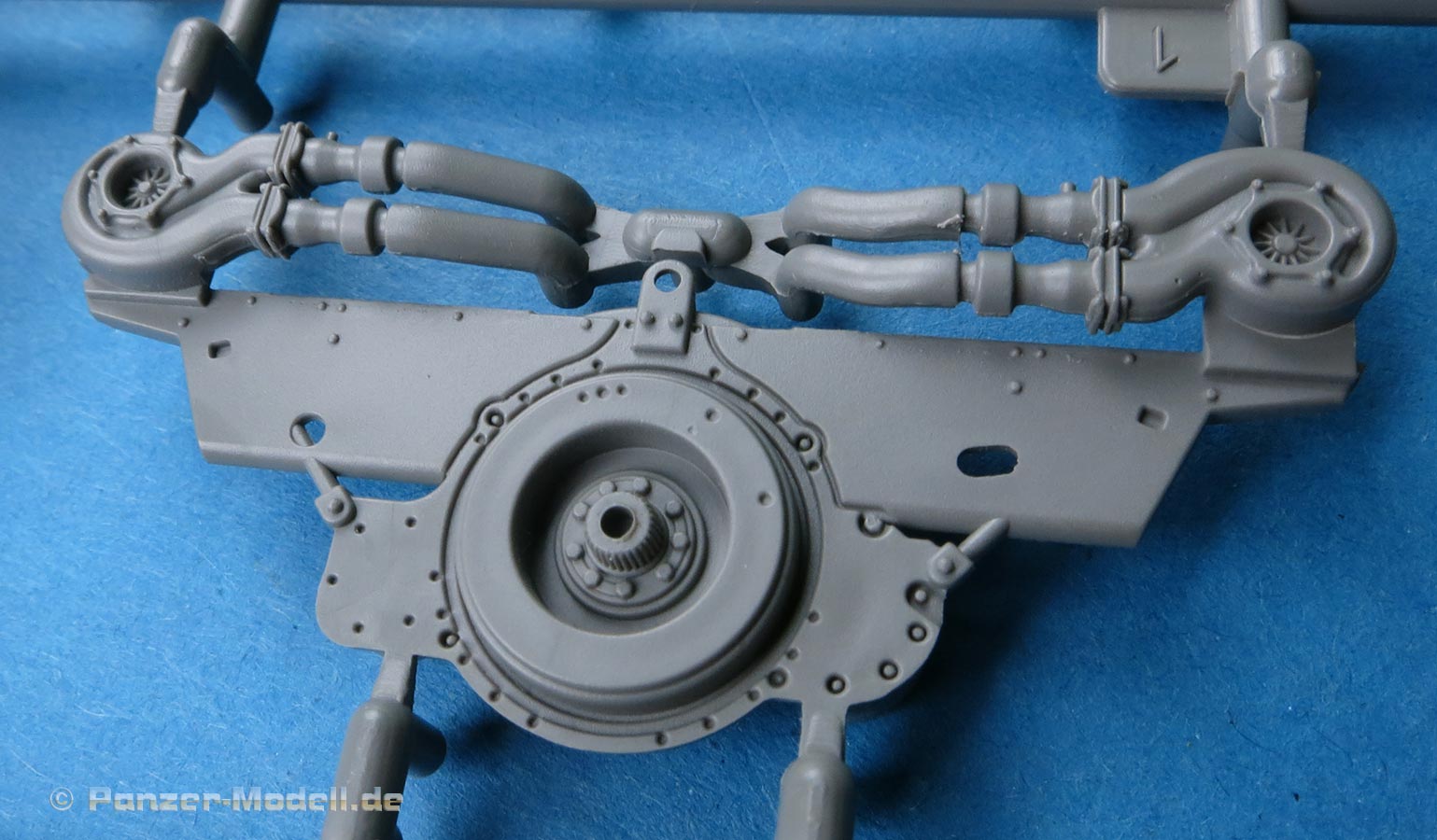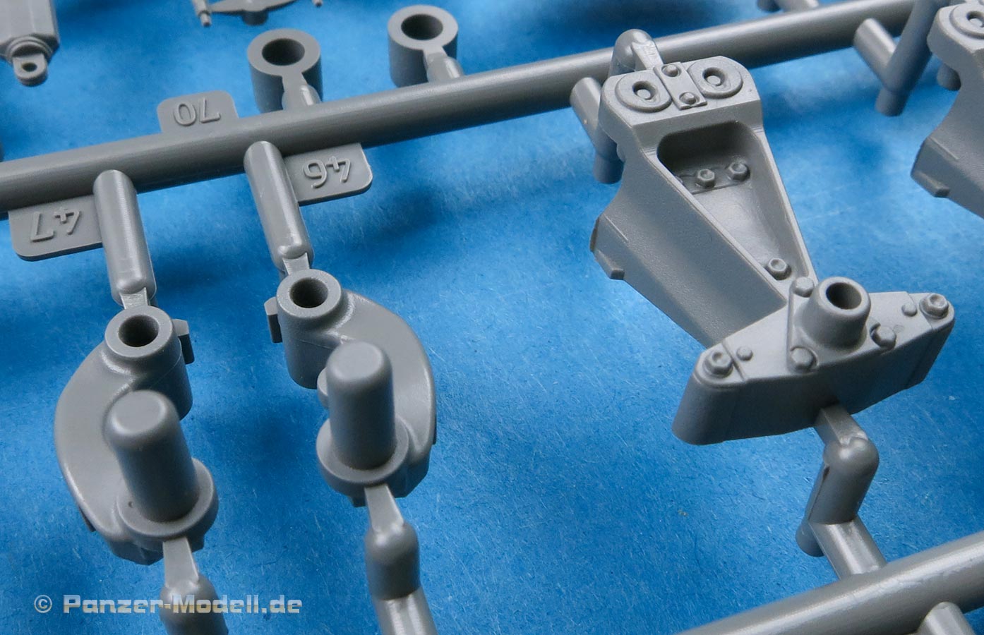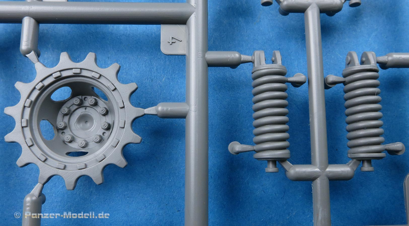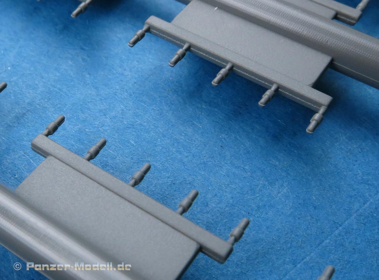Die Ketten bauen sich zu einer beweglichen Einzelgliedkette zusammen. Die Kettenglieder sind sauber und ohen Auswerfermarken gespritzt, d.h. schöne glatte Laufflächen und fein detallierte Formung des Kettenkörpers außen. Die Kettenbolzen sind in 5er-Packs gespritzt ind genau dem richtigen Abstand um immer 5 Stück gleichzeitig in ein zusammengelegtes Kettentrum einzuführen. Diese scheinen etwas kurz zu sein, aber wenn korrekt eingeführt, halten sie die Kettenglieder gut zusammen.