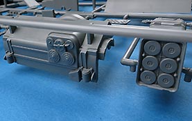 Am Heck sitzen diverse Boxen und Staukäfige - und letztere sind in Spritzguss gut widergegeben, gerade die feinen Kettchen und Kugeln (Ball and Chain), die unter diesen Staukäfigen hängen, die für Spritzguss wirklich überzeugend dargestellt sind und dem Modellbauer eine Menge Arbeit erspart.